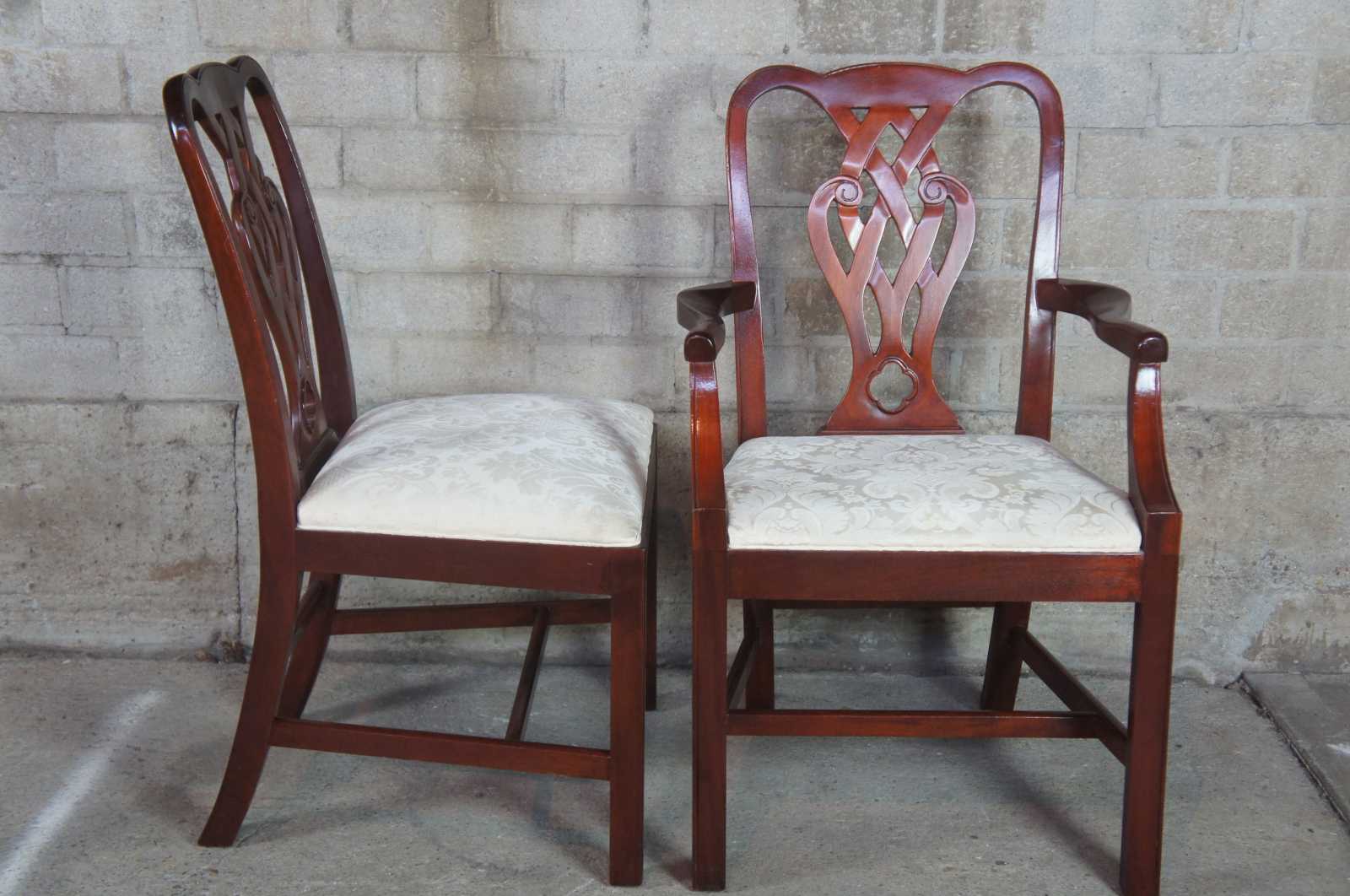 Circa 1980s Baker dining chairs. Made from mahogany with an interwoven pierced and carved back. Features a brocade upholstered white seat.