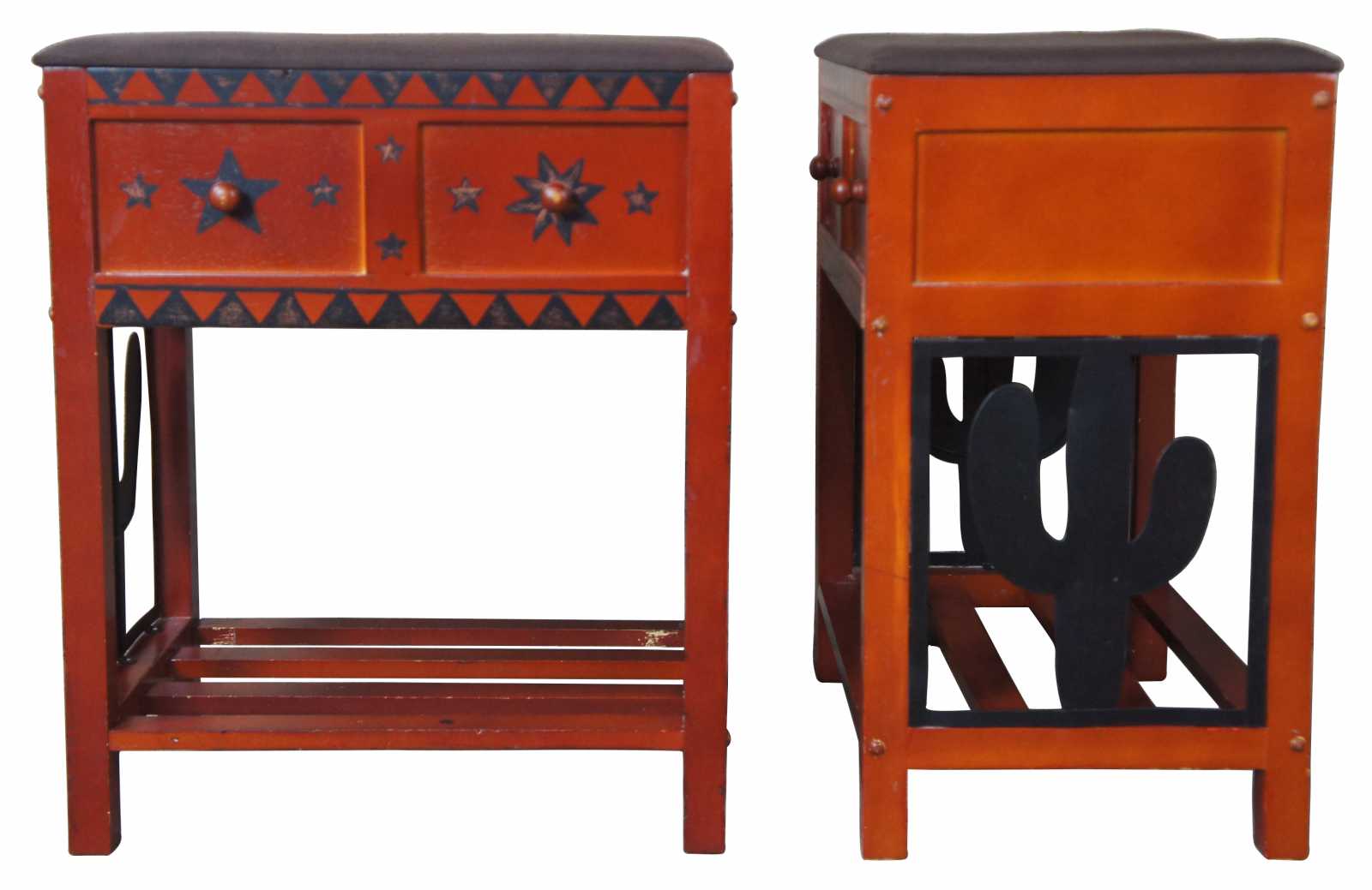 A fun multipupose Southwestern style storage bench or footstool. These stools are light weight and feature opening tops, red painted wood body with metal cactus design on sides.