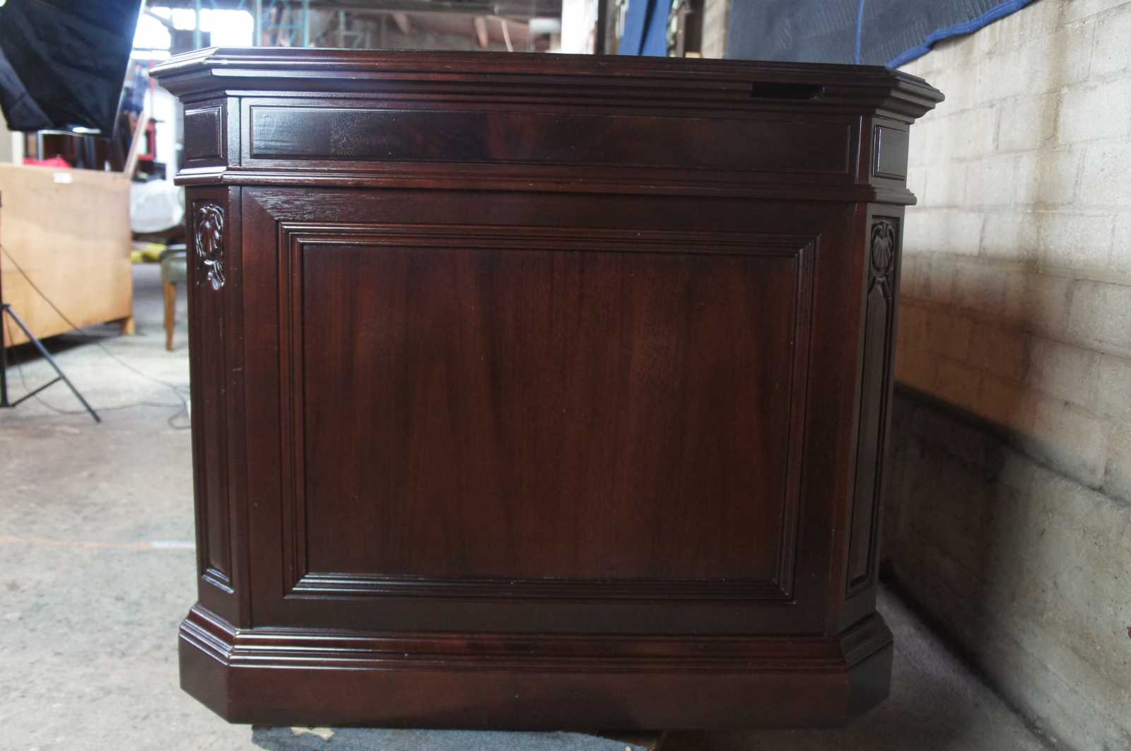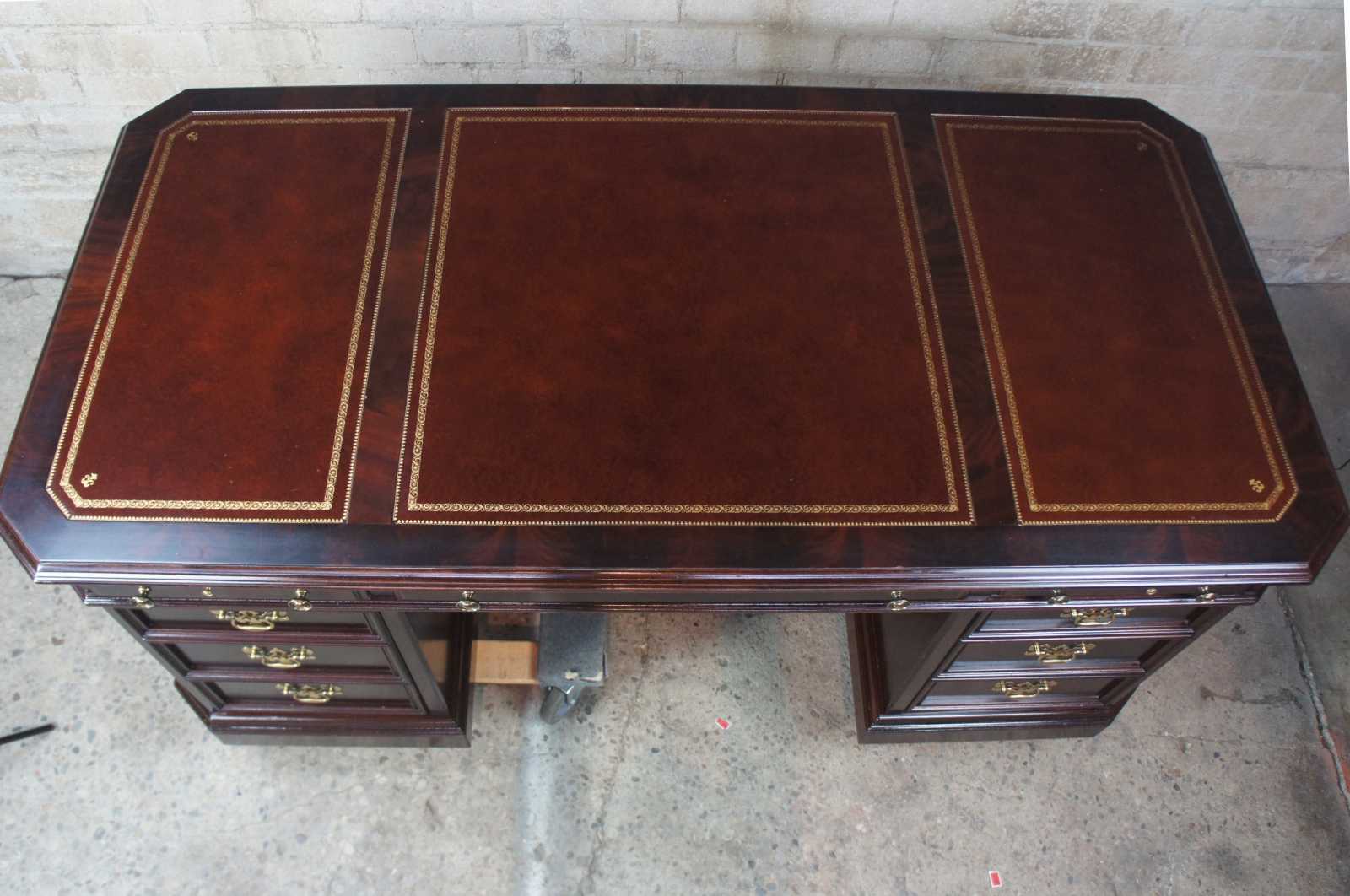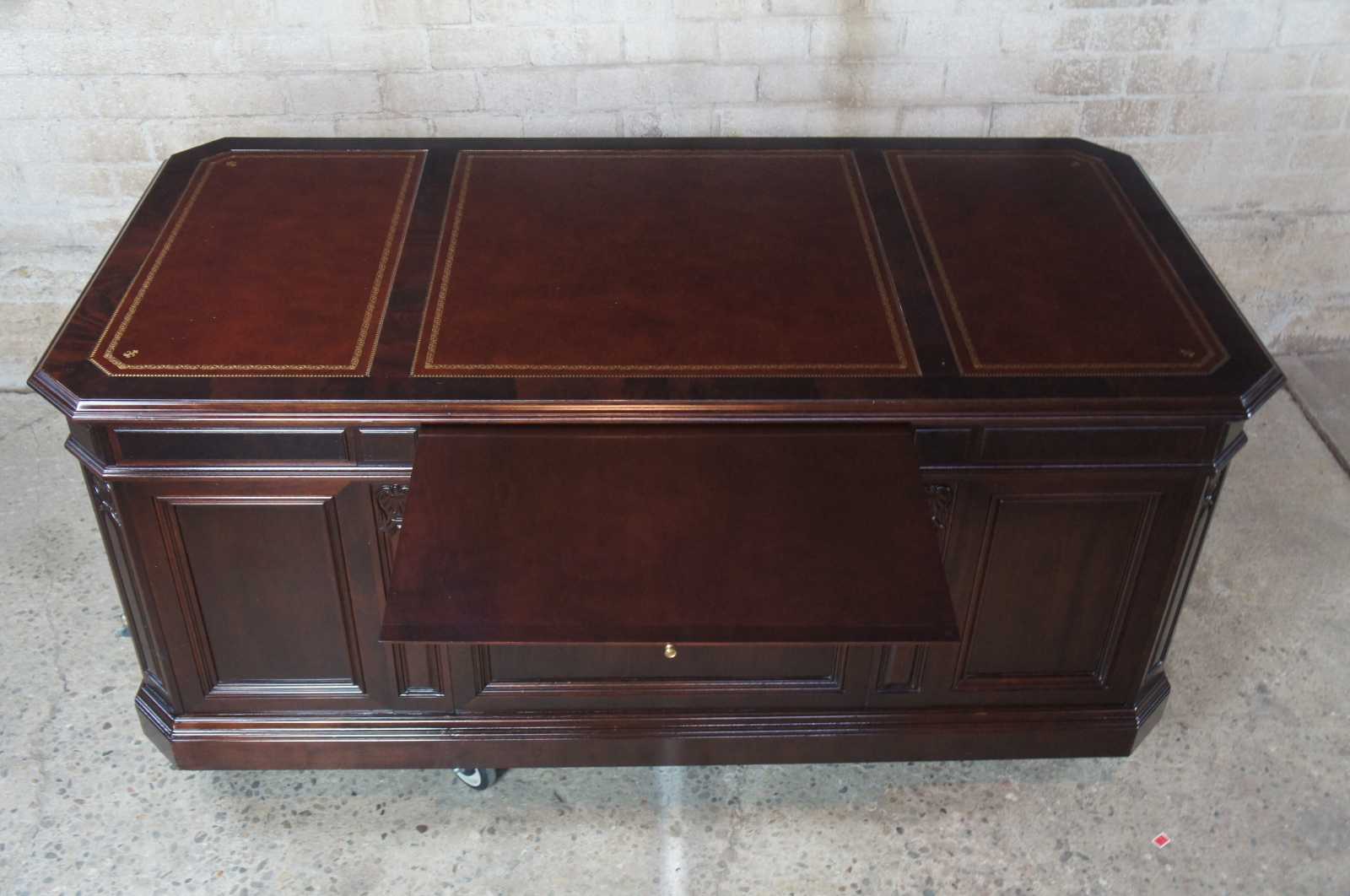 Traditional executive desk by Sligh. Made from hardwoods with flame mahogany veneer and three panel tooled leather top. Lockable with two file drawers and three pullout writing surfaces. Item # 2509-A.