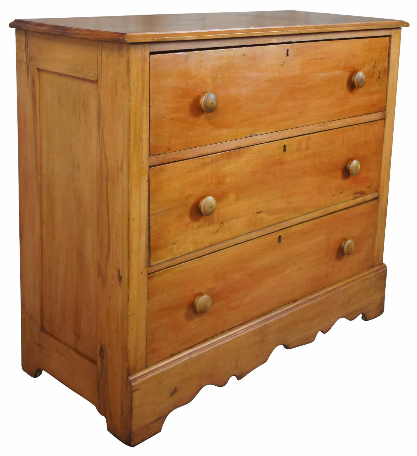 Circa 1870s-1890s pine chest of drawers. Features early american styling with curly cut lower apron. The drawers are dovetailed with a knapp joint.
