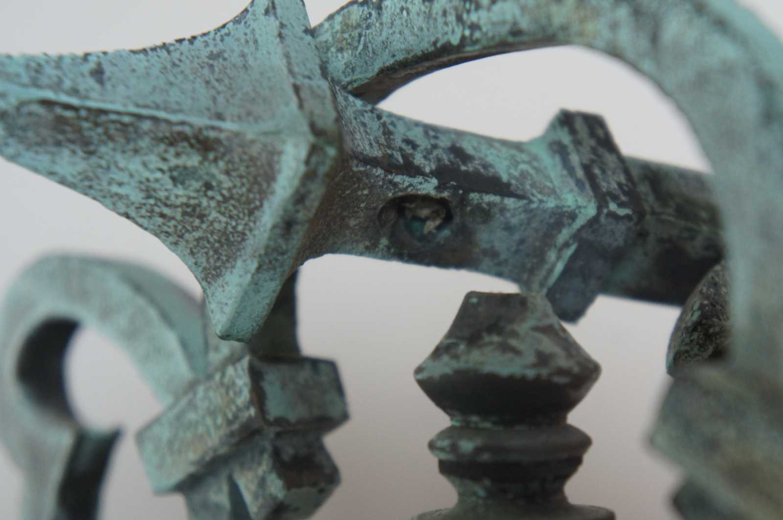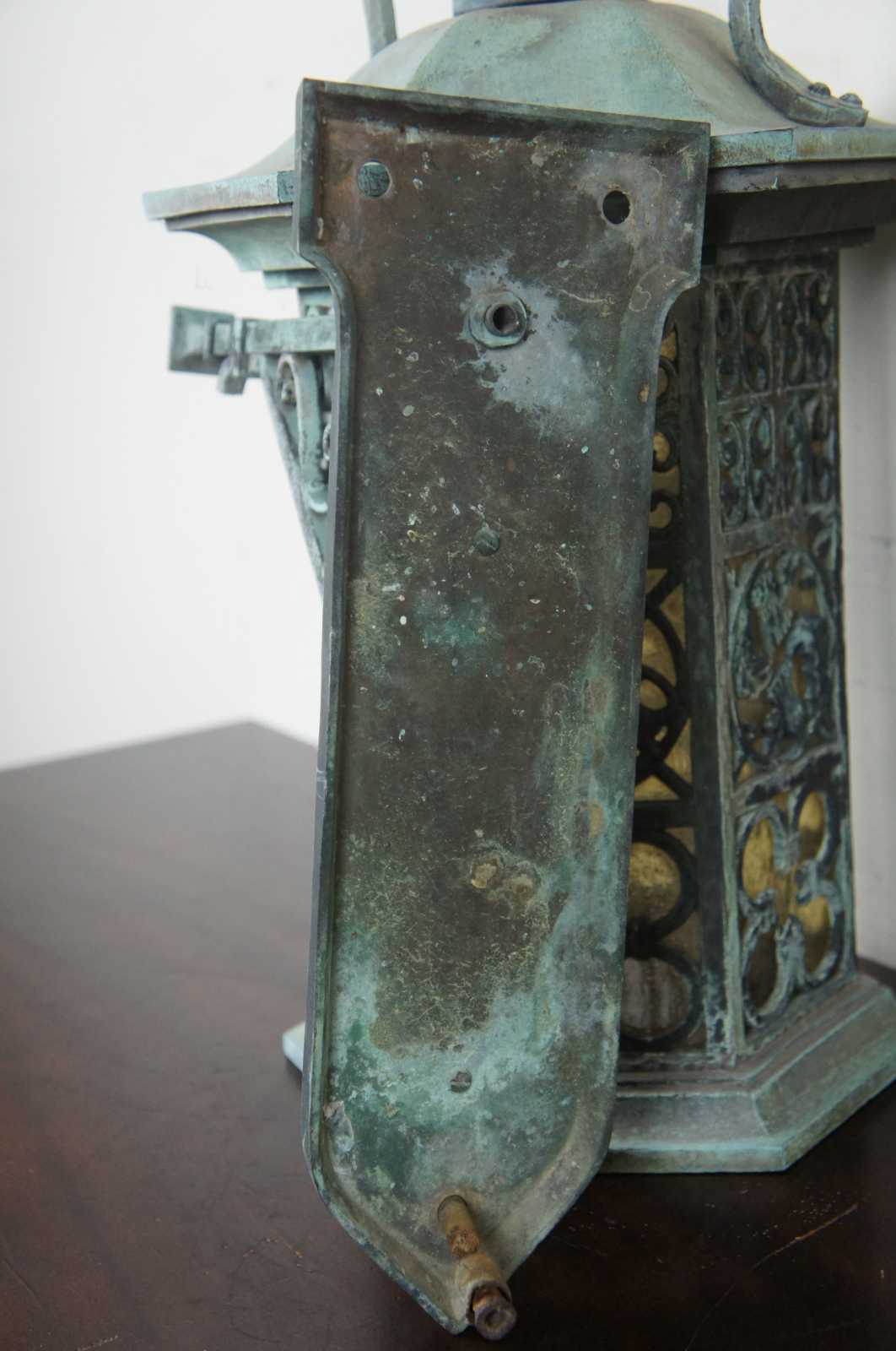 Good overall, the lantern is disconnected from the hanger, will need wiring and repair before install, no light socket; see pictures
