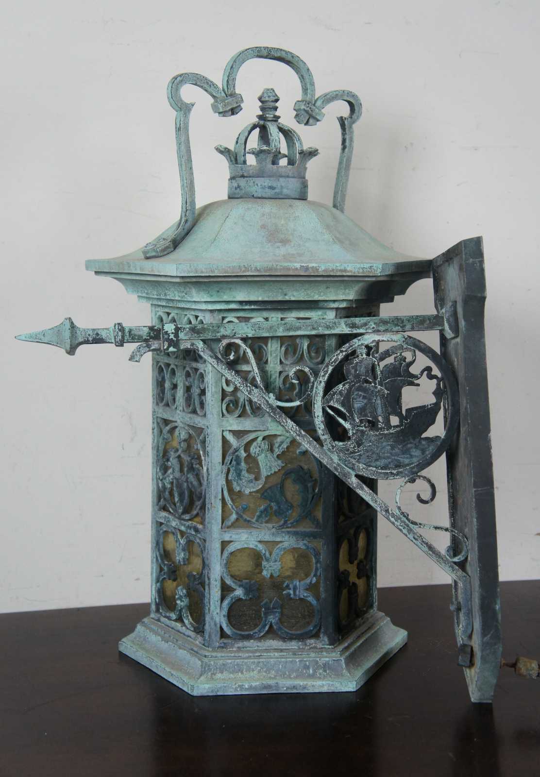 Iron lantern wall sconce. Features a nautical theme with a ship on the wall plaque / crane and heraldic coat of arms, thistles and ornate detail on the lantern. This piece comes from one of the first homes built in Oakwood, Ohio by Harry I Schenck.