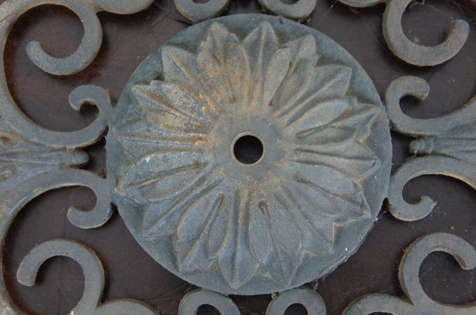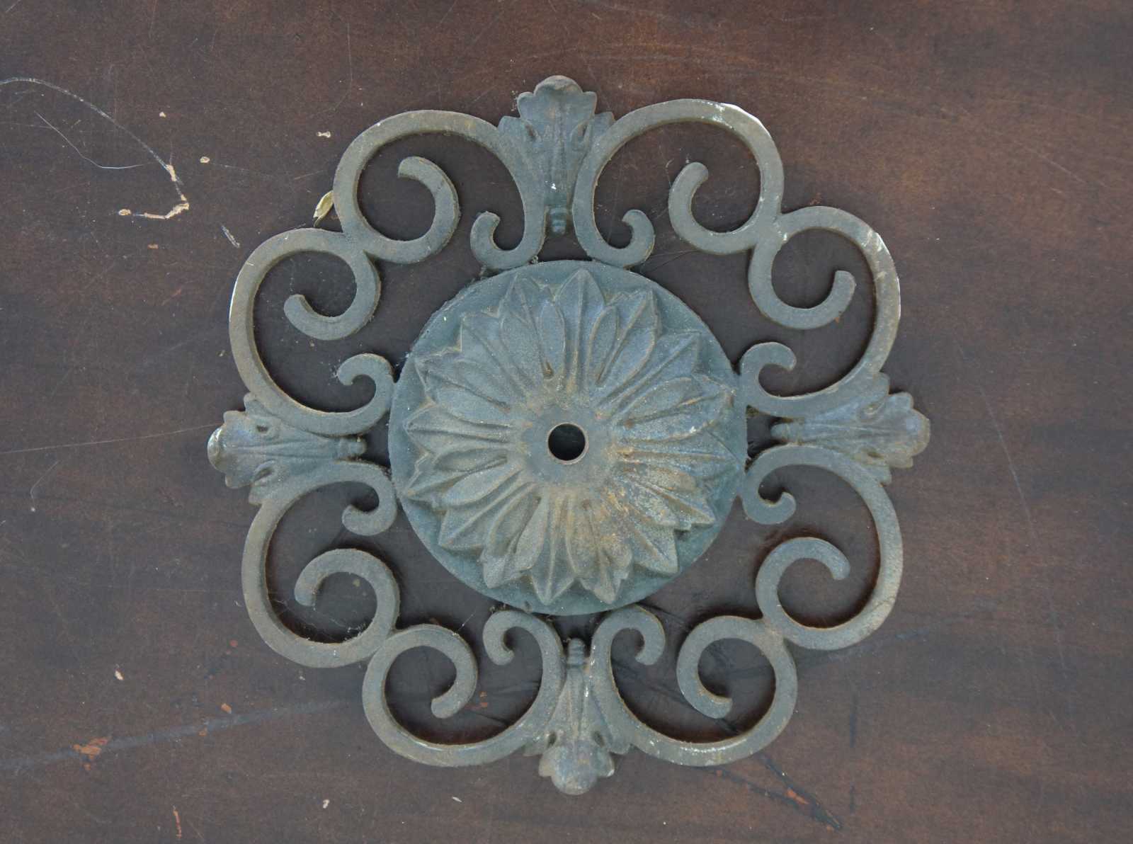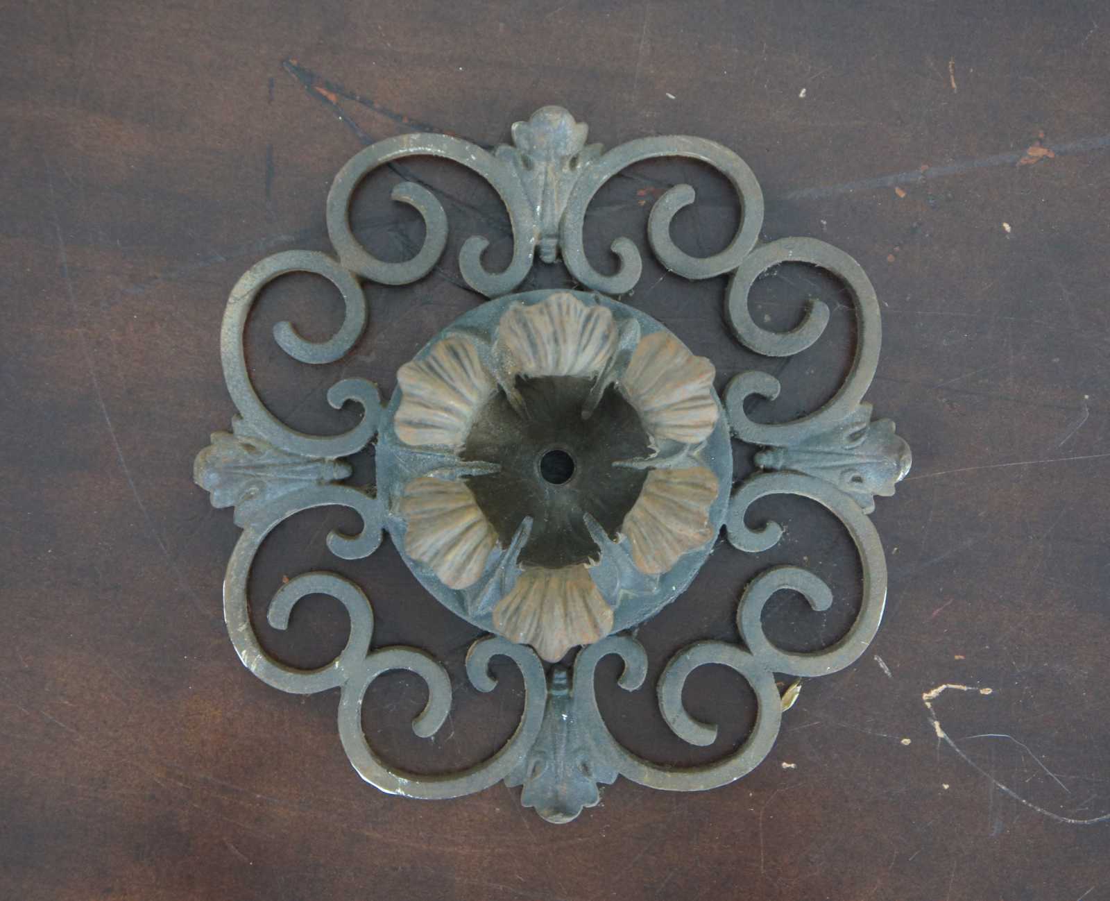 Pair of two cast iron medallion pendant ceiling light mounts or brackets. These are intended to be mounted to a ceiling with fixture installed within. Comes from one of the first homes built in Oakwood, Ohio by Harry I Schenck.