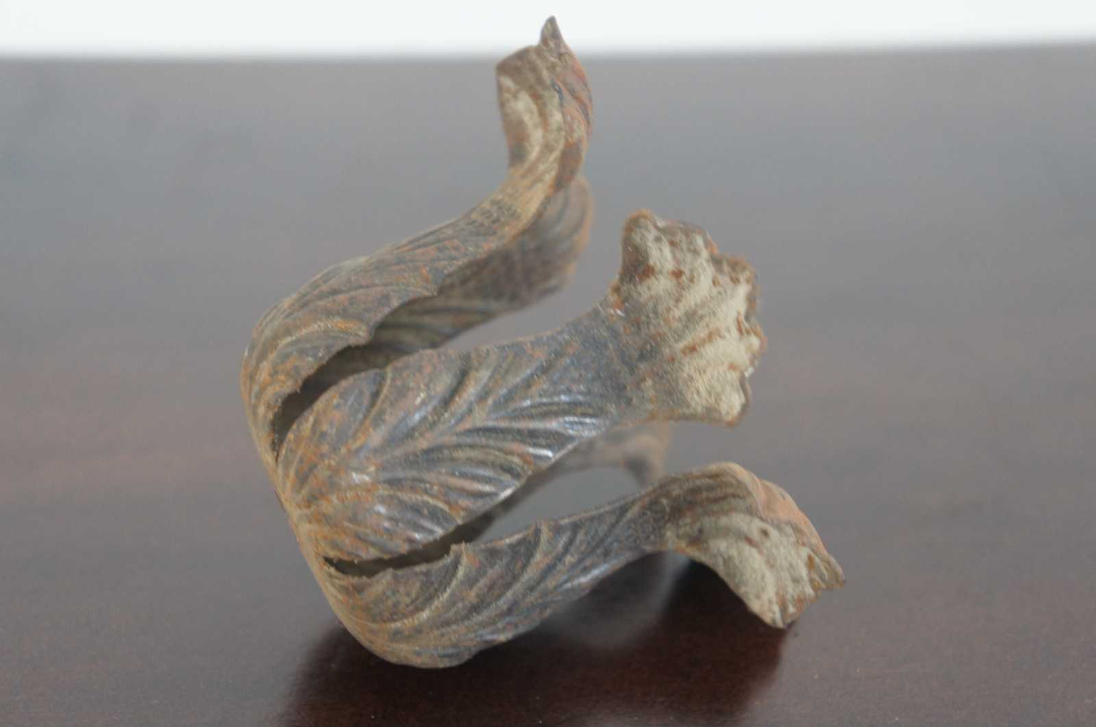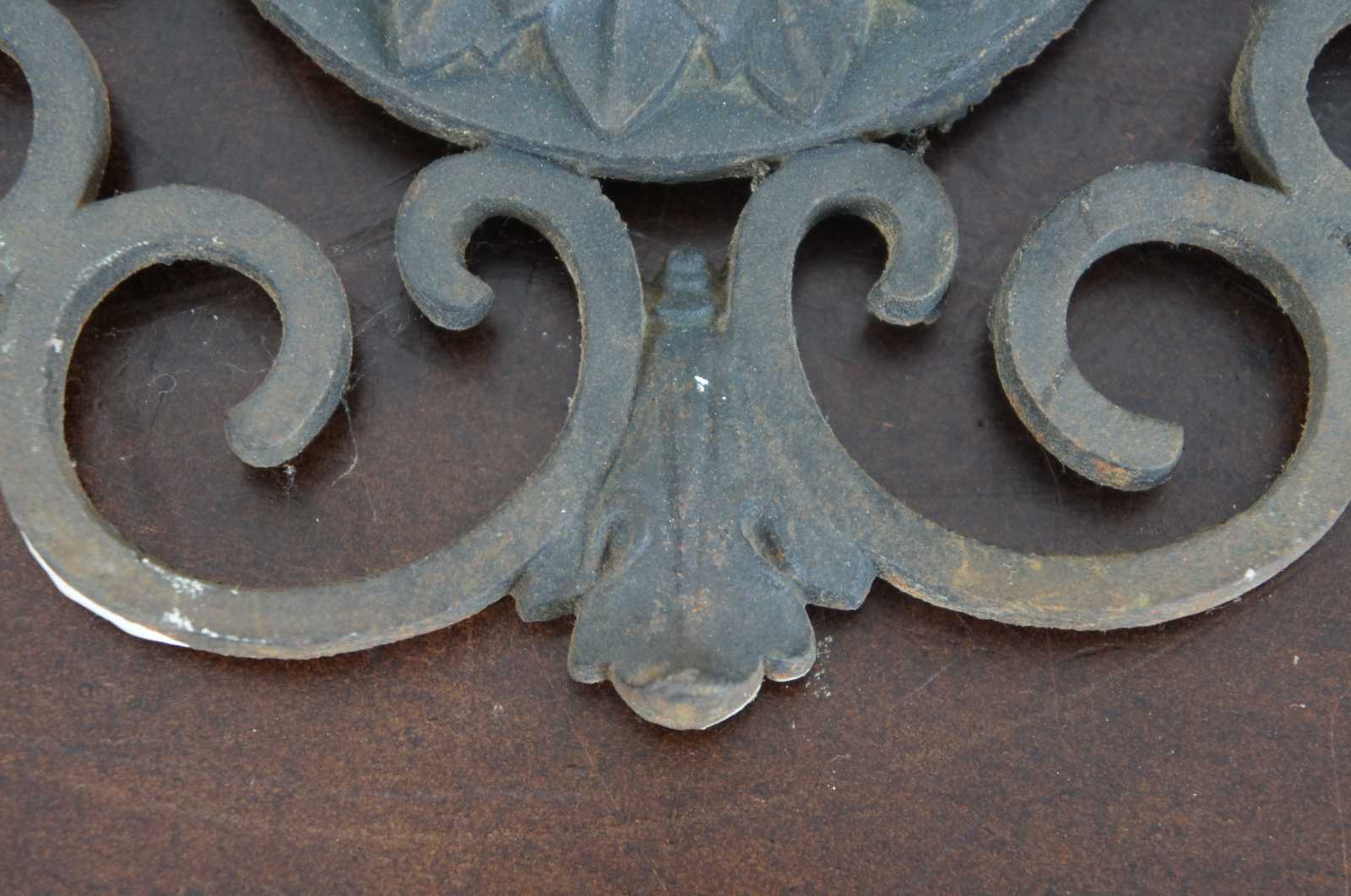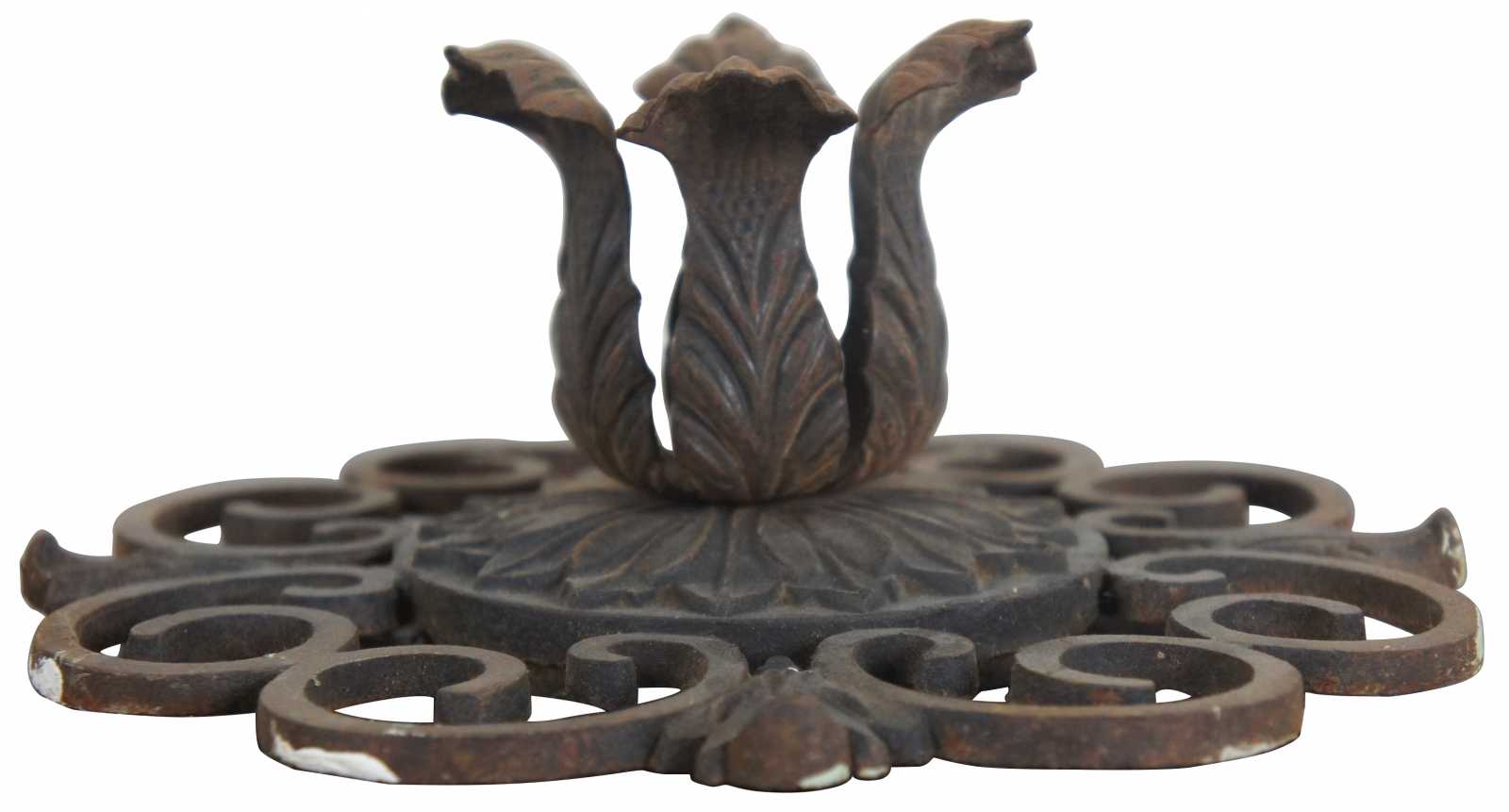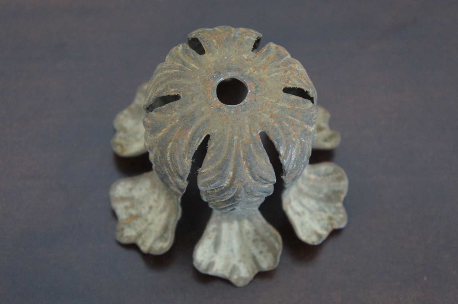 Pair of two cast iron medallion pendant ceiling light mounts or brackets. These are intended to be mounted to a ceiling with fixture installed within. Comes from one of the first homes built in Oakwood, Ohio by Harry I Schenck.