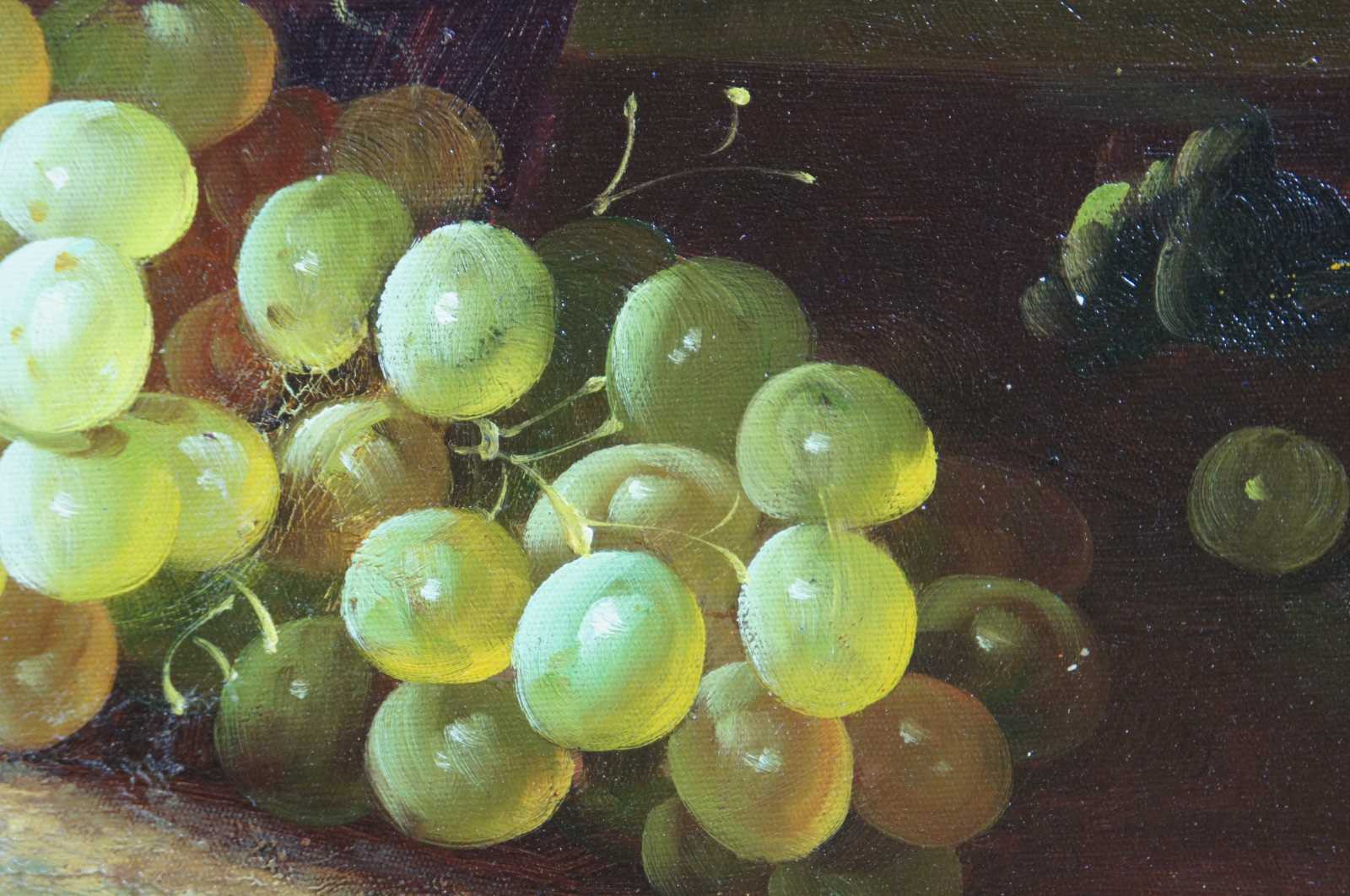 20th Century Original Still Life. A Canvas painting featuring a basket of peaches with apples and grapes below. Mounted in a French inspired gold frame.
