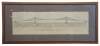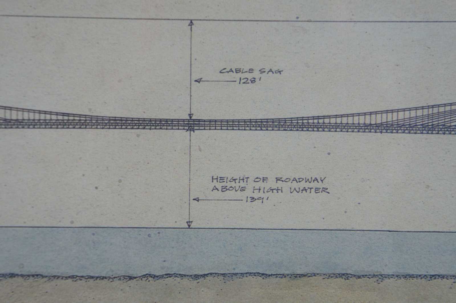 An antiqued print of the archicetural outline for The Brooklyn Bridge. The bridge was designed by John A. Robeling, A german born American Civil Engineer who specialized in suspension bridges. Part of the Famous Bridge Series by Dayton Hudson Corporation done in 1999.