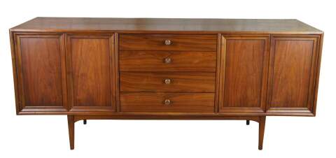 Iconic Mid Century Modern Drexel Declaration buffet or credenza by Kipp Stewart and Stewart McDougall, circa 1955. A rectangular form made from walnut with four central dovetailed drawers flanked by outer cabinets with illuminated interior. M 851-136