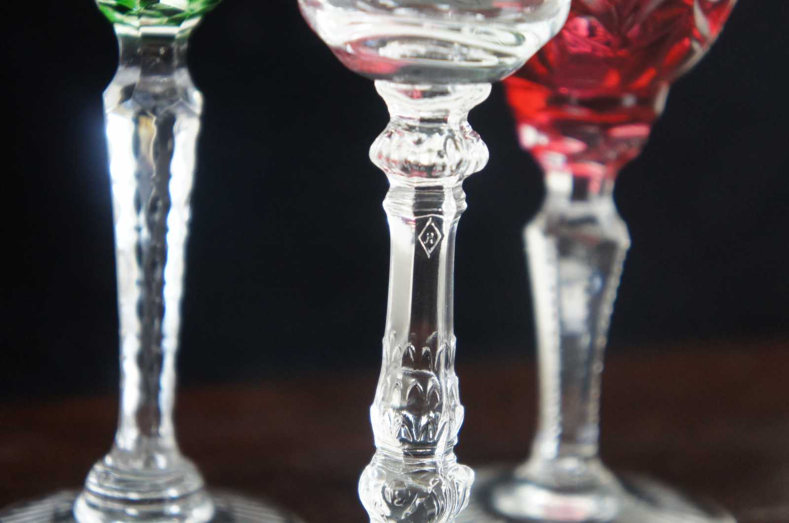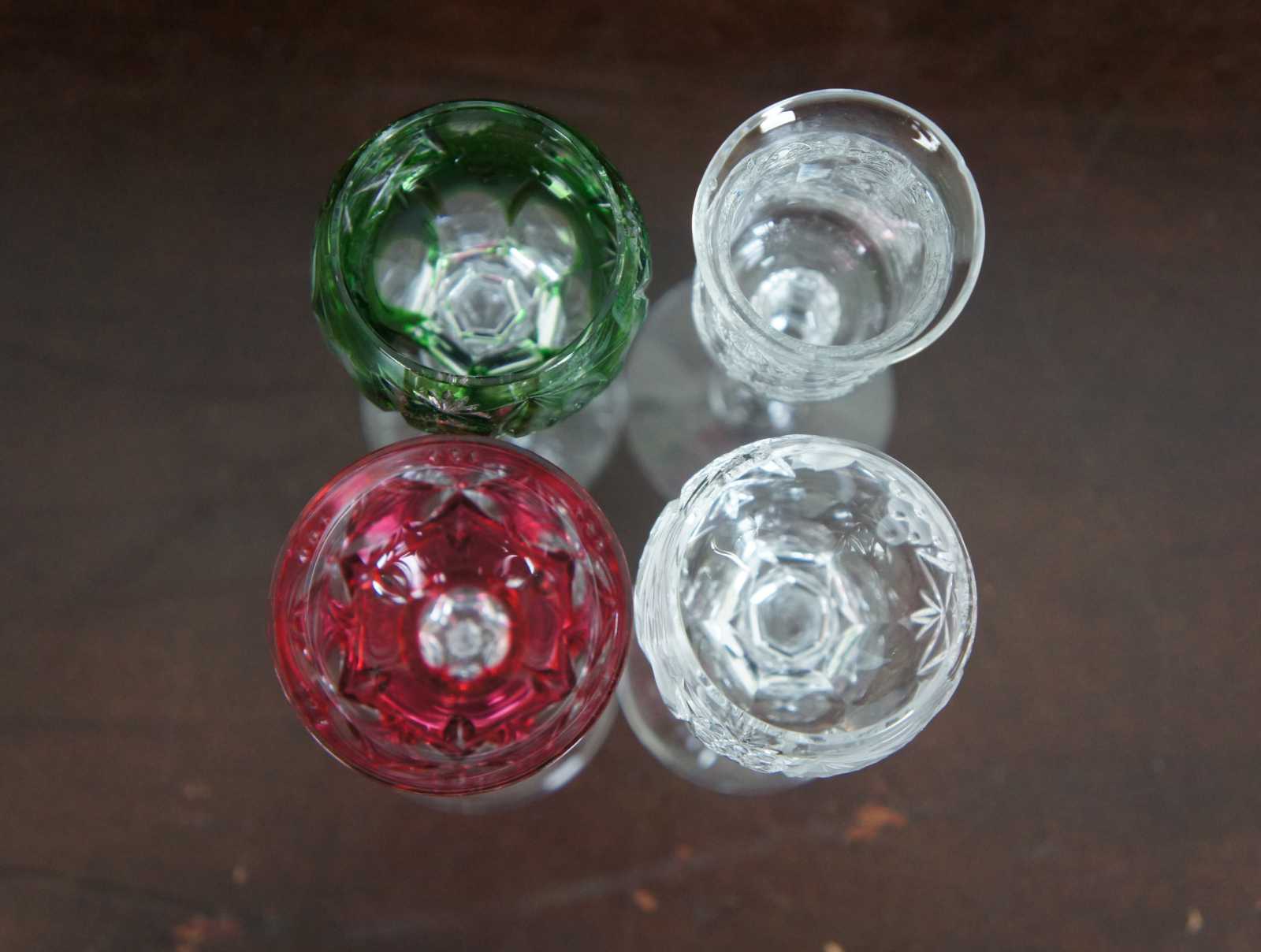 Four crystal coridials or shot glasses. Features cut and etched crystal in varying styles.