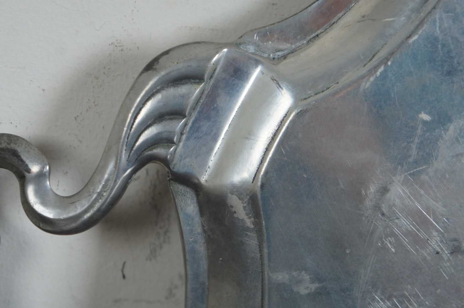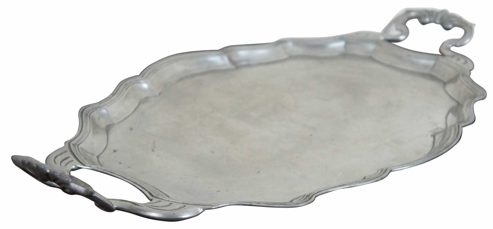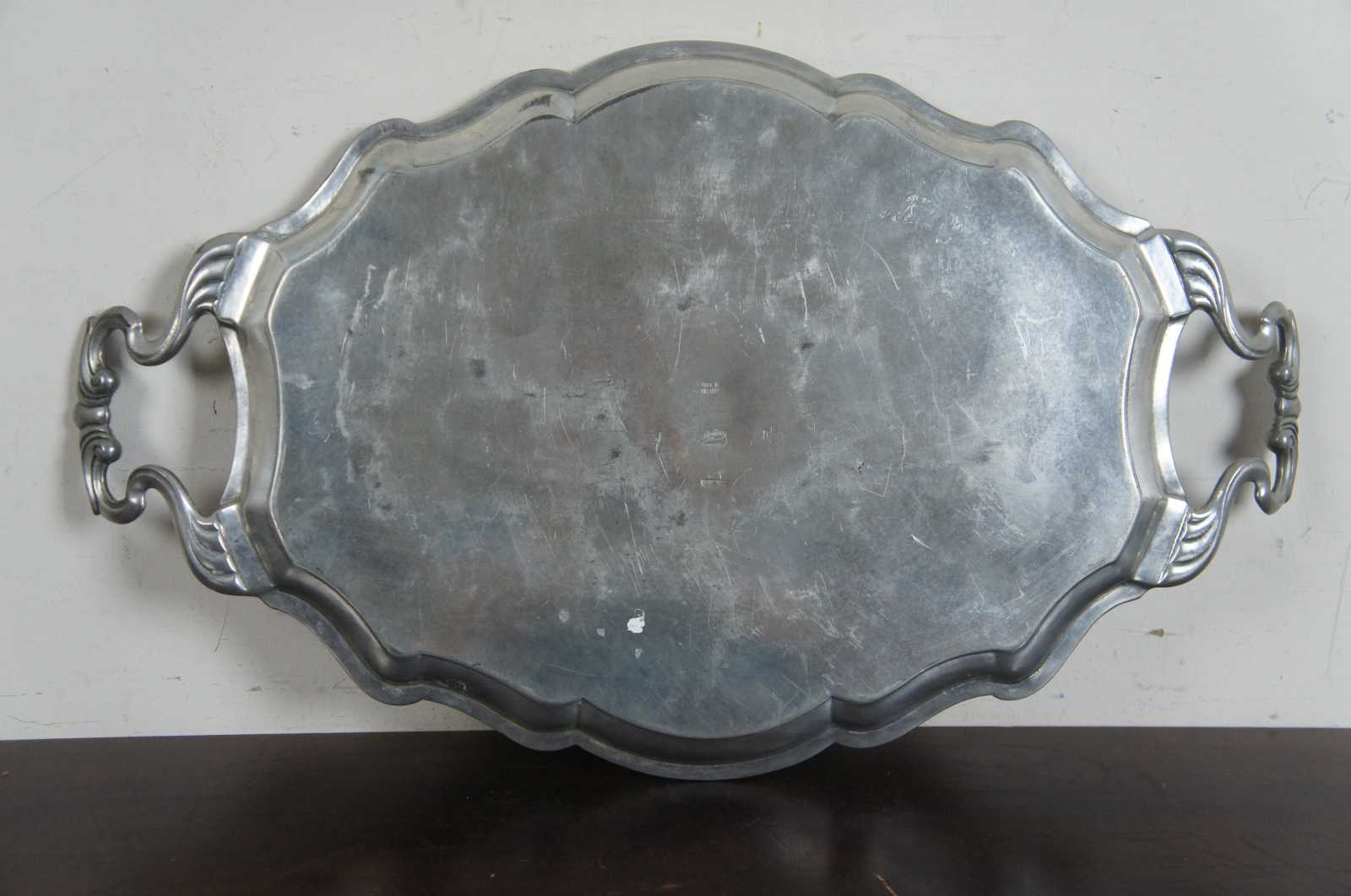 Antique pewter serving tray or vanity platter by Metten. Handmade in Belgium, features ornate scalloped rim and handles. Stamped on backside.