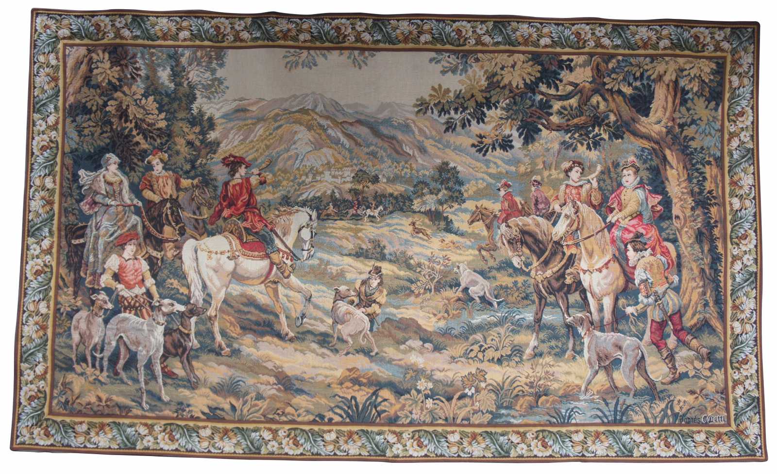 The style of this tapestry reflects the influence of the Renaissance, a period when the art of tapestry became more a copy of painting, with rich wide borders and scenes with great perspective and depth. This beautiful tapestry is woven on a jacquard loom by skilled weavers, keeping alive the centuries old tradition of tapestry manufacturing from generation to generation. This tapestry is fully lined in silk on the backside incorporating a sleeve along the top for hanging.