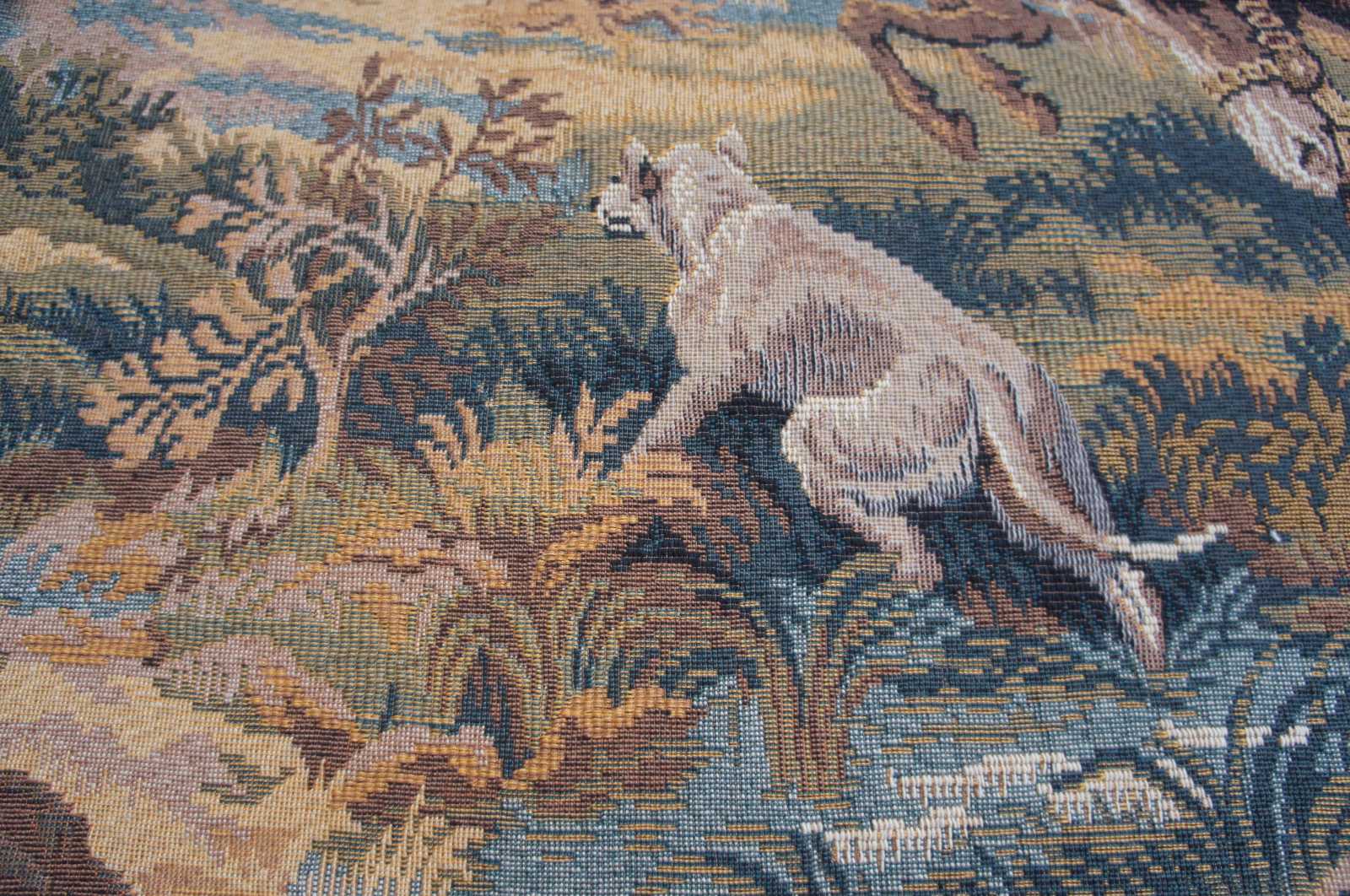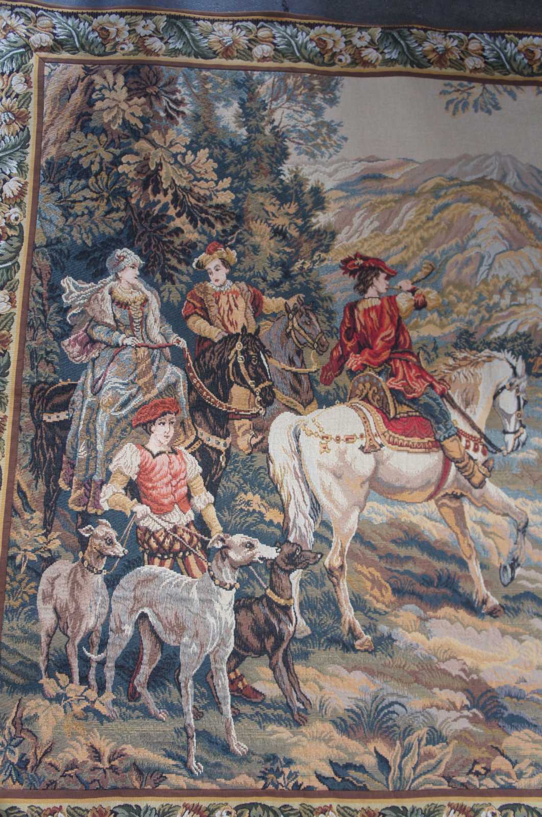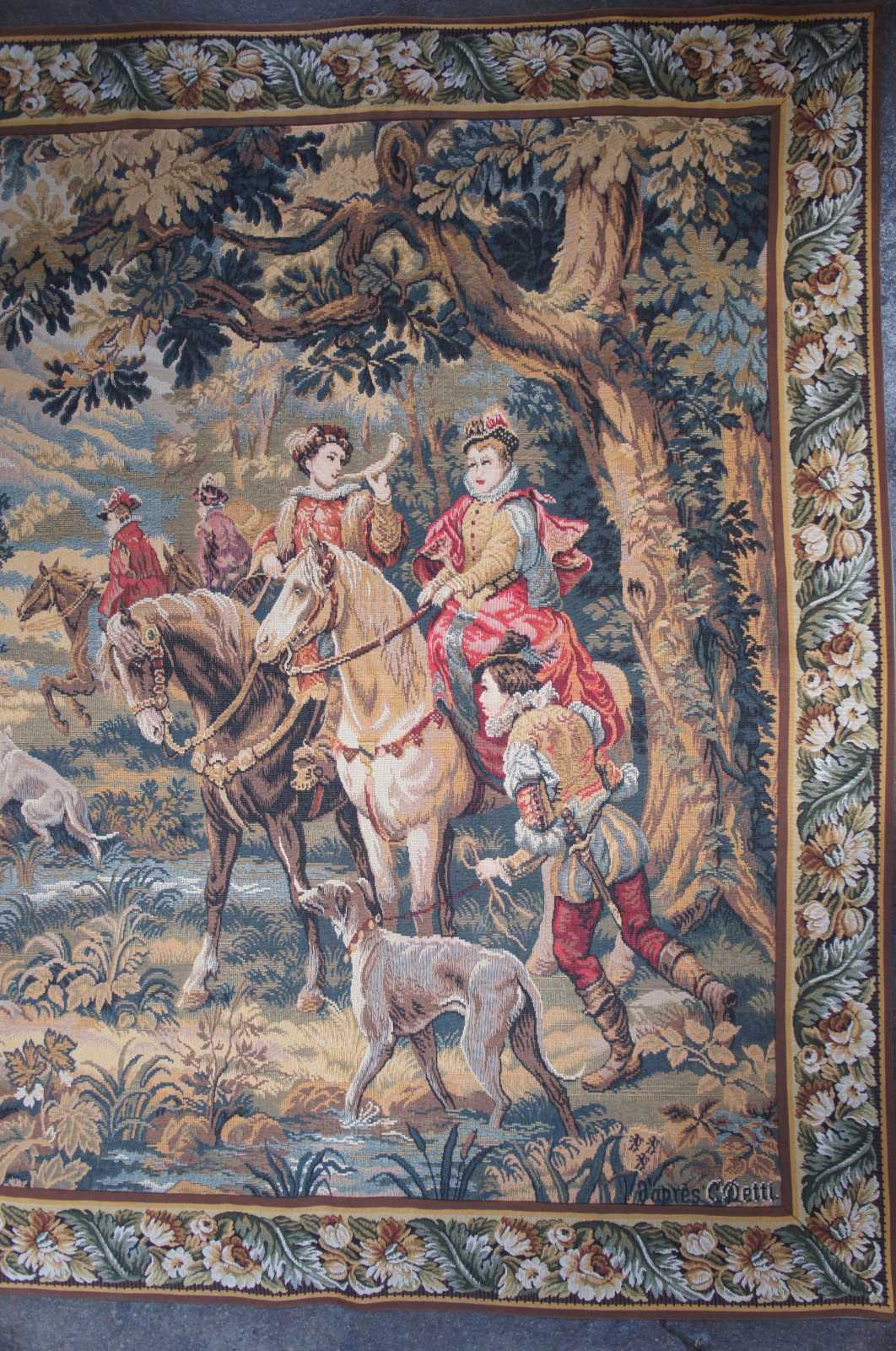 Monumental 20th century French Aubusson ""Royale"" tapestry. Titled ""La Chasse"" or Chasse a Couree (Hunting with Hounds). This tapestry depicts a noble hunting scene after the artist C. Detti, with characters dressed in richly-detailed 17th century-style costumes.