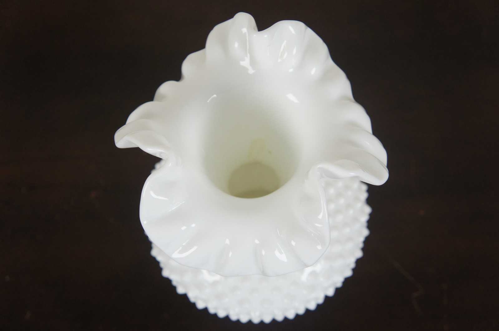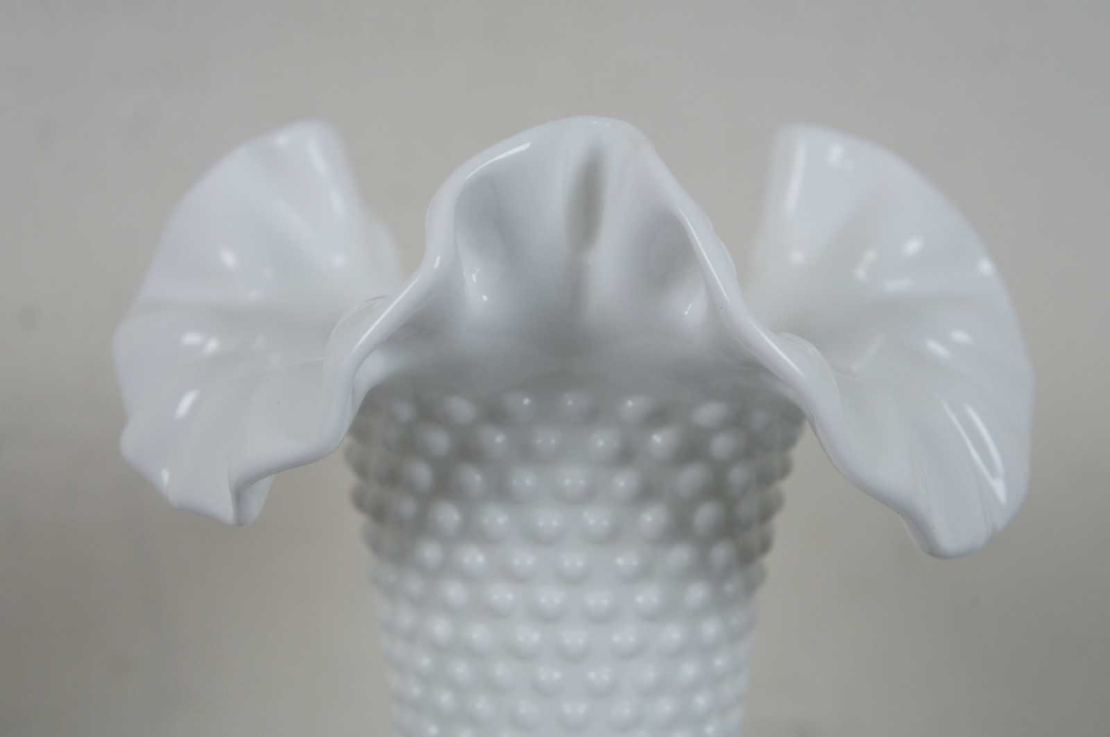 Vintage Fenton milk glass vase. Features hobnail pattern and freeform ruffled or crimped lip. Pattern 3752.