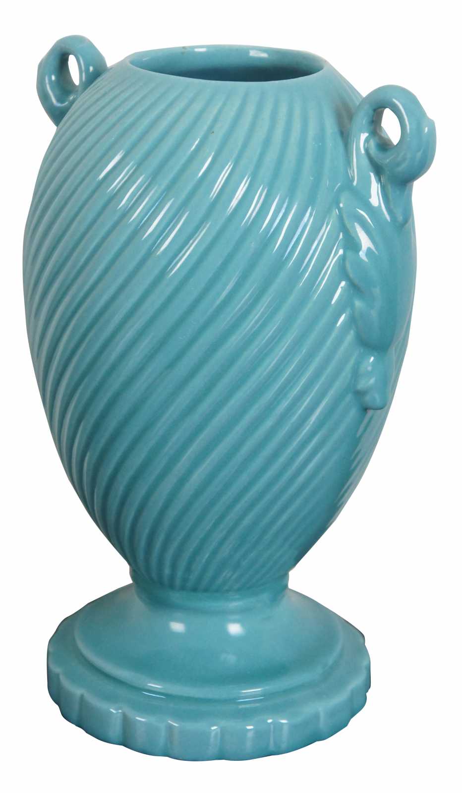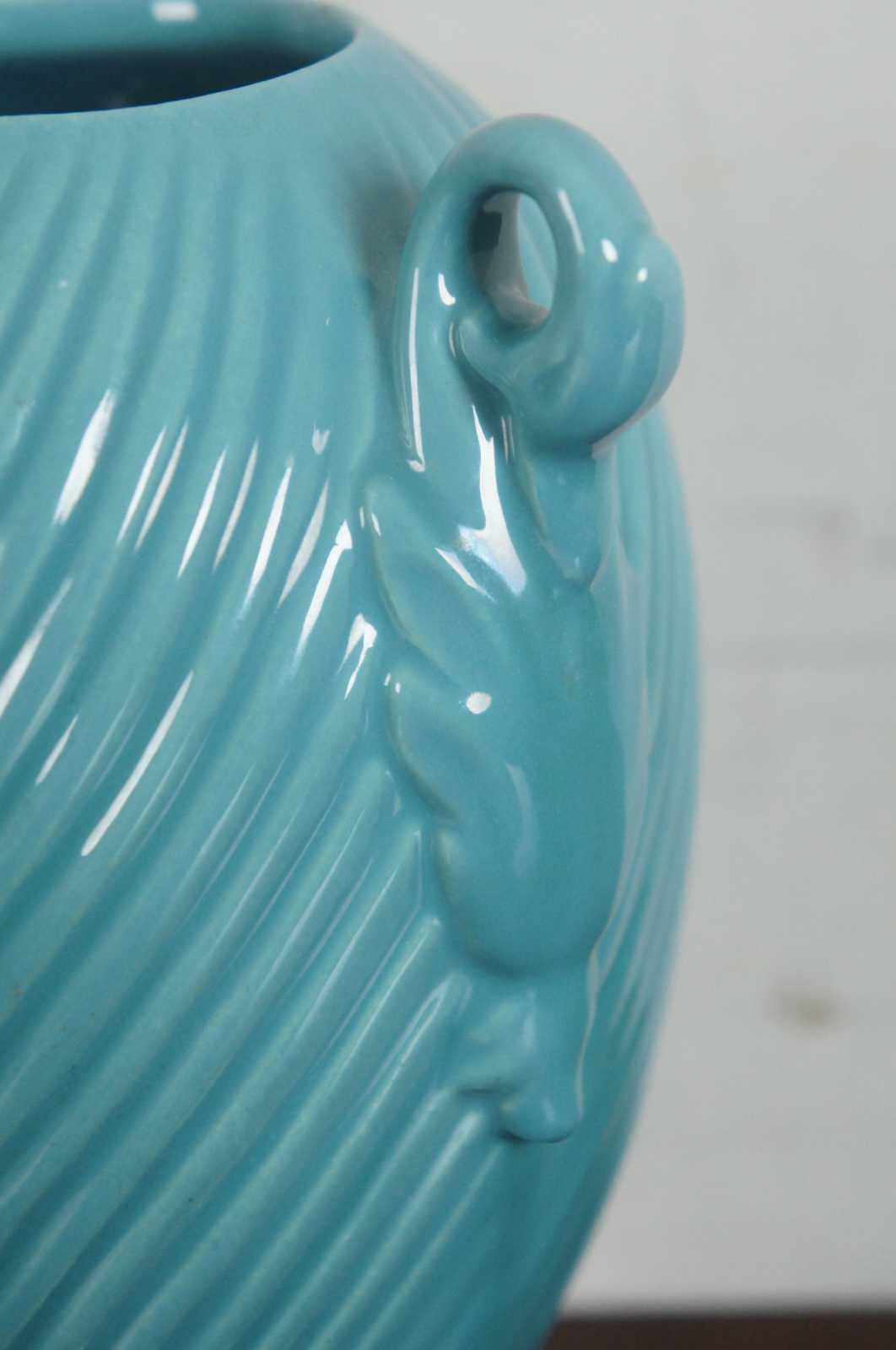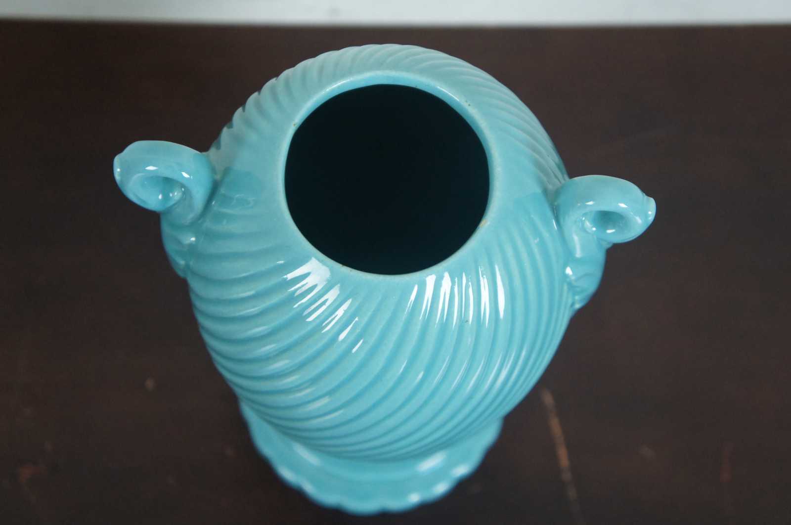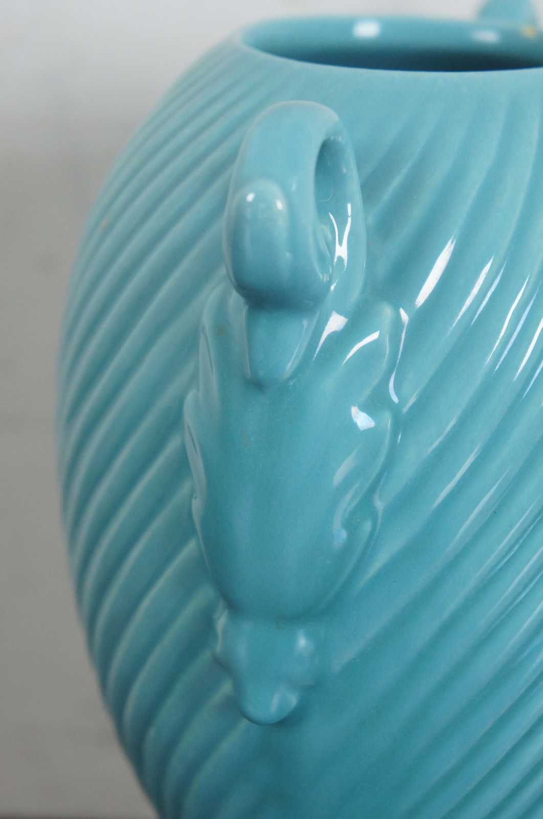 Vintage Haegar Pottery bud vase. Features aqua / teal / boho blue with swan shaped handles.