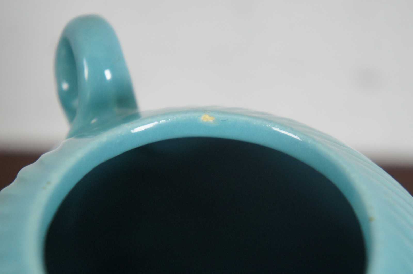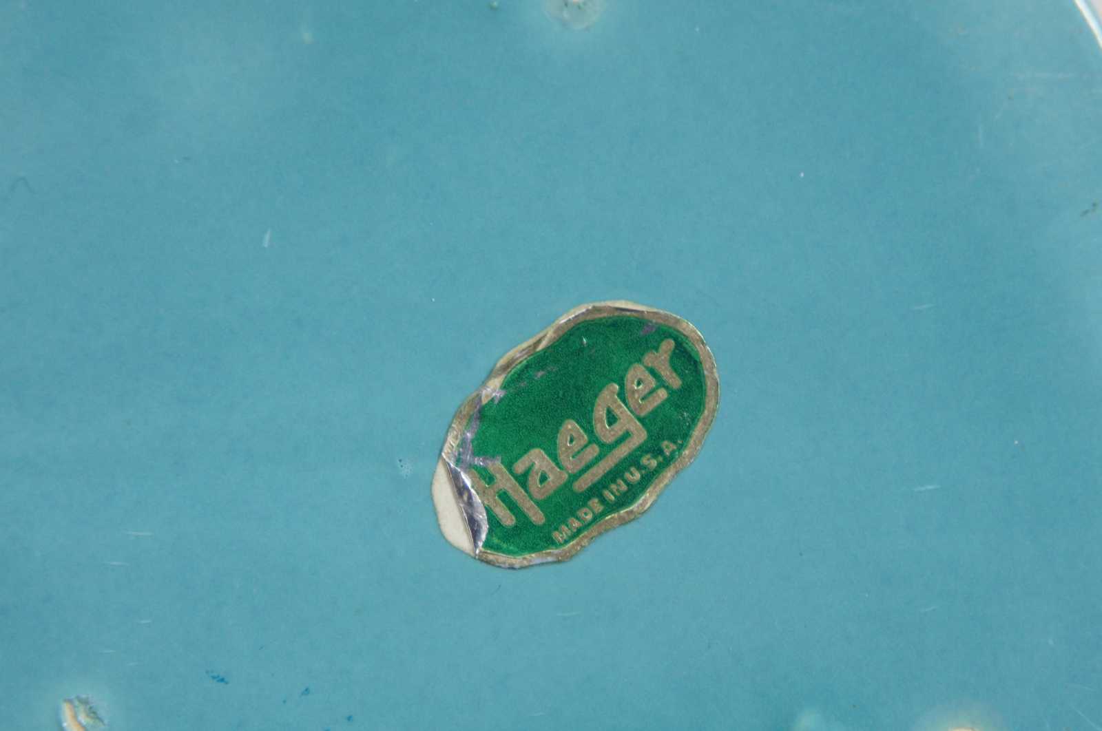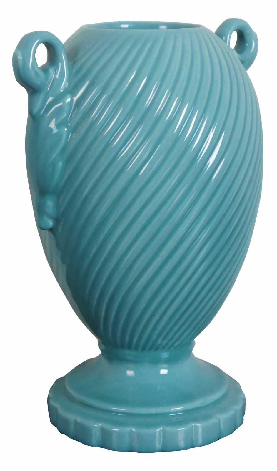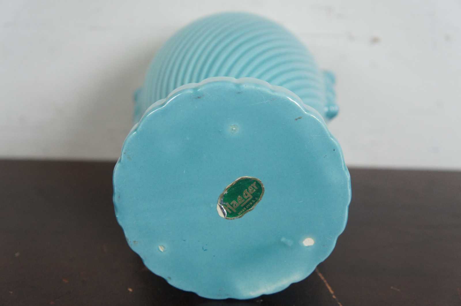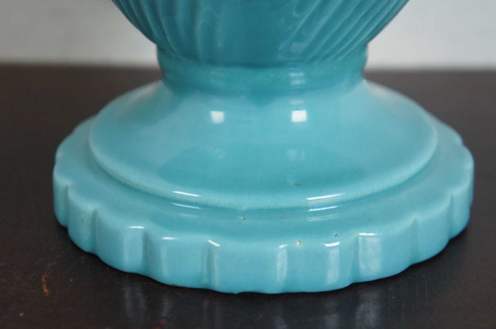 Vintage Haegar Pottery bud vase. Features aqua / teal / boho blue with swan shaped handles.