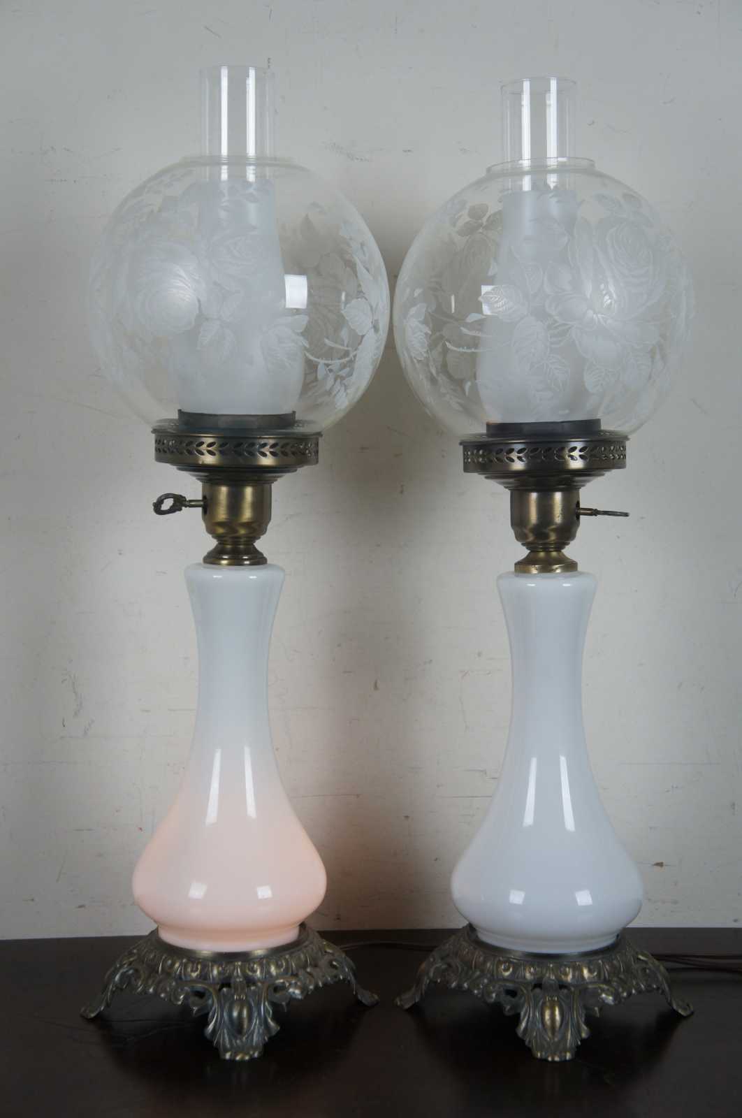 2 Gone with the wind lamps. Each features – Multi-way lights in base and top globe. Glass globes are painted with roses.
