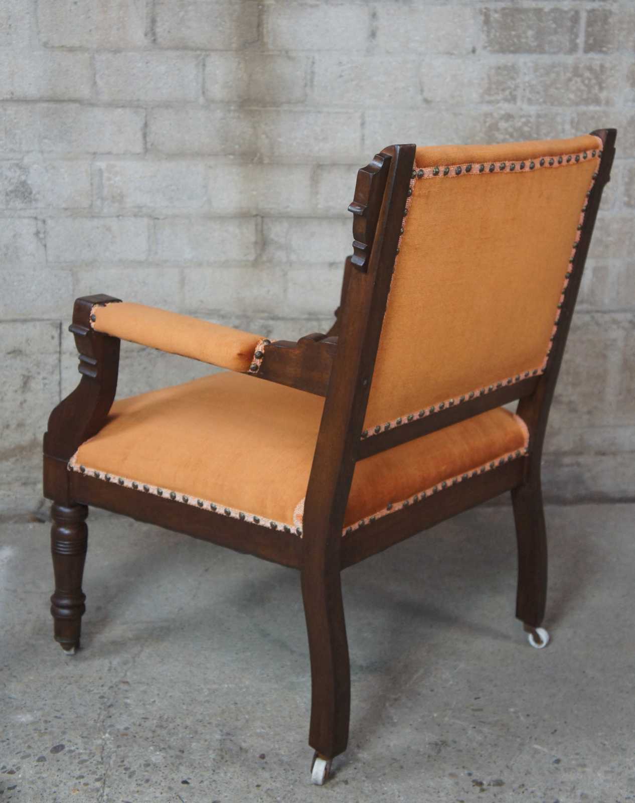 19th century Victorian chair with beautiful eastlake carved accents. Upholstered in peach orange fabric with brass nailhead trim and castors.