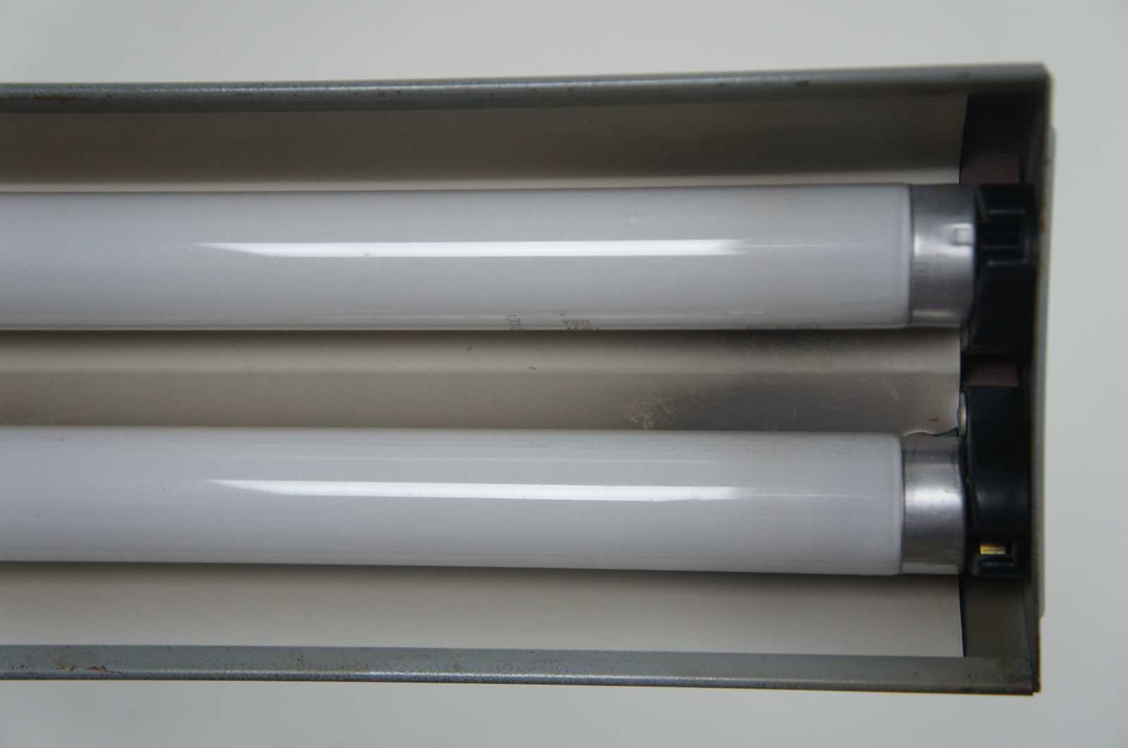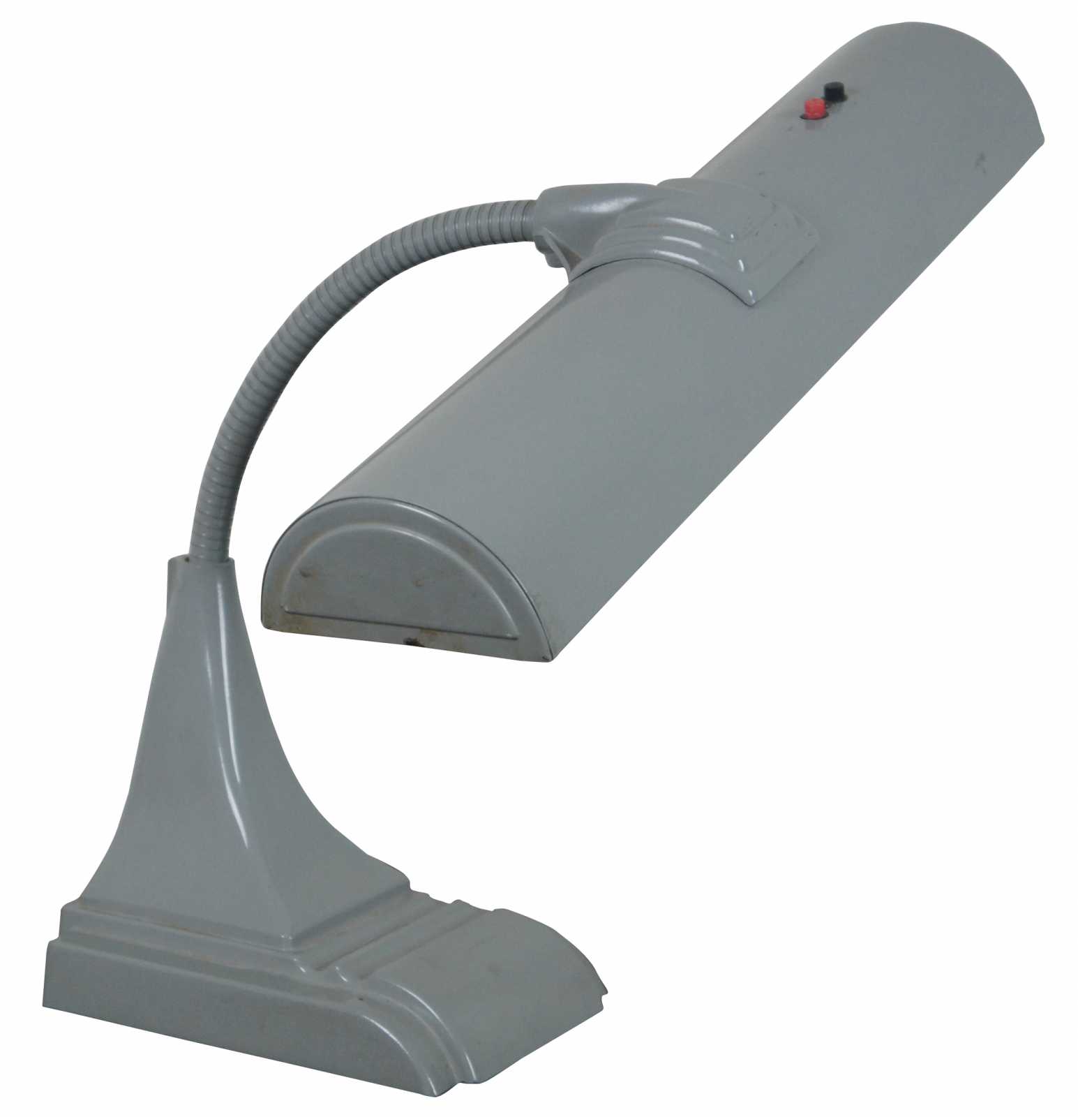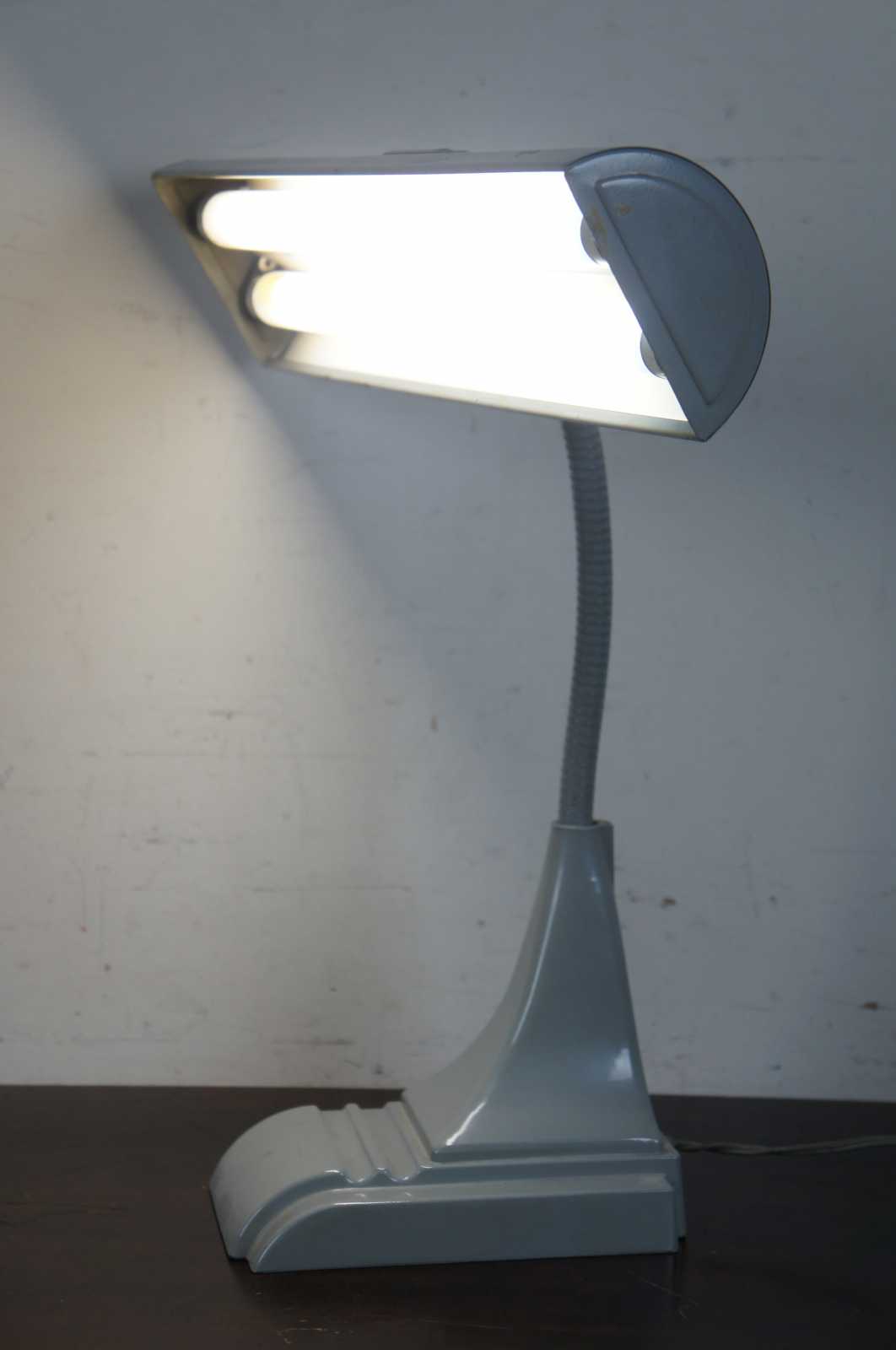 Late art deco style mid century bankers or drafting lamp. Features two flourescent bulbs and grey metal casing.