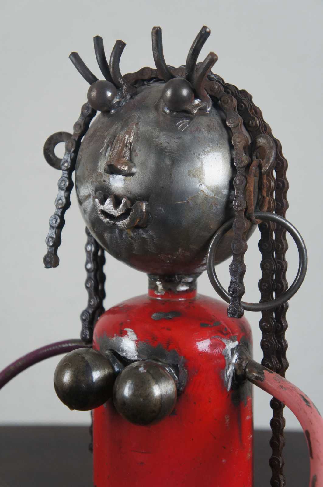 Vintage 2010 life size iron sculpture. Aptly titled, Camera Girl. This sculpture was made by world renoune father and son duo Chad & Phillip Glashoff on their ranch in Suisun Valley. World-renown metal sculptors Phillip and Chad Glashoff are based in rustic Suisun Valley, and as you drive through the valley to there Sculpture Ranch, you’ll enjoy seeing their sculpted whimsical mailbox’s dotting the landscape of the beautiful valley. You'll be even more surprised when you arrive at the ranch, with countless sculptures each one unique lining the walkways. Don’t forget the many exotic farms animals grazing in pastures and hills. The artwork so interesting as the landscape is for photographic possibilities, all to inspire the inner artist within.