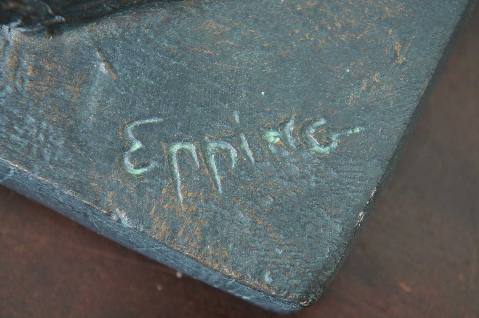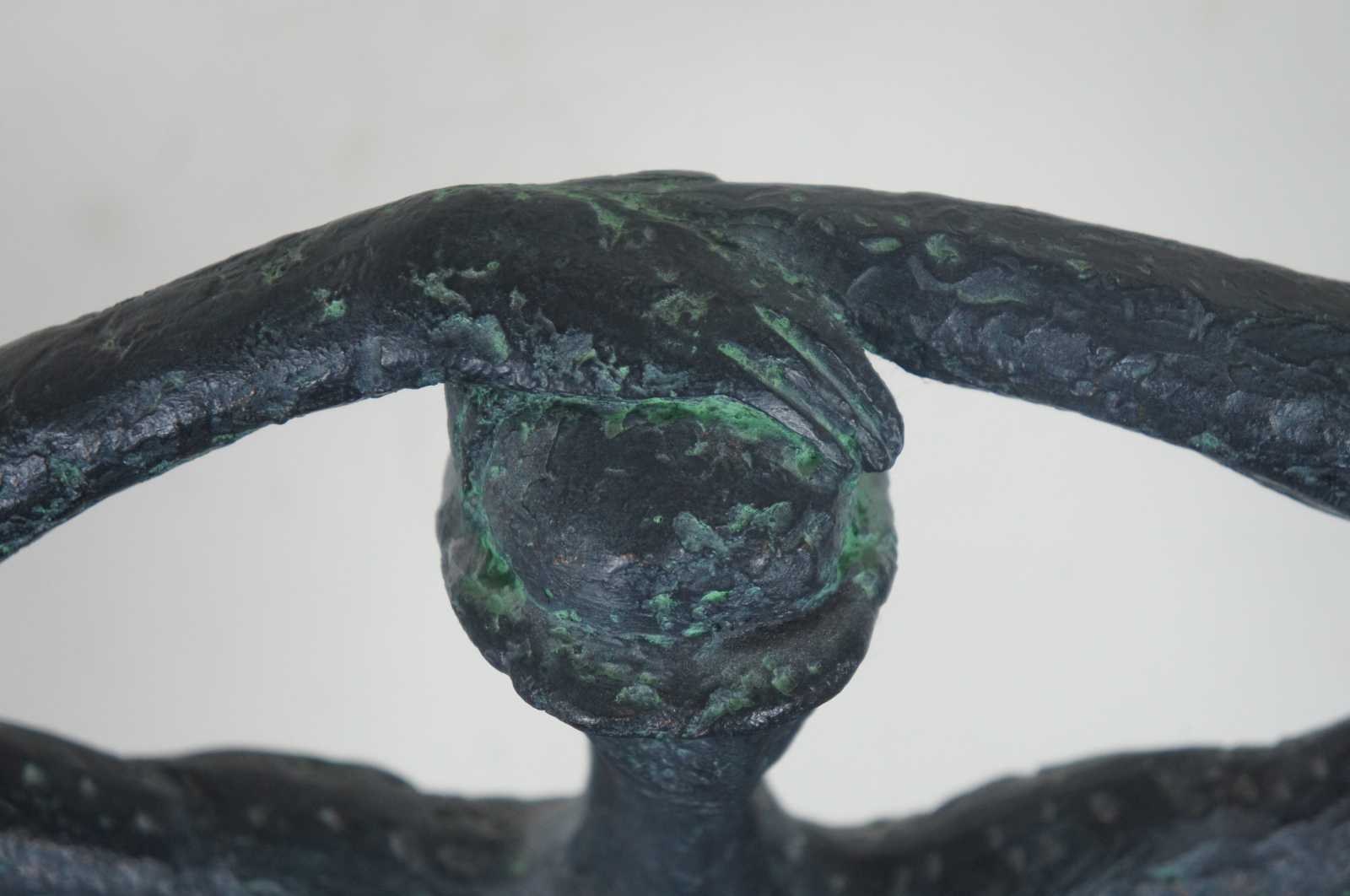 A large mid century modern Austin Productions plaster sculpture after Franc (Dorothy) Epping (American, born 1910). Piece is titled, Man with Hat. It depicts a tall, thin man wearing a hat with his hands resting on his head and is finished in a patinated bronze effect. The sculpture is signed in cast “Epping” and inscribed “Austin Prod Inc 1962” to the base.