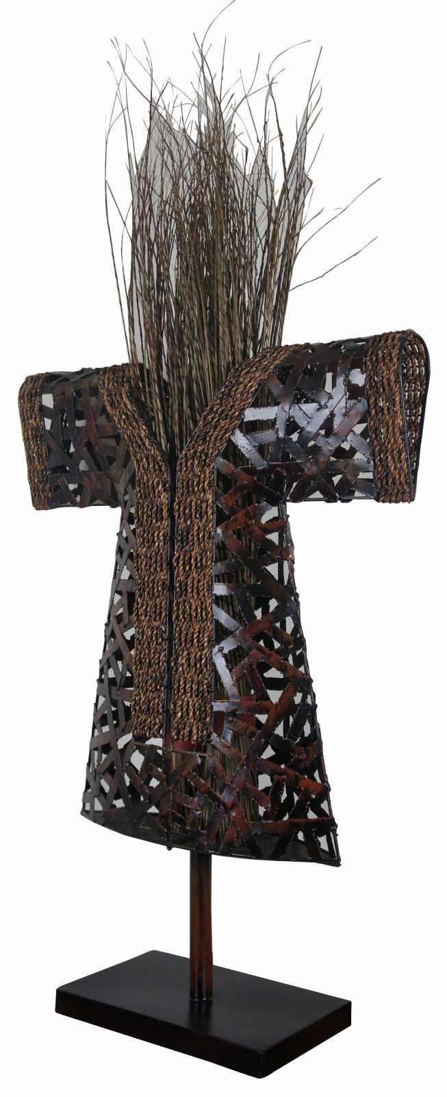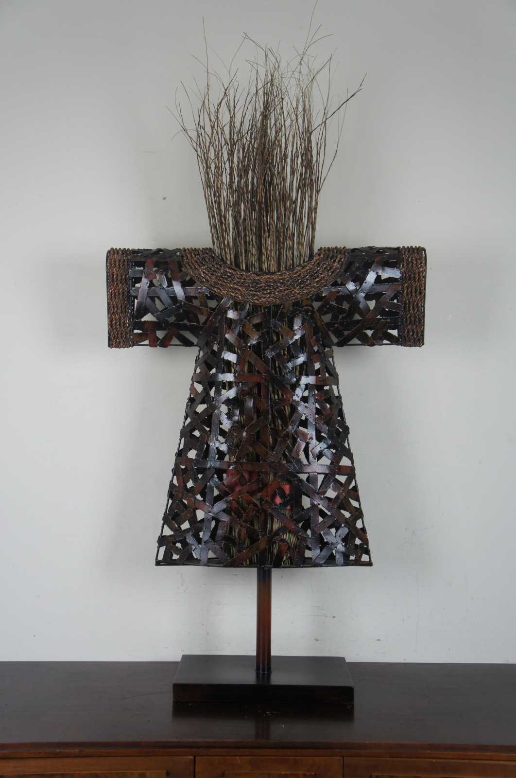 Modern metal art sculpture or statue. Features African tribal styling with reticulated metal construction on base with grass bundle inserts.