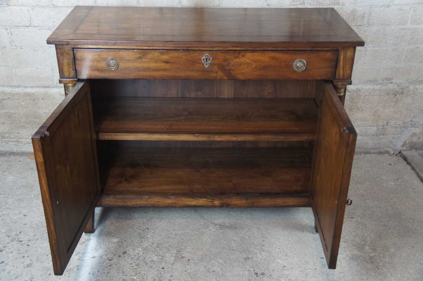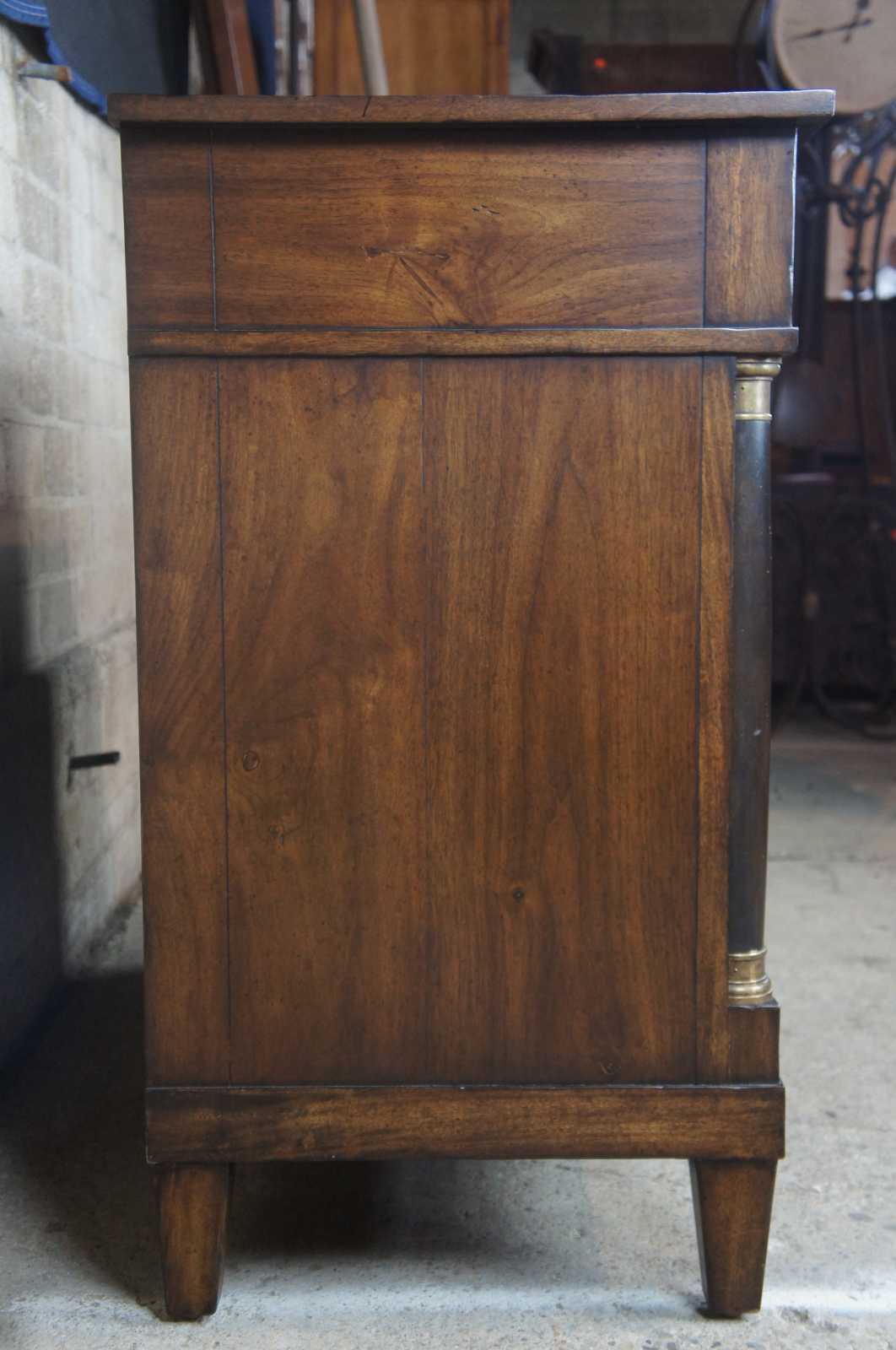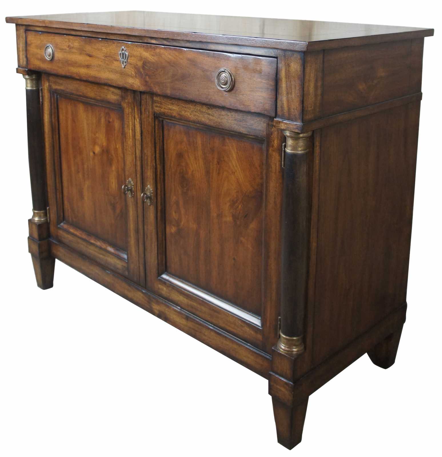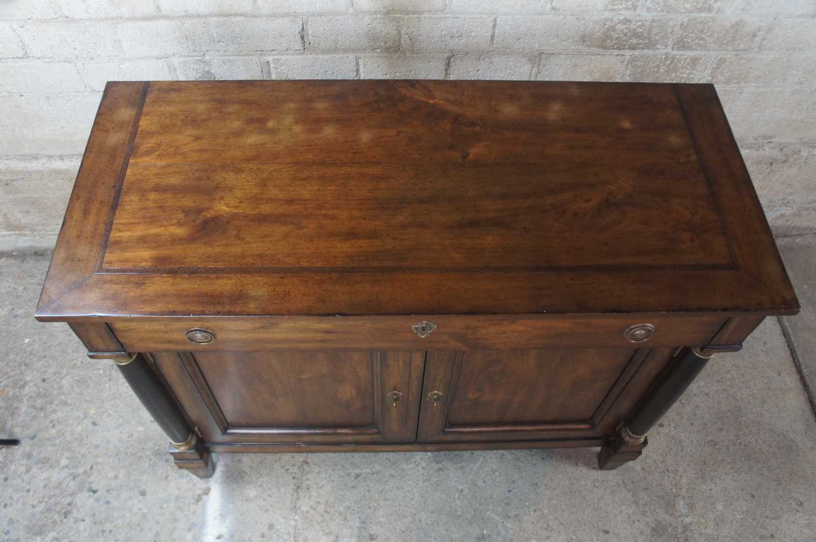 A traditional buffet by Henredon Acquisitions. Made from mahogany with French Empire style columns along the front, banding along the top and large drawer and cabinet space underneath.