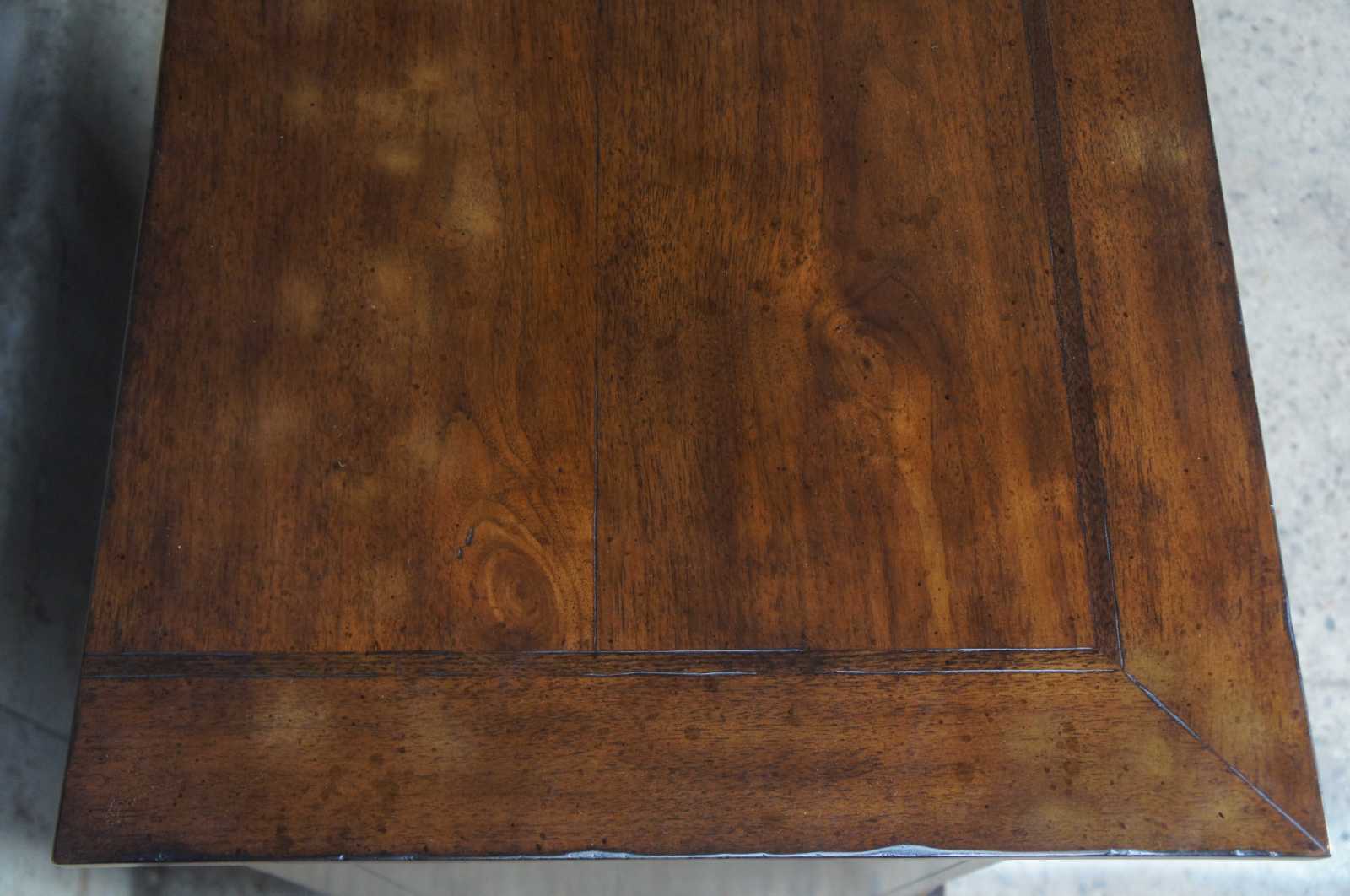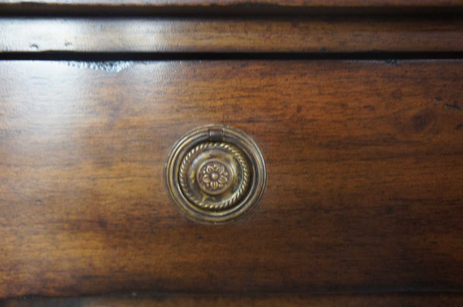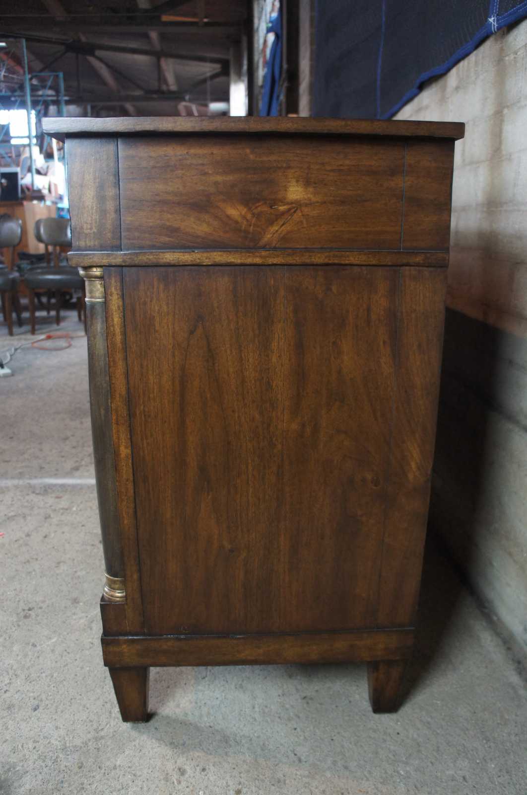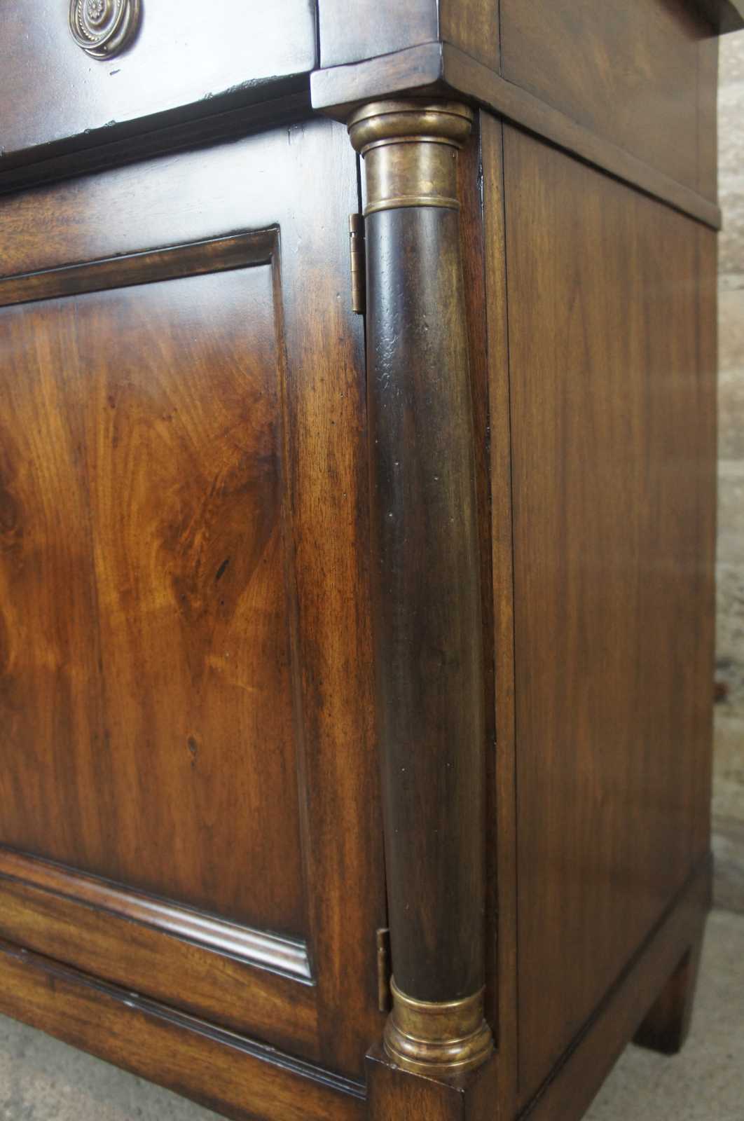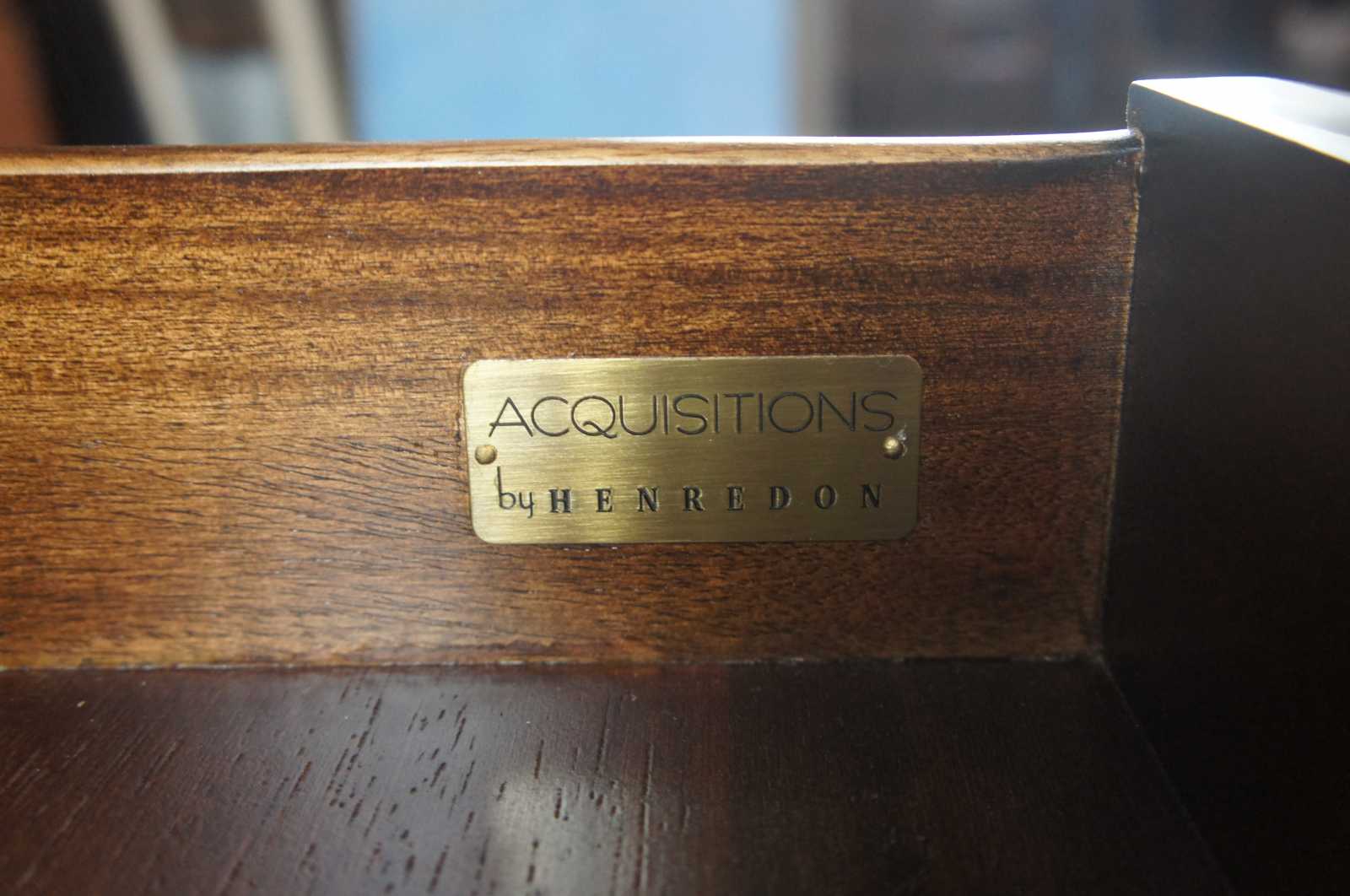 A traditional buffet by Henredon Acquisitions. Made from mahogany with French Empire style columns along the front, banding along the top and large drawer and cabinet space underneath.