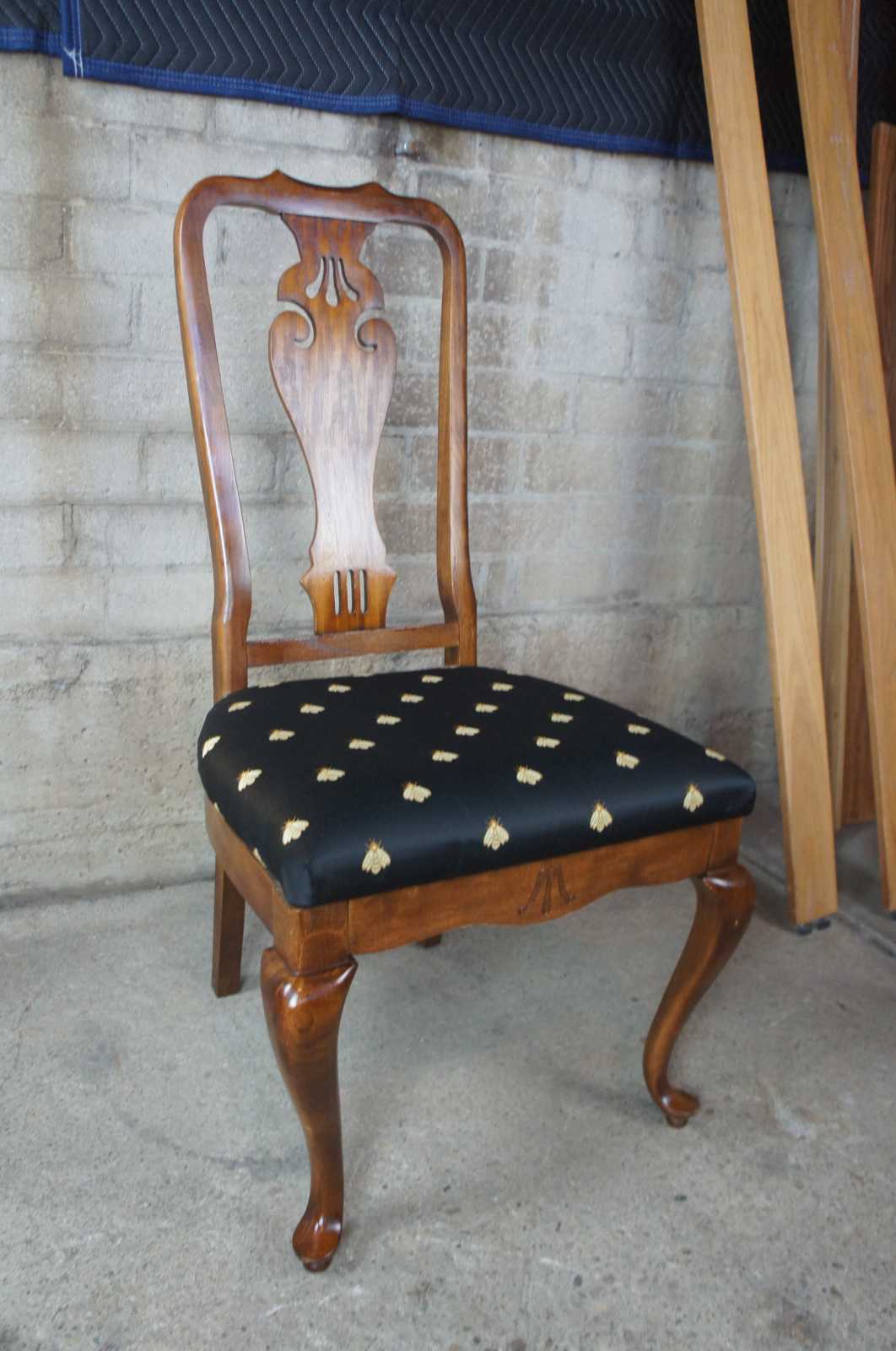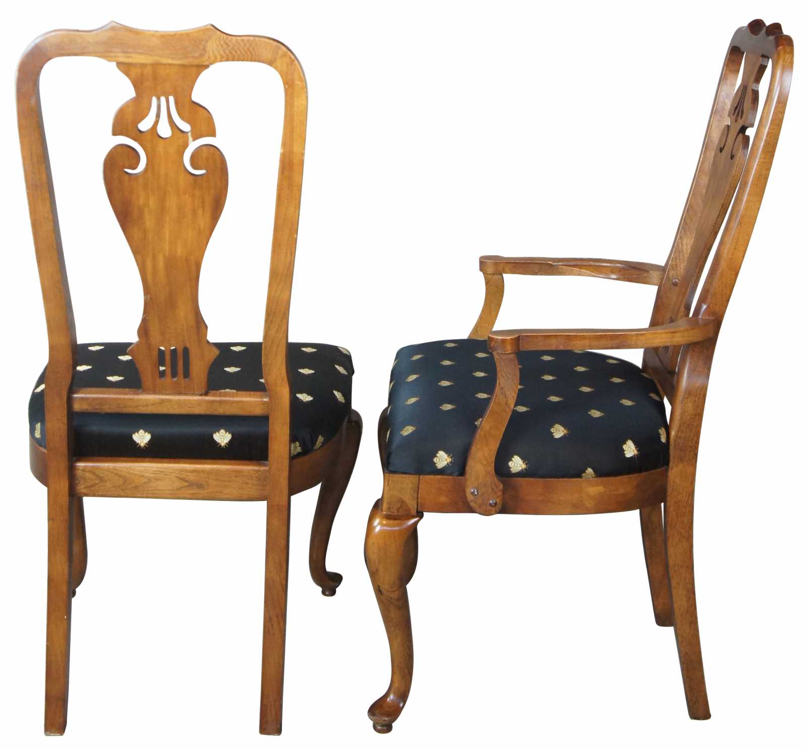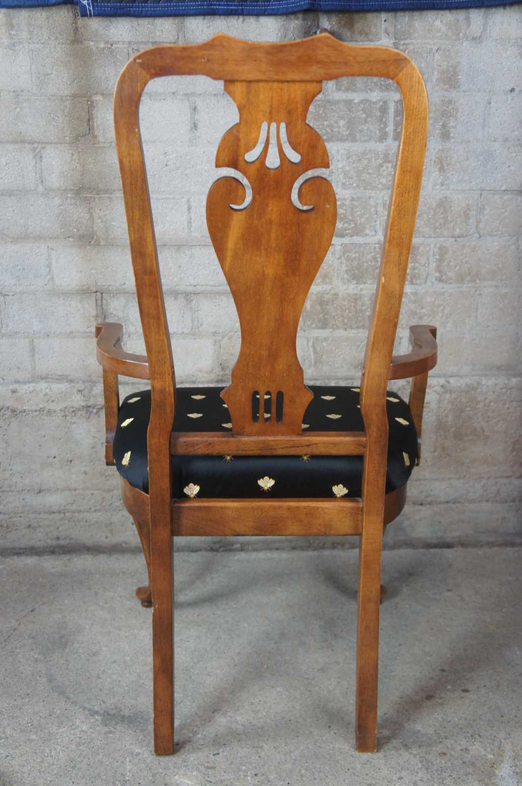 Queen Anne side and arm chair by Bernhardt Furniture Co, circa 1980s. Features molded shoulder with vase shaped and pierced splat back, upholstered in black with insect (bee) pattern. Rests on Cabriole legs.