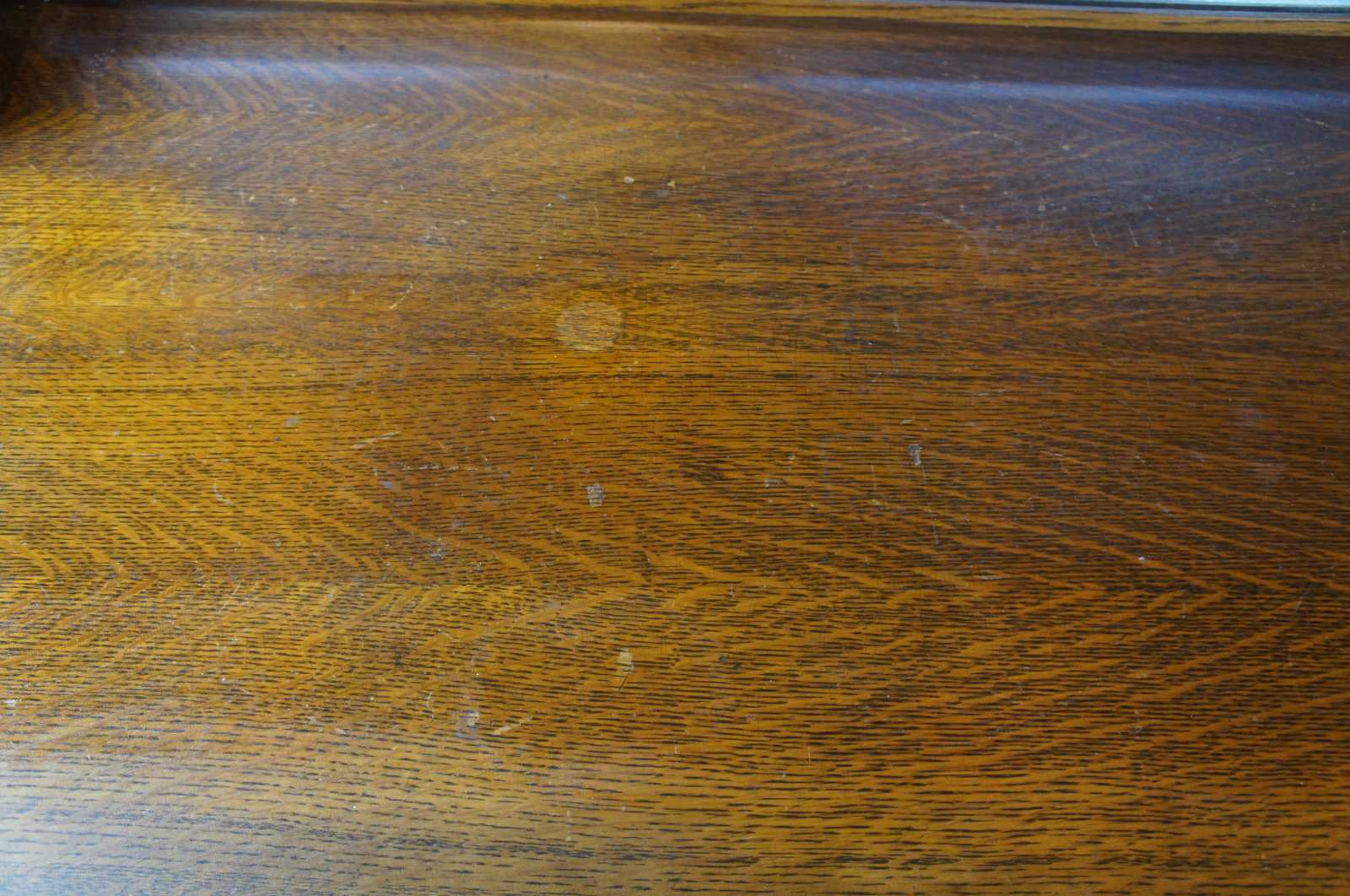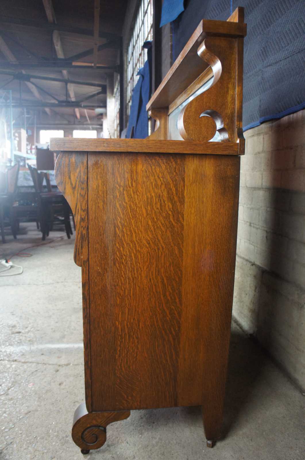 Early 20th century buffet or server from National Furniture Company. Made from quartersawn oak with a contoured front featuring 3 drawers and a central cabint for storage. Includes a scrolled backsplash with a beveled mirrror and upper shelf for display. Great for use as a Buffet, Sideboard or bar back. National Furniture Company was based out of of Jamestown, New York and operated from 1890-1938. They specialized in the manufacture of high end furniture and later became Union National in 1939.