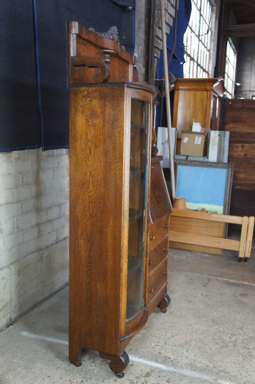 Late Victorian side by side secretary desk and bookcase from National Furniture Company. Crica 1900s. Made from quartersawn oak with a drop front secretary over three drawers flanked by a curved glass front bookcase. Secretary opens to pigeon holes and interior drawer. Includes a carved backsplash with drop finial over shelf and beveled oval glass mirrror. Rests upon wooden casters that are removable. National Furniture Company was based out of of Jamestown, New York and operated from 1890-1938. They specialized in the manufacture of high end furniture and later became Union National in 1939.