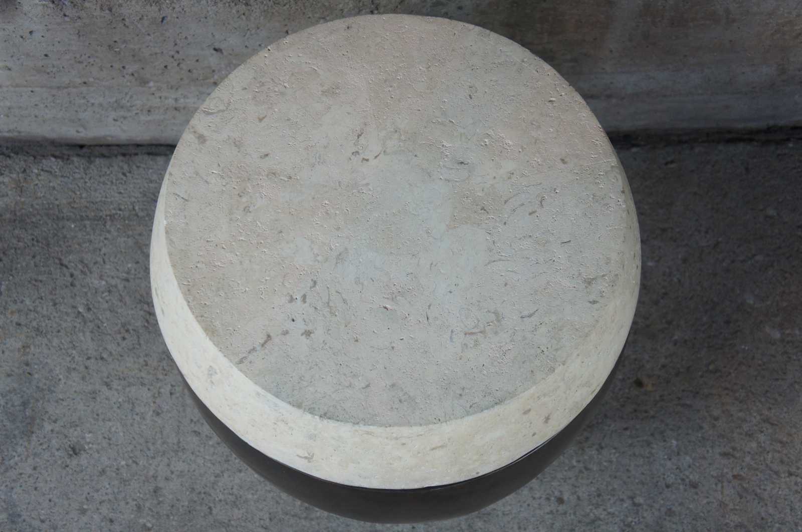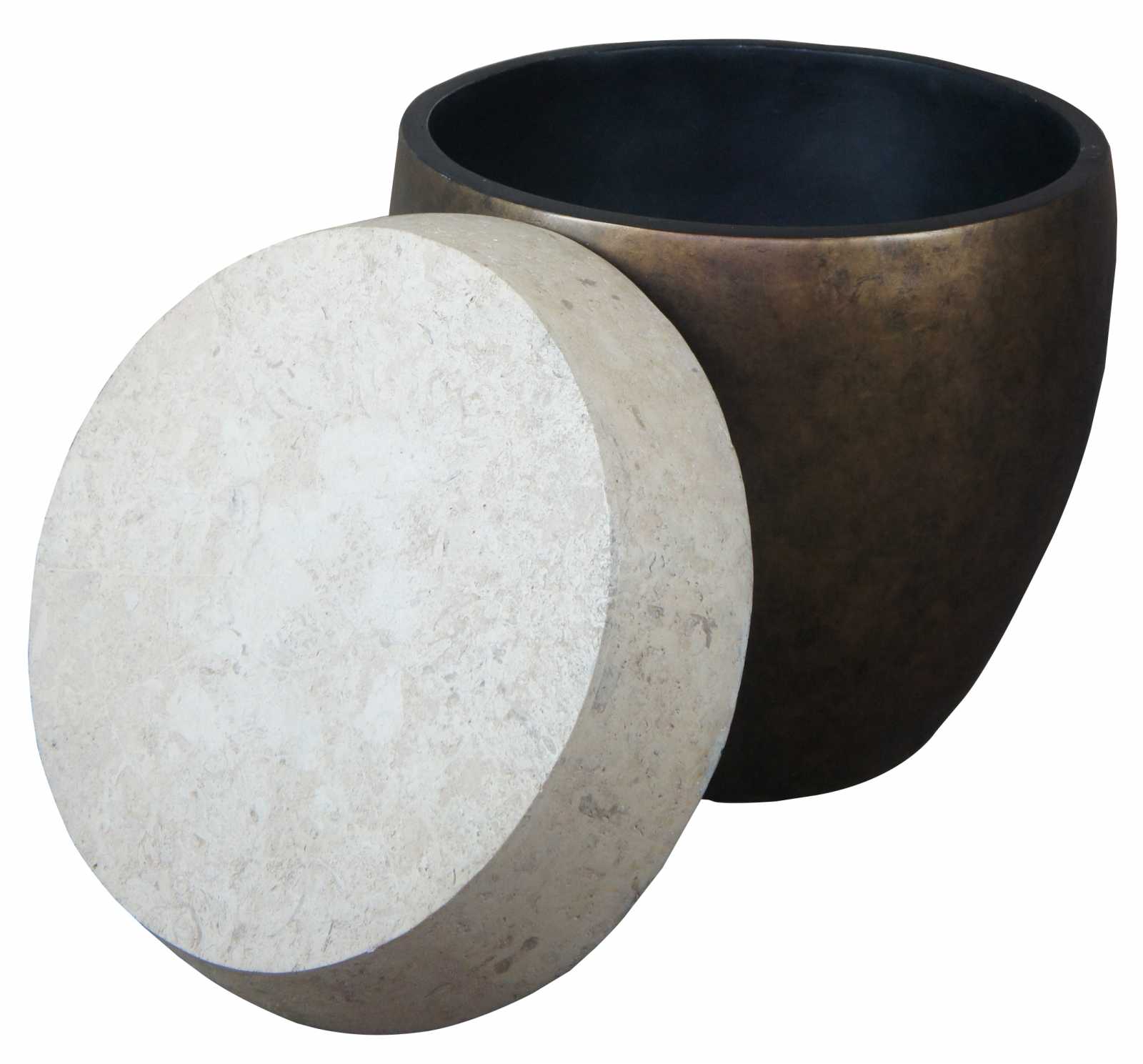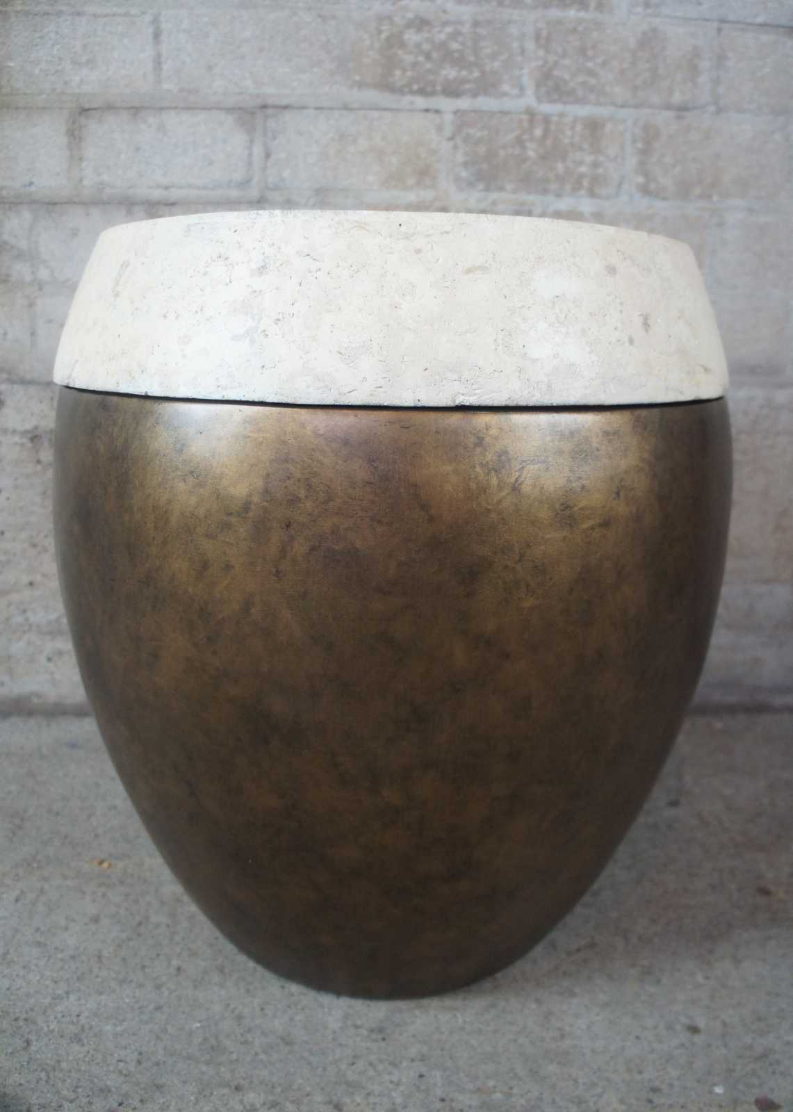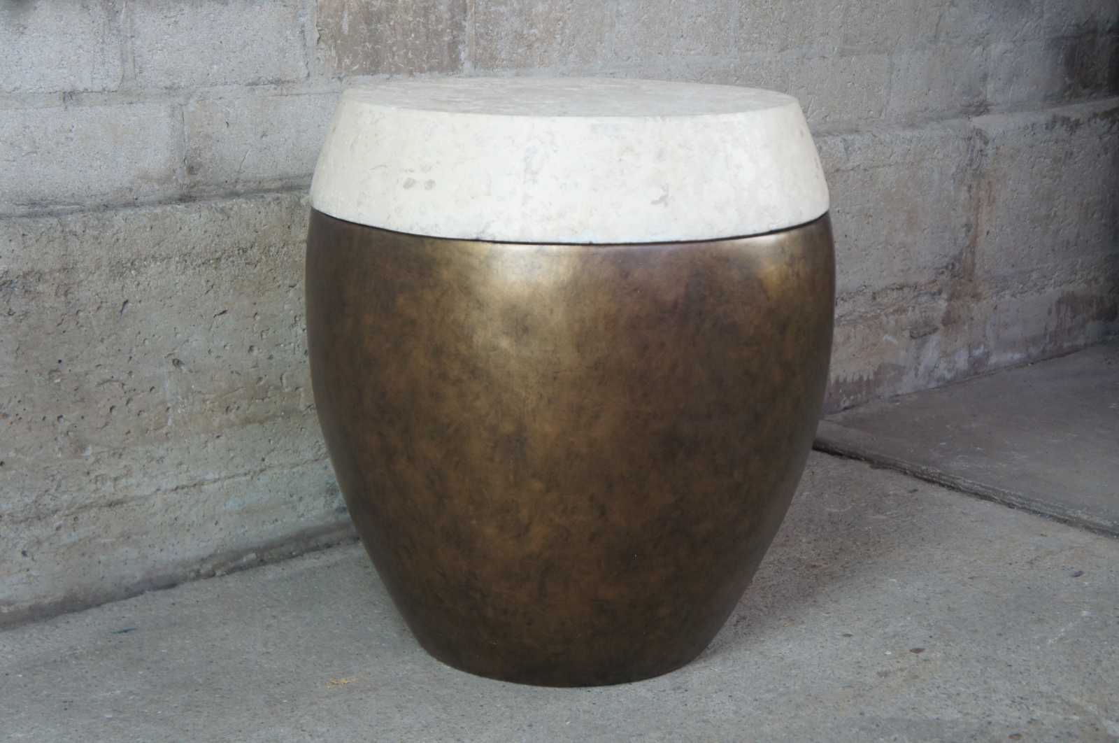 Circa 1990s Henredon Crossroads Collection Taboret garden or drum shaped stool. Features a gold foil finish with faux stone top / lid. Opens to storage compartment.