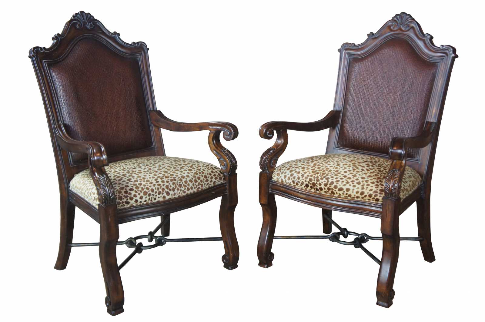 Pair of Thomasville armchairs, part of the Hemmingway collection. Features an old world Italian styling with scrolled acanthus carved arms, a rattan back and iron stretcher connecting each leg.