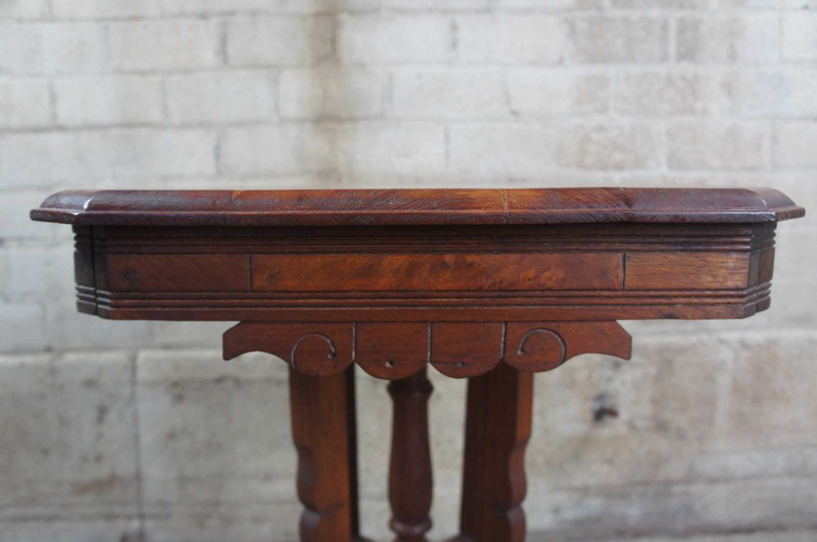 Late Victorian parlor table. Made from walnut with carved accents and burled apron. Castors can be added for a distinctive look.
