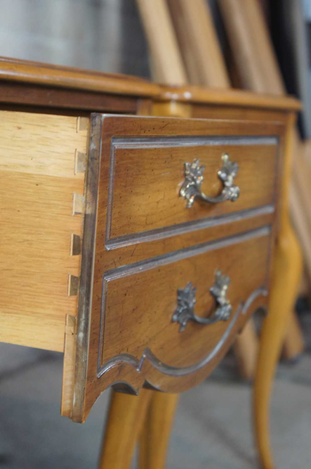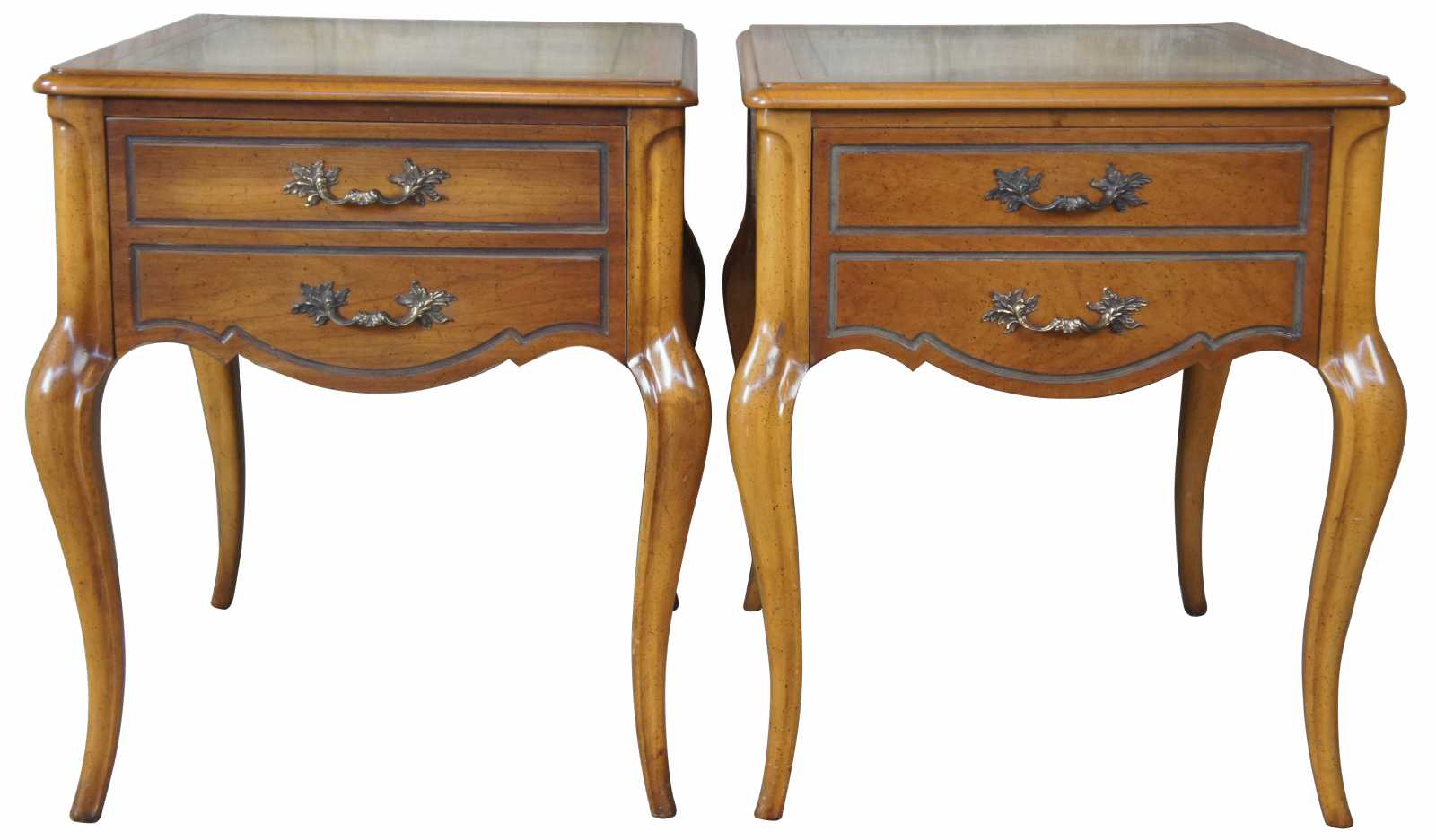 Pair of two circa 1970s ashwood French Provincial style side tables. Each table features a distressed finish with tooled leather top and serpentine aprons and cabriole legs. Includes one large dovetailed drawer, making them perfect for use as nightstands or side tables.