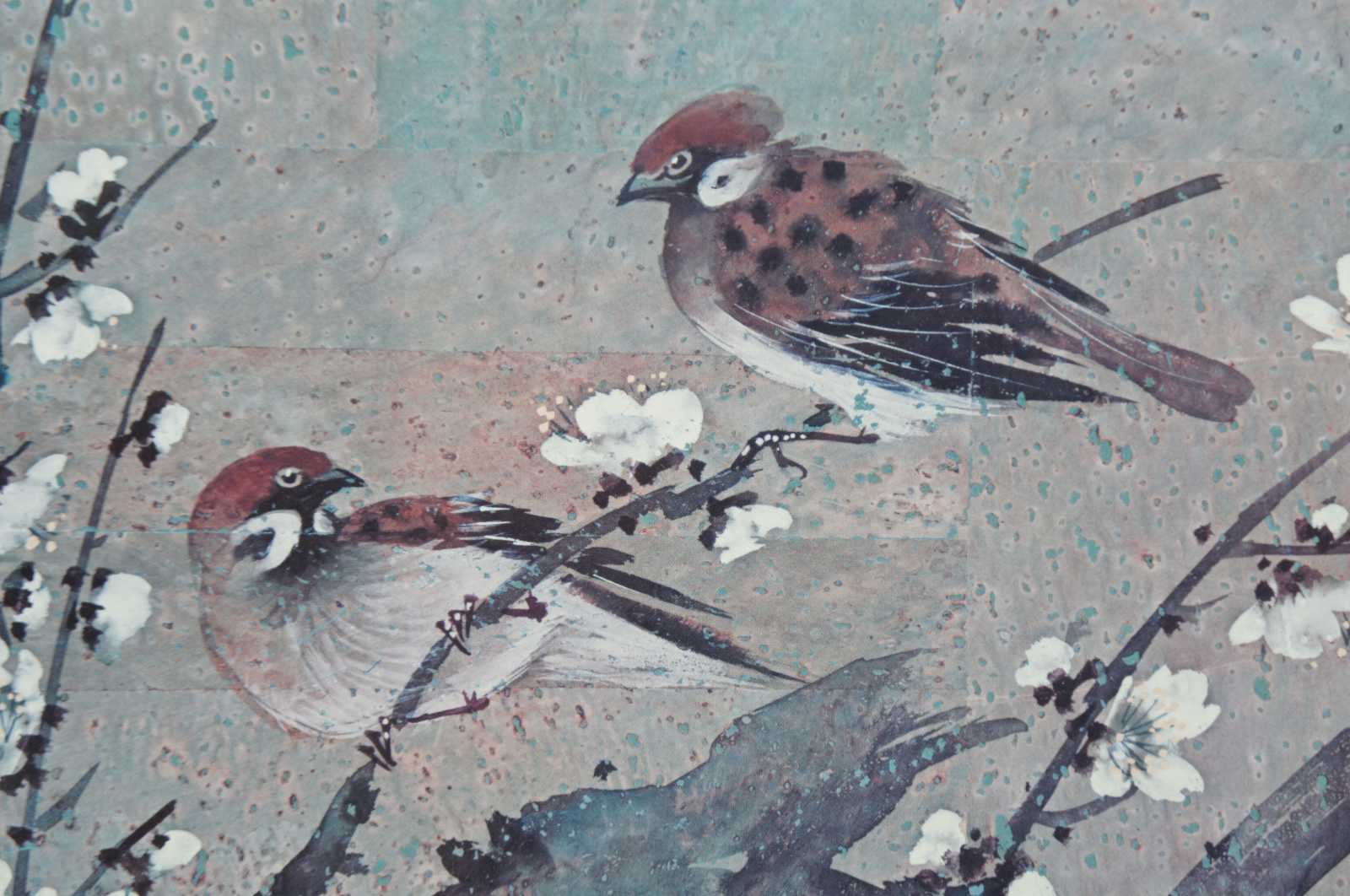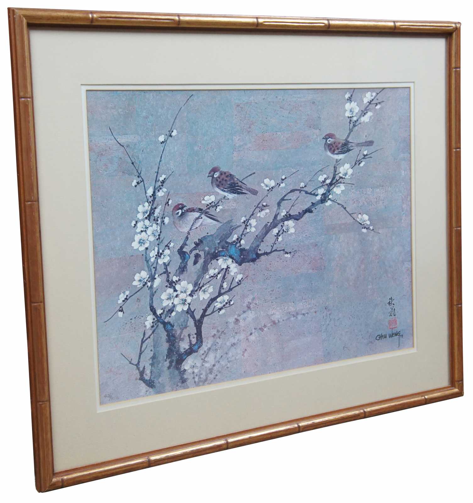 Chiu Weng 1977 Signed Print, ed 476 of 950, framed in faux bamboo. Features birds and cherry blossom trees.