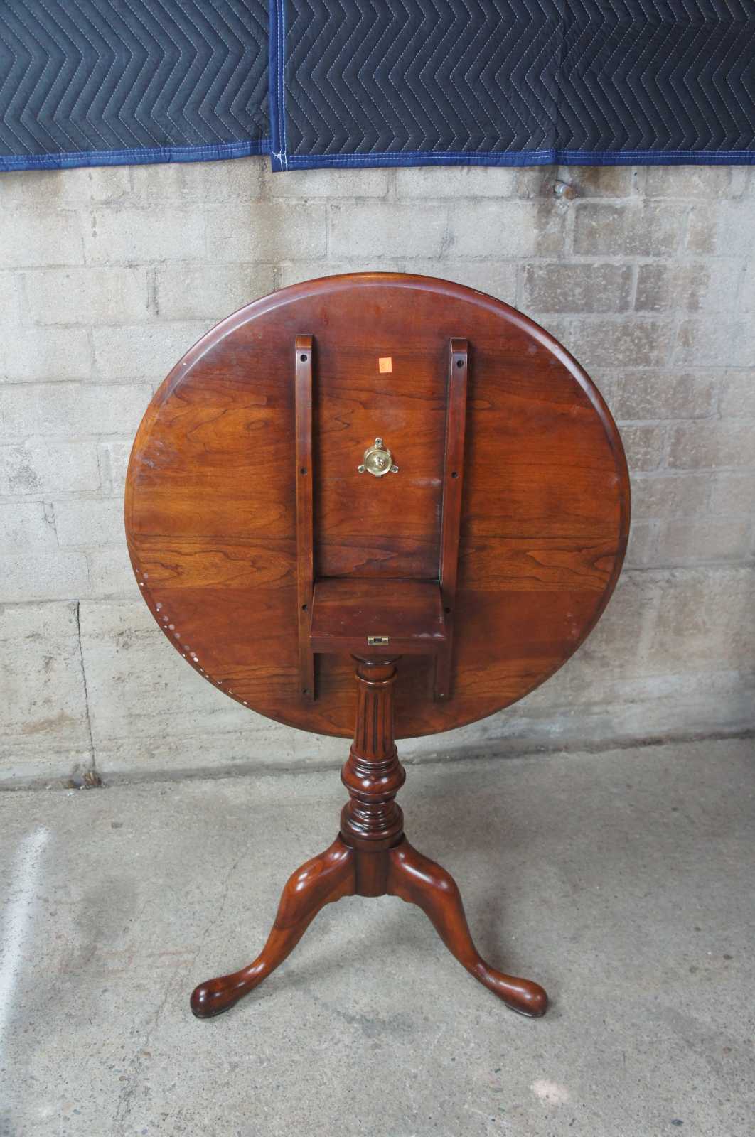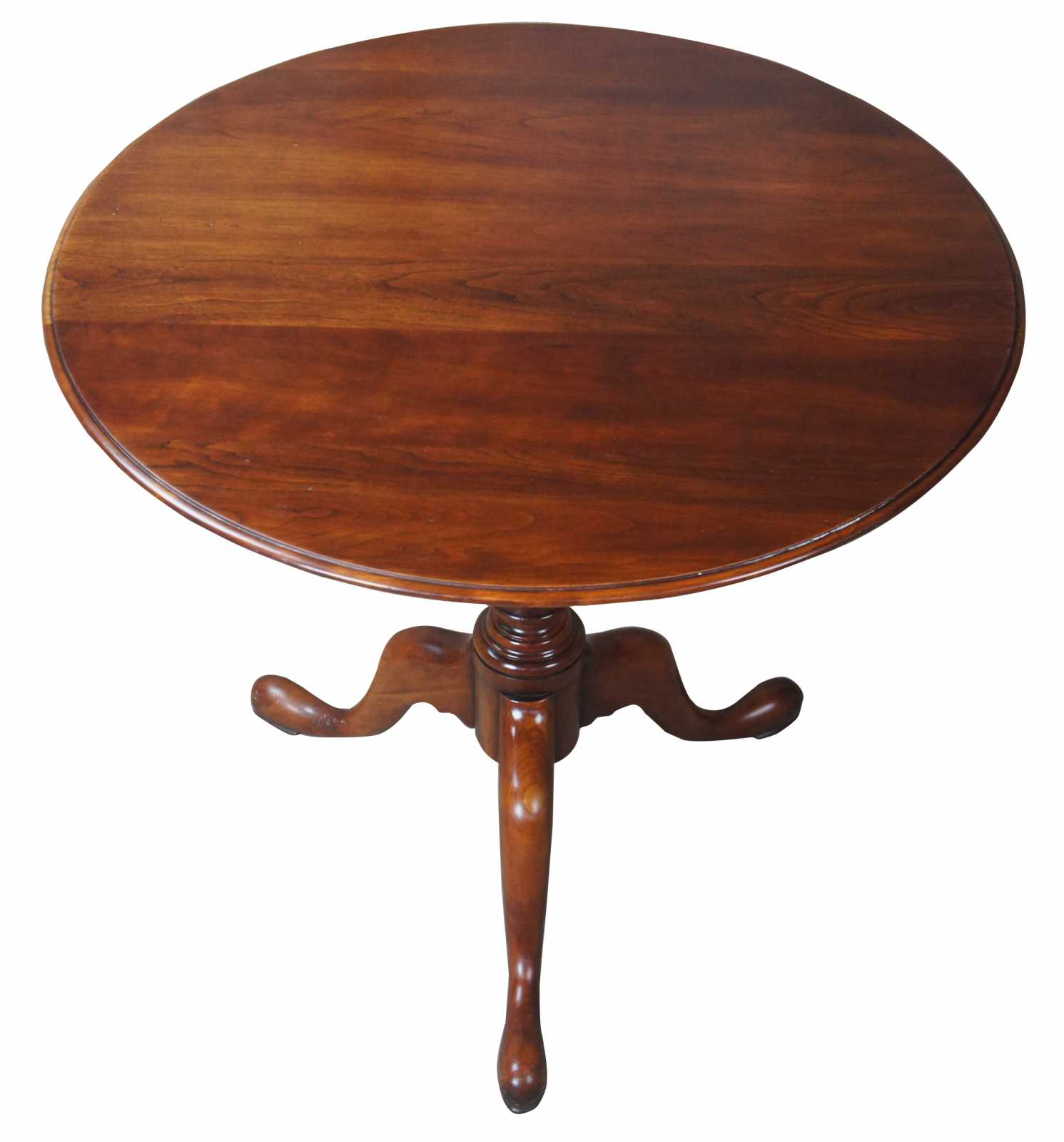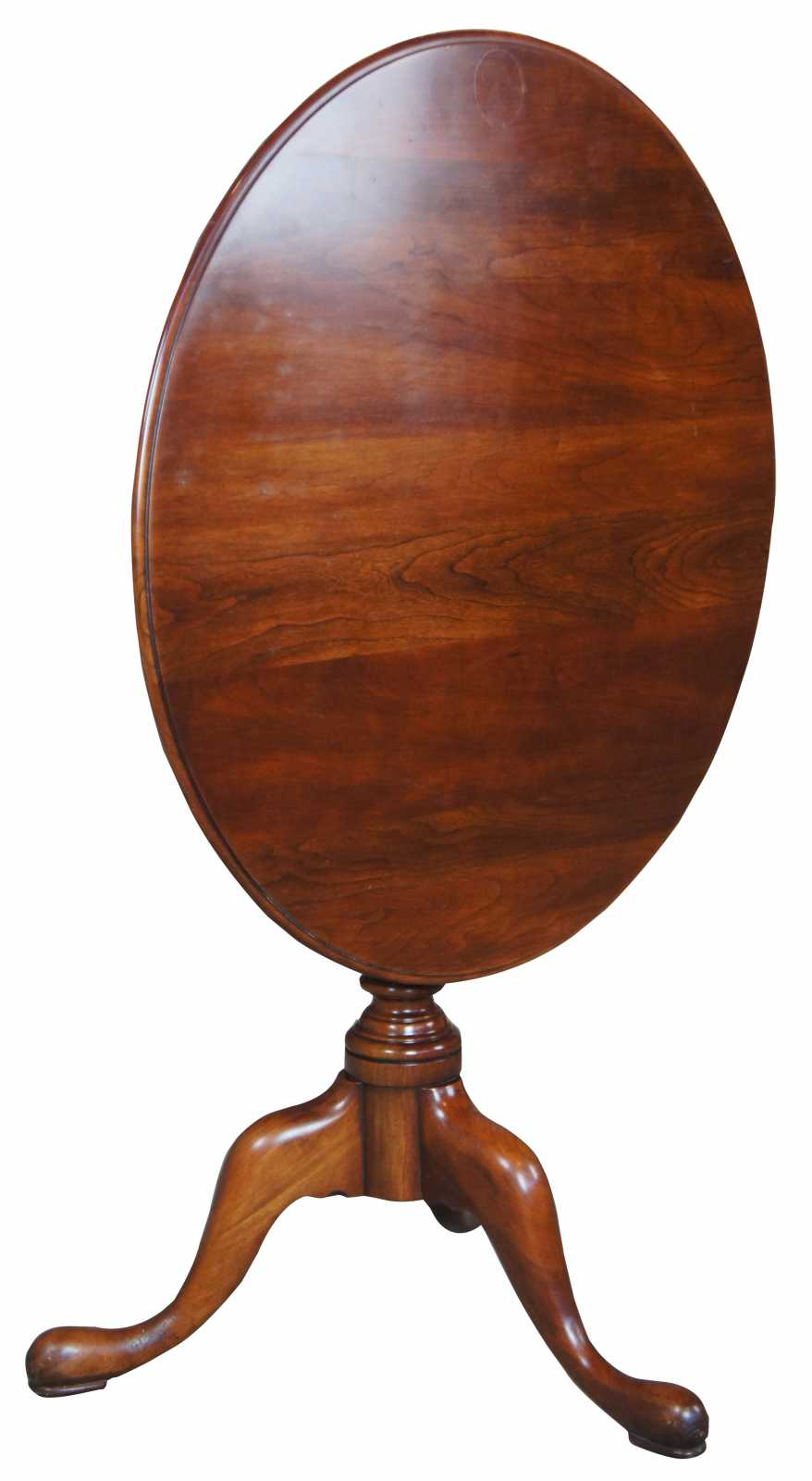 Solid Cherry tilt top table by Statton, circa 1970s. A stylish Queen Anne design with cabriole legs and pad feet. Table top is released via a brass latch underneath the base. Centennial Finish.