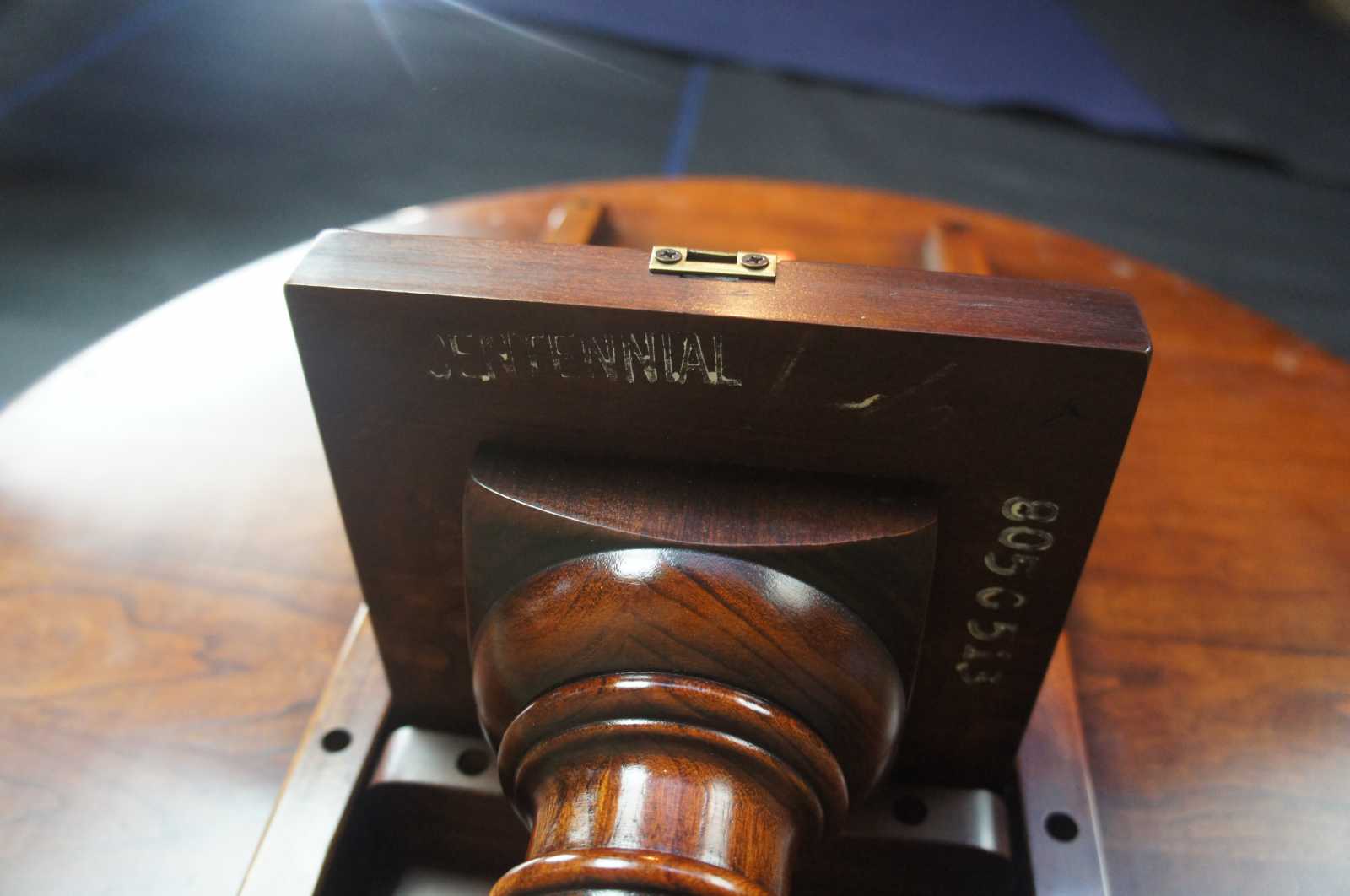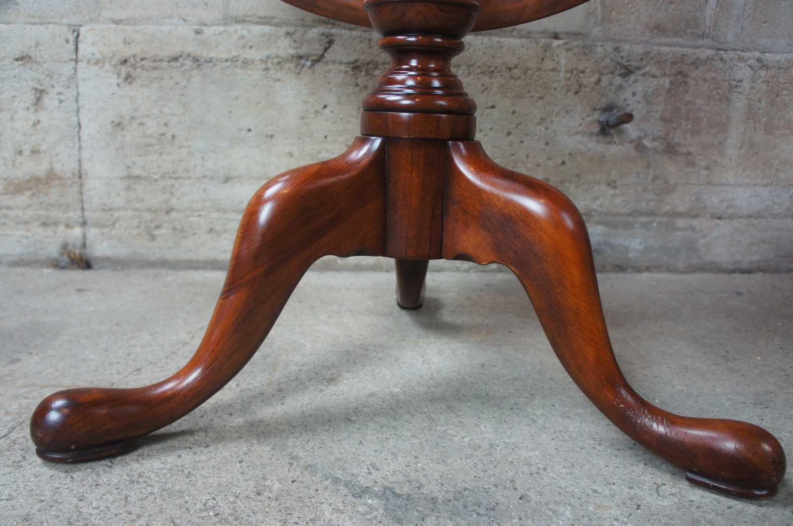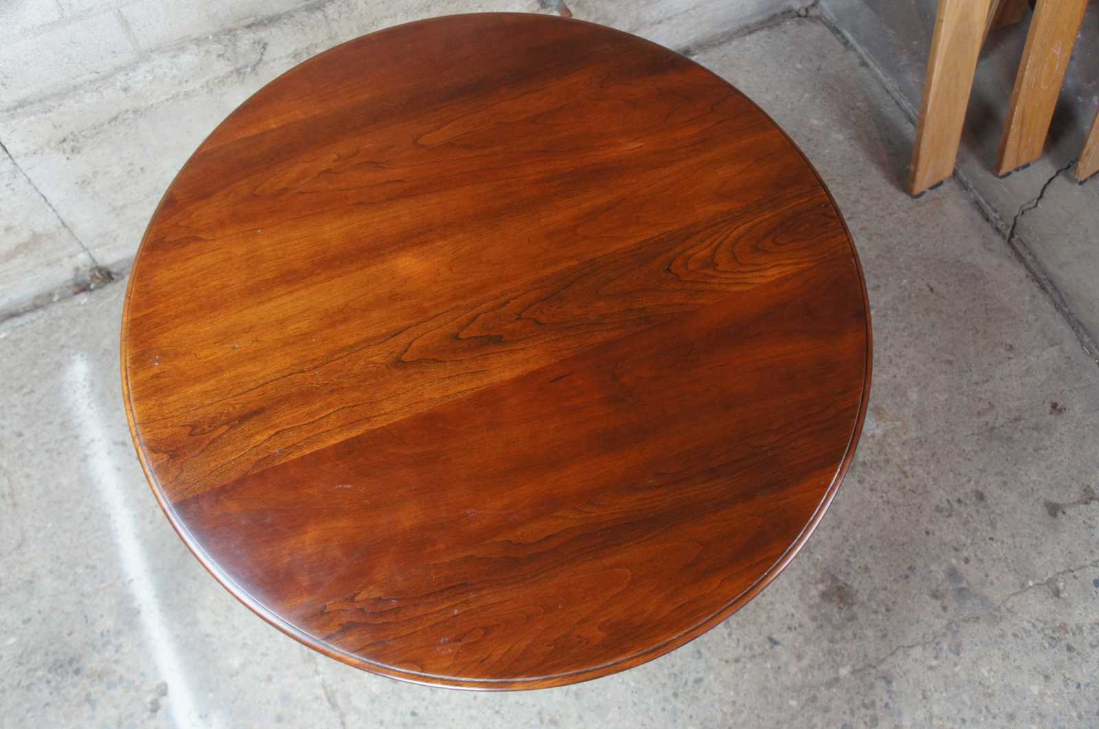 Solid Cherry tilt top table by Statton, circa 1970s. A stylish Queen Anne design with cabriole legs and pad feet. Table top is released via a brass latch underneath the base. Centennial Finish.
