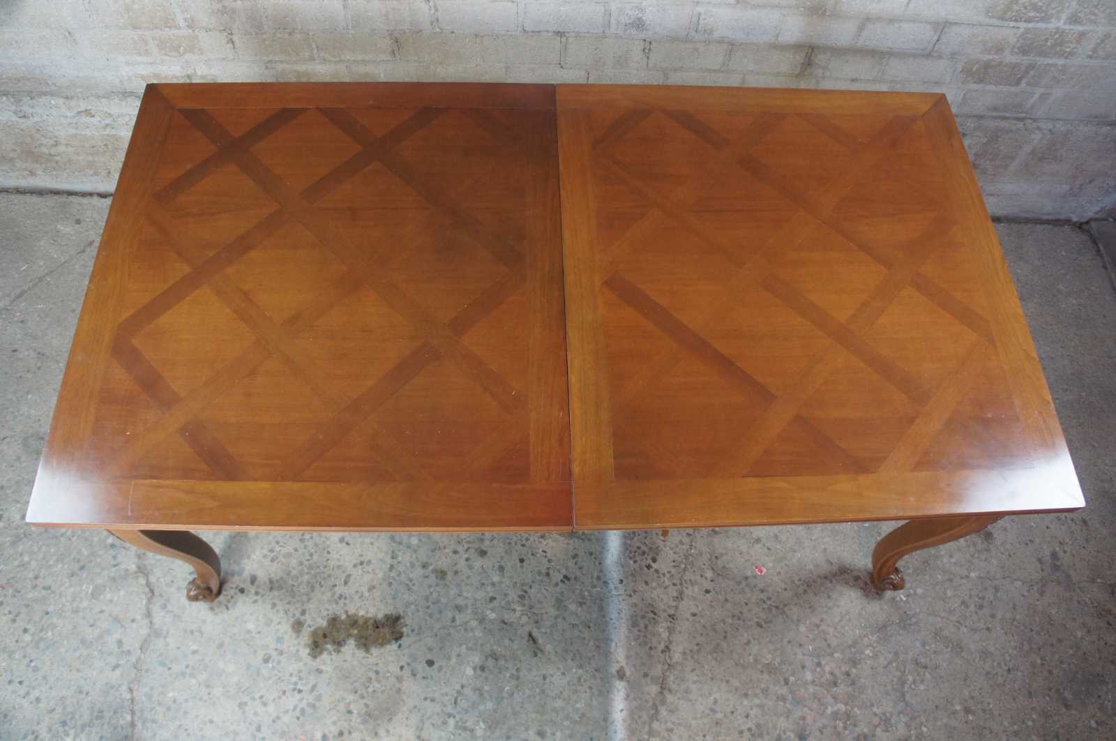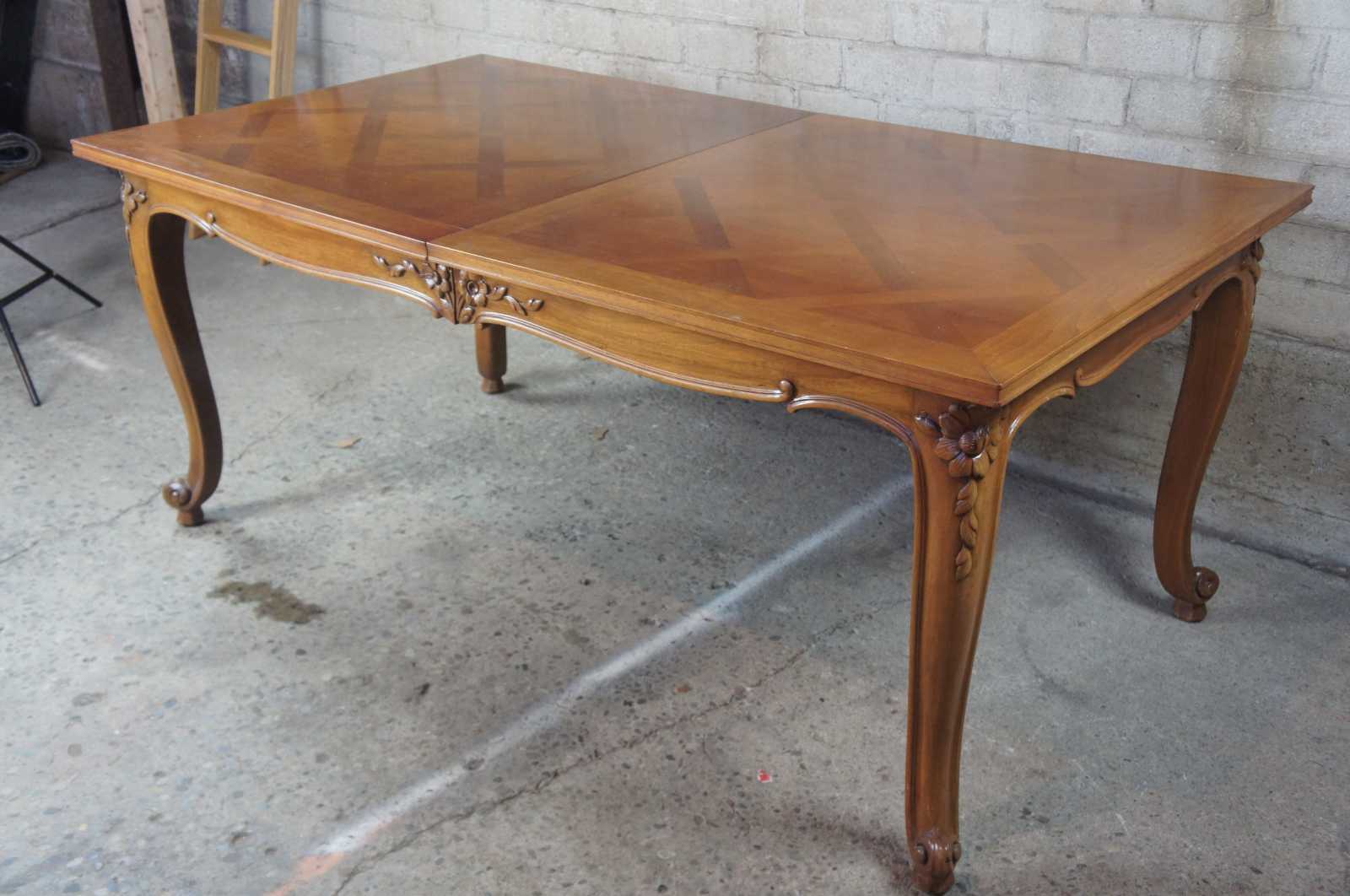 Early 20th century French dining table. Made from Walnut with floral carved embellishments and a parquetry top. Features cabriole legs with scrolled foot. Includes two leaves.