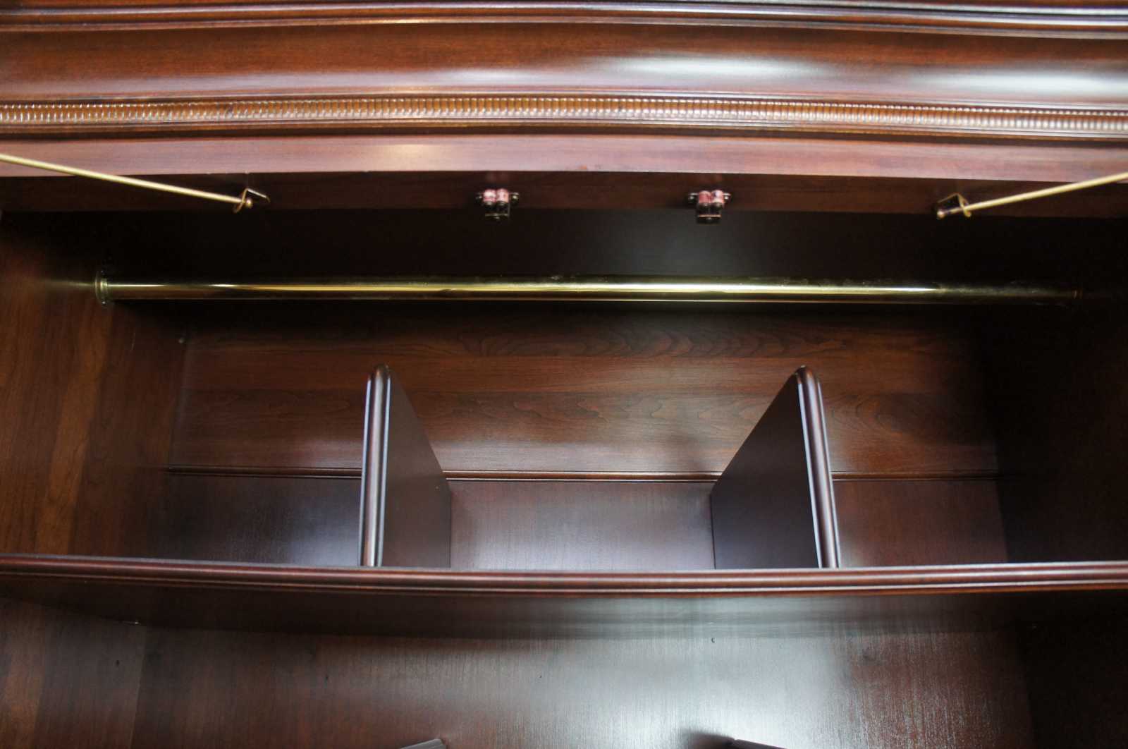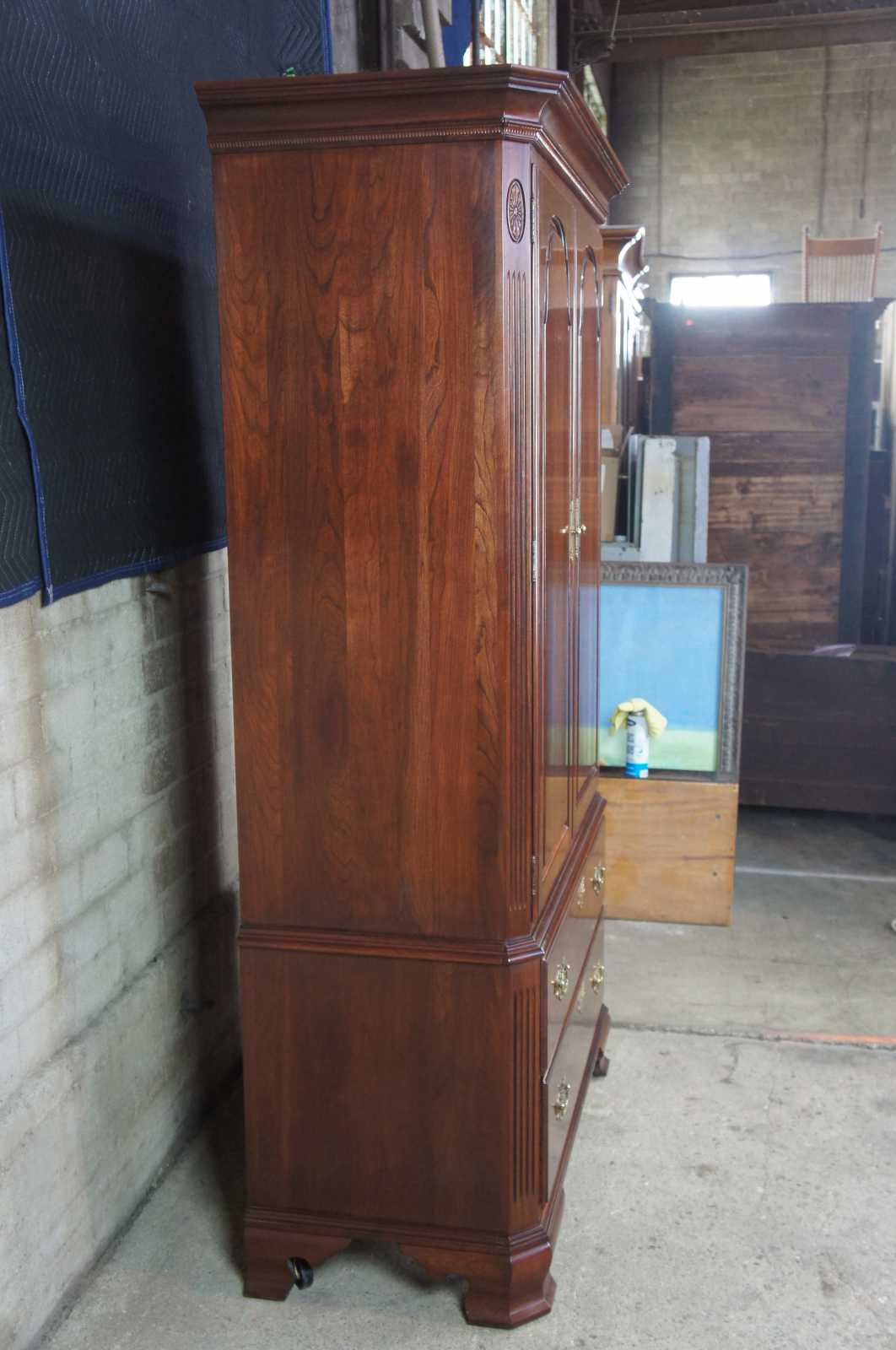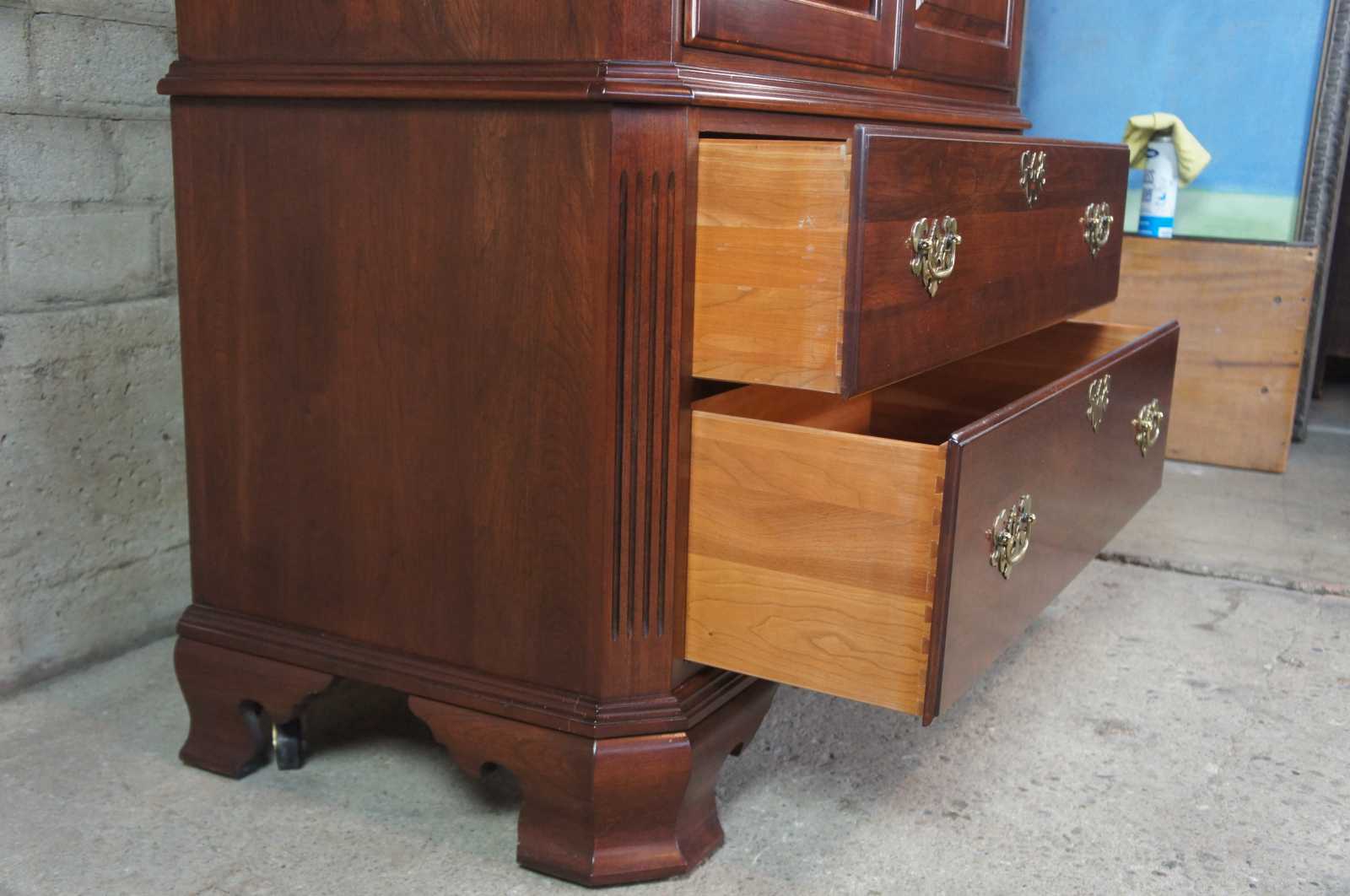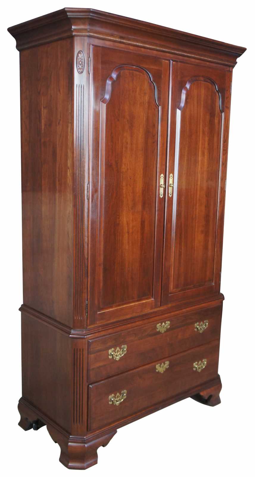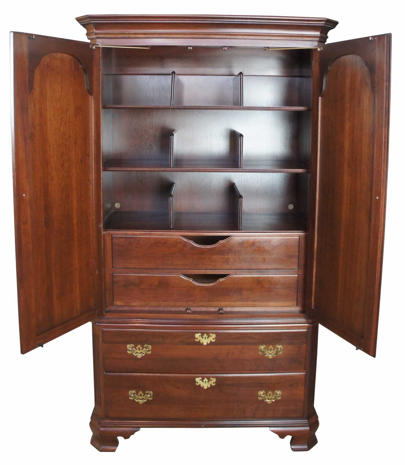 Circa 1991 Ethan Allen Georgian Court Chippendale linen press or armoire. Made from solid cherry. Opens to compartments that are removeable for a hanging bar or TV / electronics. Two interior drawers and two lower drawers for storage.