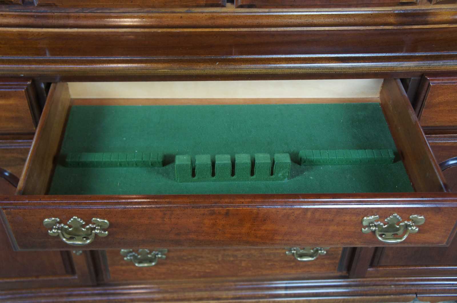 American Drew Cherry Grove display cabinet, circa 1980s. Features chippendale styling with fretwork over the two center doors. Includes five drawers and two outer cabinets, central drawer is lined with silverware cloth. Interior illuminates.