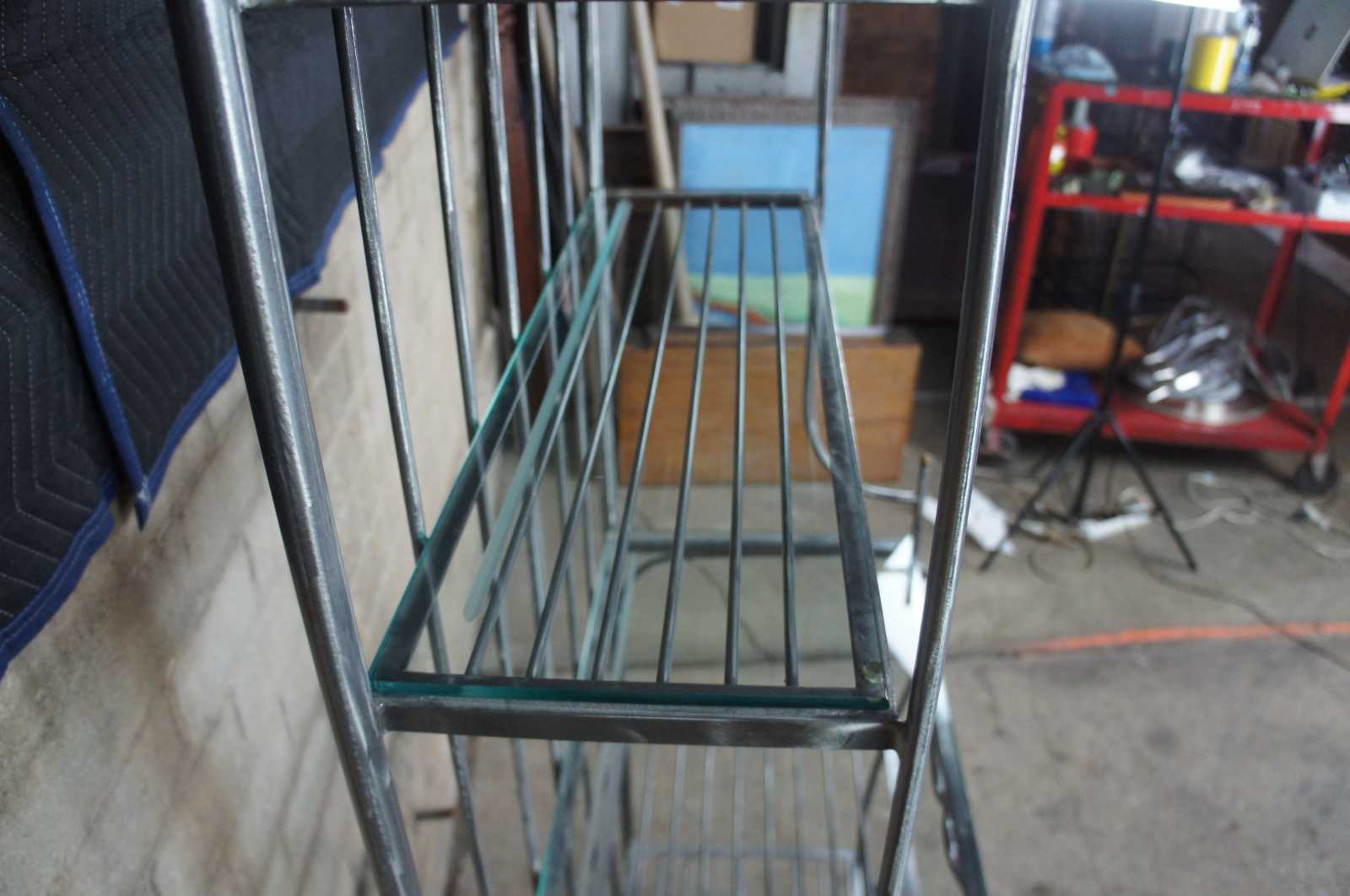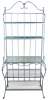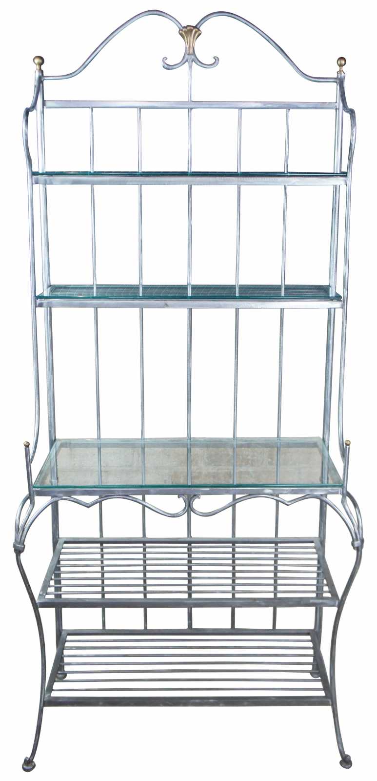 Ethan Allen Iron bakers rack. Part of the Legacy Collection with French Country styling, circa 1990s. Silvertone with five shelves for hanging pots and pans. Glass was added to upper shelves for additional display.