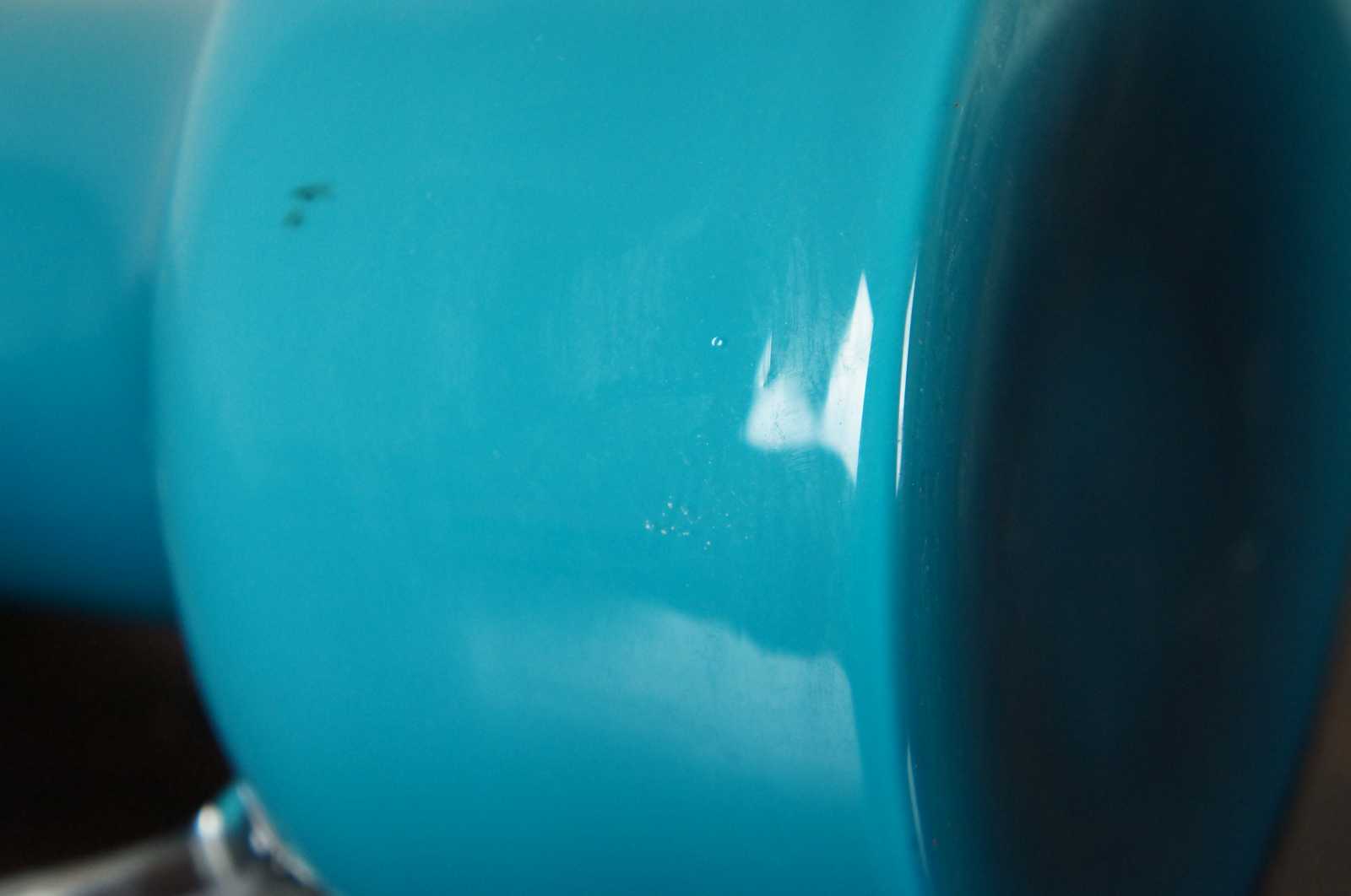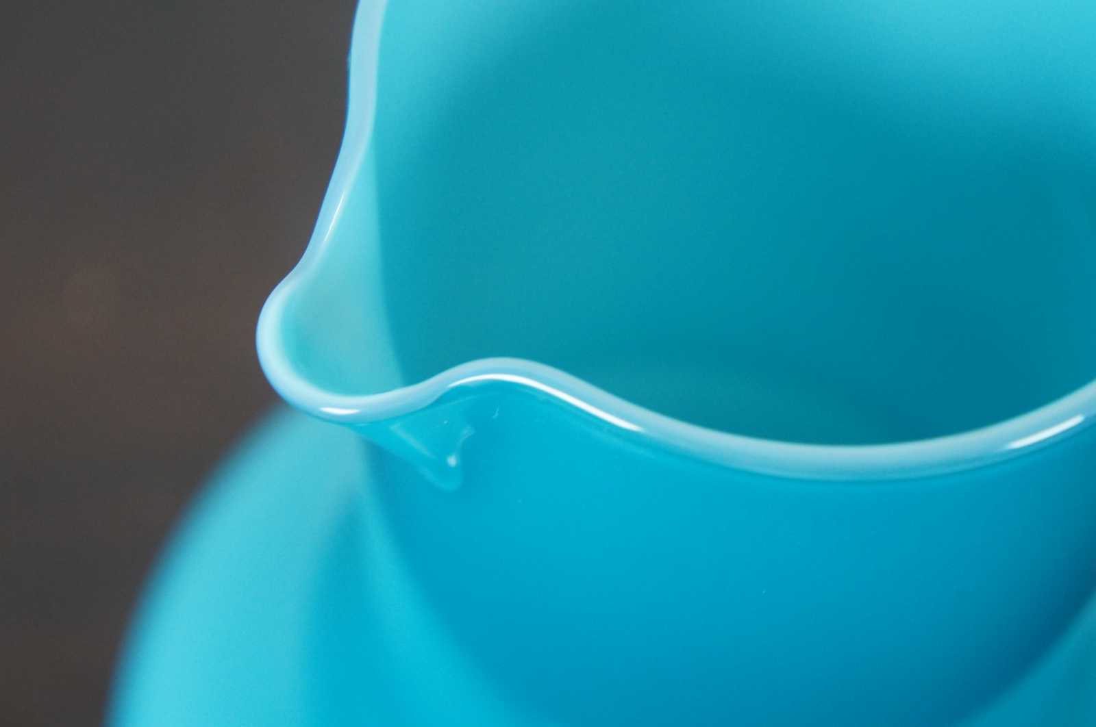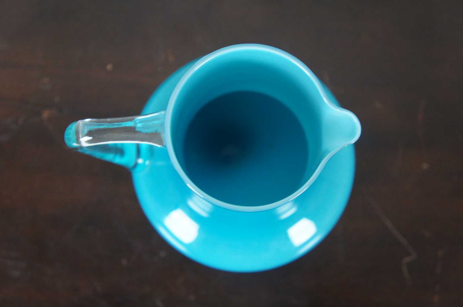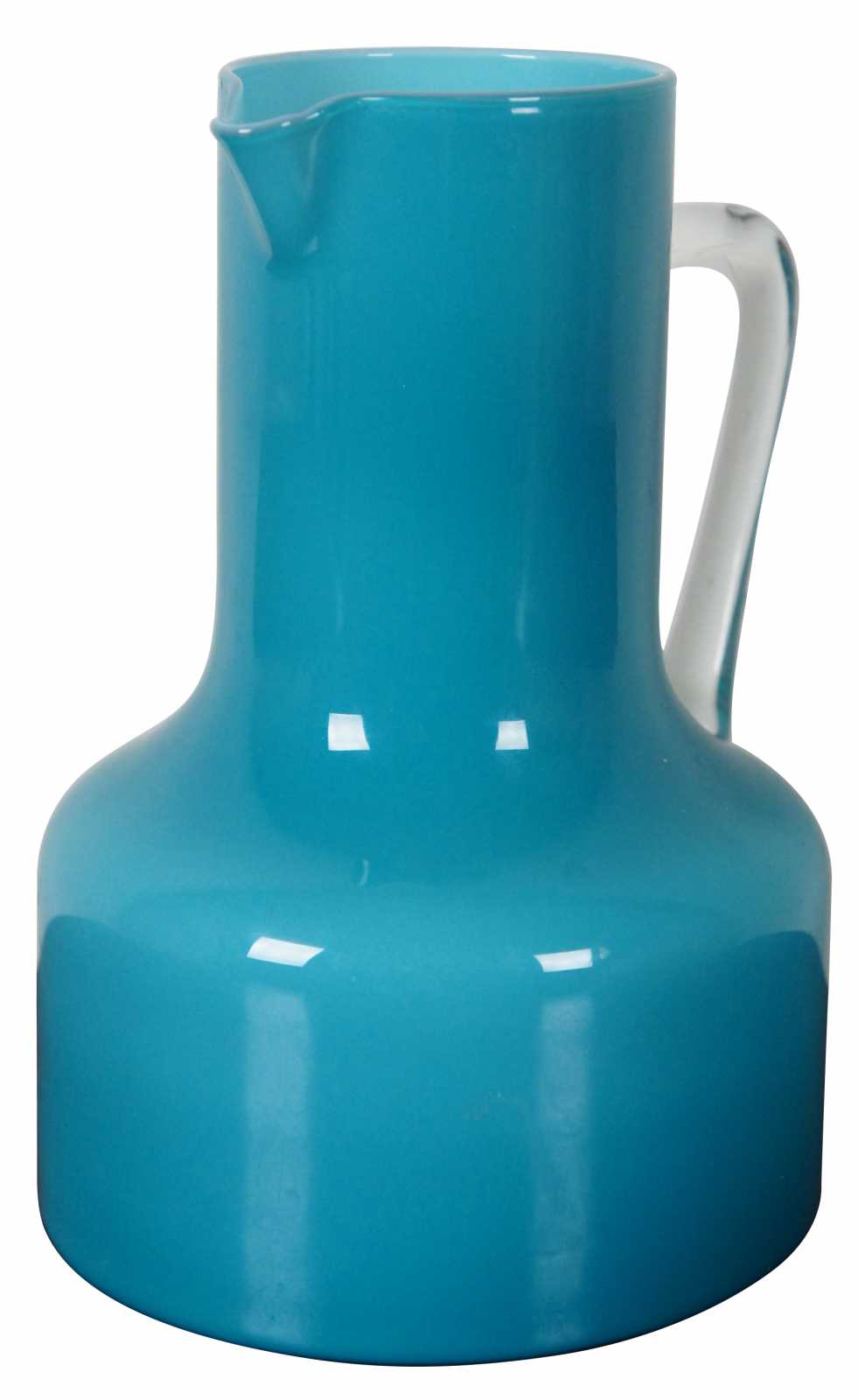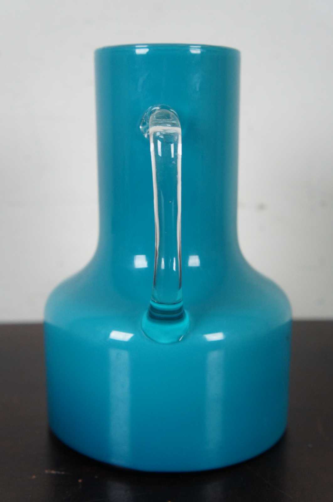 Vintage mid century modern blue glass water picture. Features vibrant blue with clear handle.