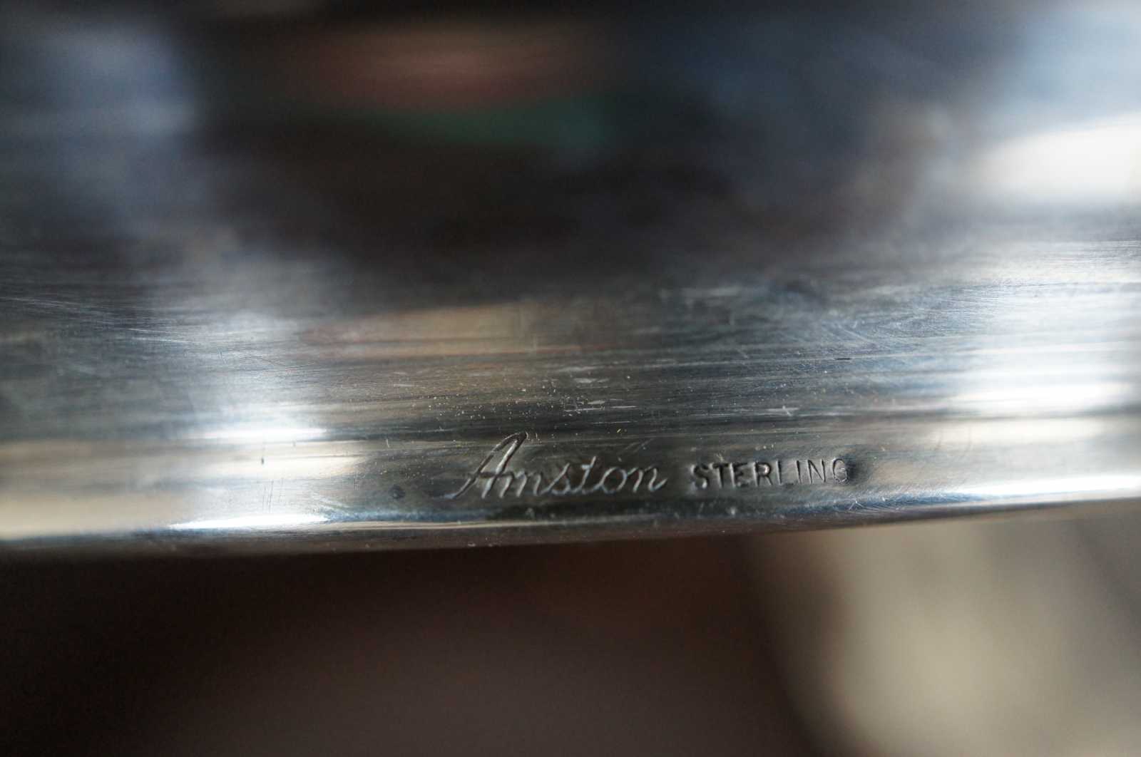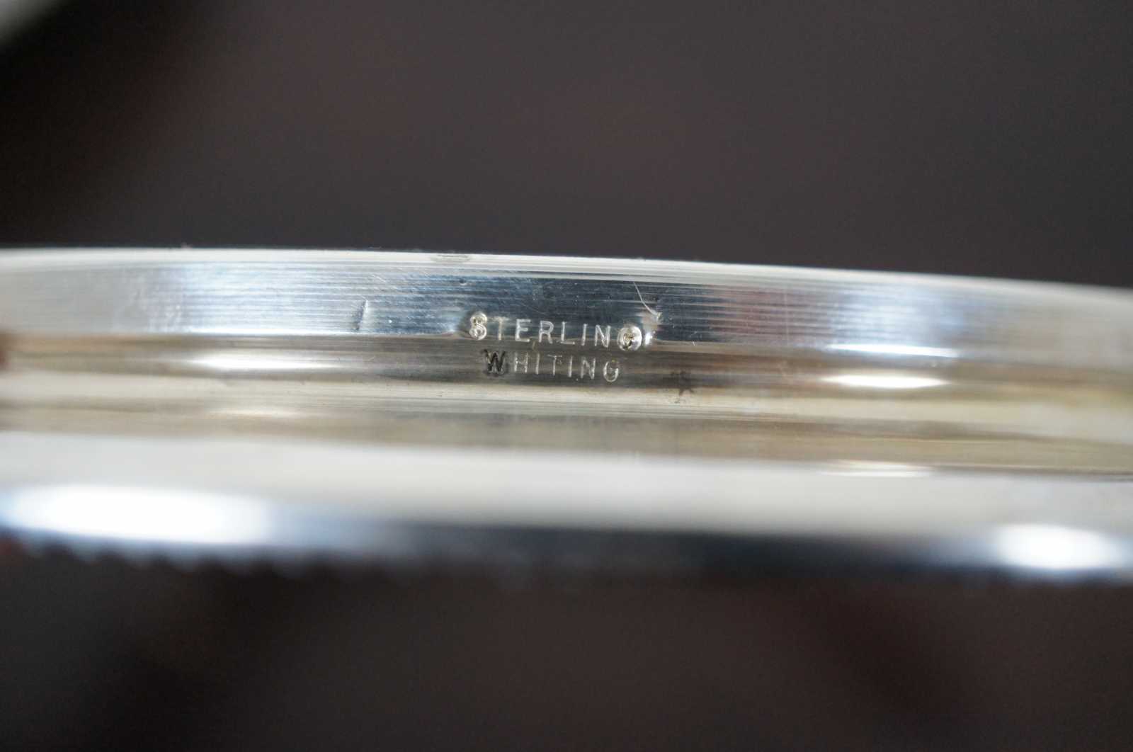 Sterling Silver Whiting and Amston etched glass wine coasters. One features a pierced or reticulated edge and the other features a beaded or dotted design. Both have a starburst or sunburst etching at center. Marked sterling.