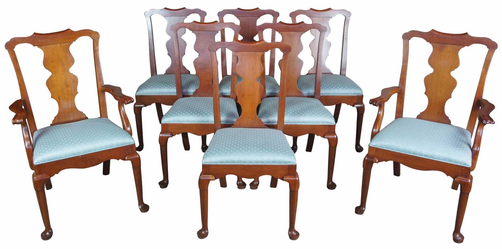 Eight Penn. House dining chairs, circa 1960s, 760-1918. Made from cherry with a blend of early american and queen anne styling. Features a vase shaped splat, carved rail and pad feet.