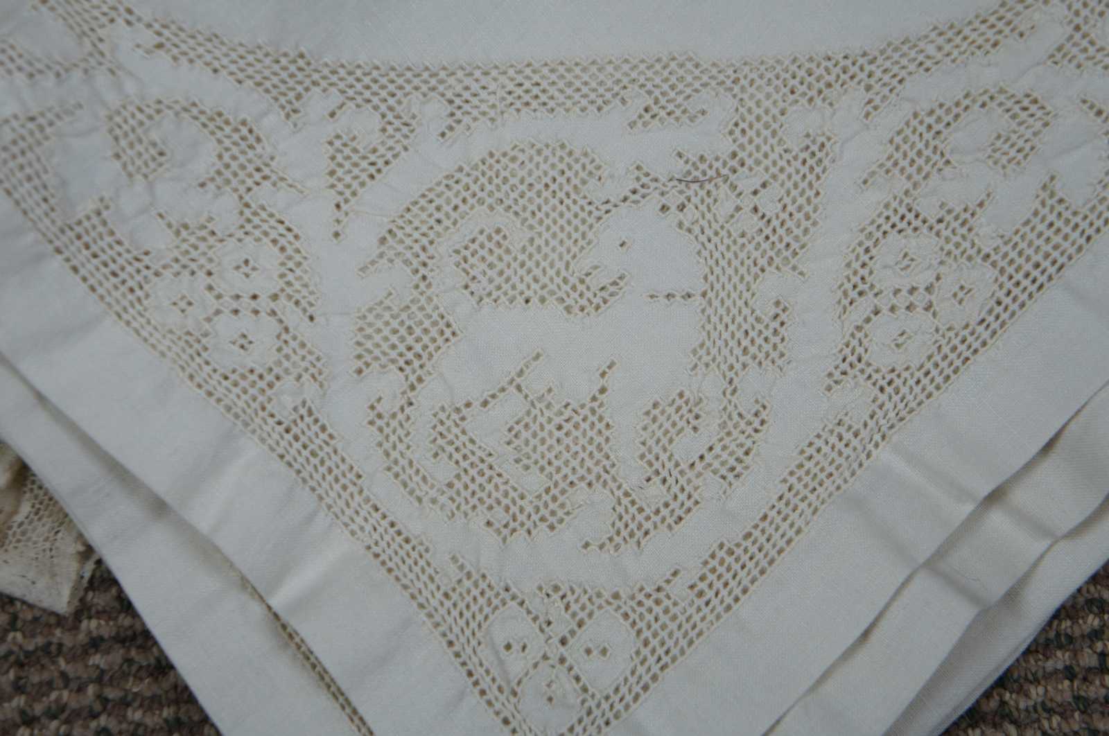 Very Good - Yellowing/discoloration from age; couple of minor pulls/holes to corner of lace/net tablecloths; see pictures