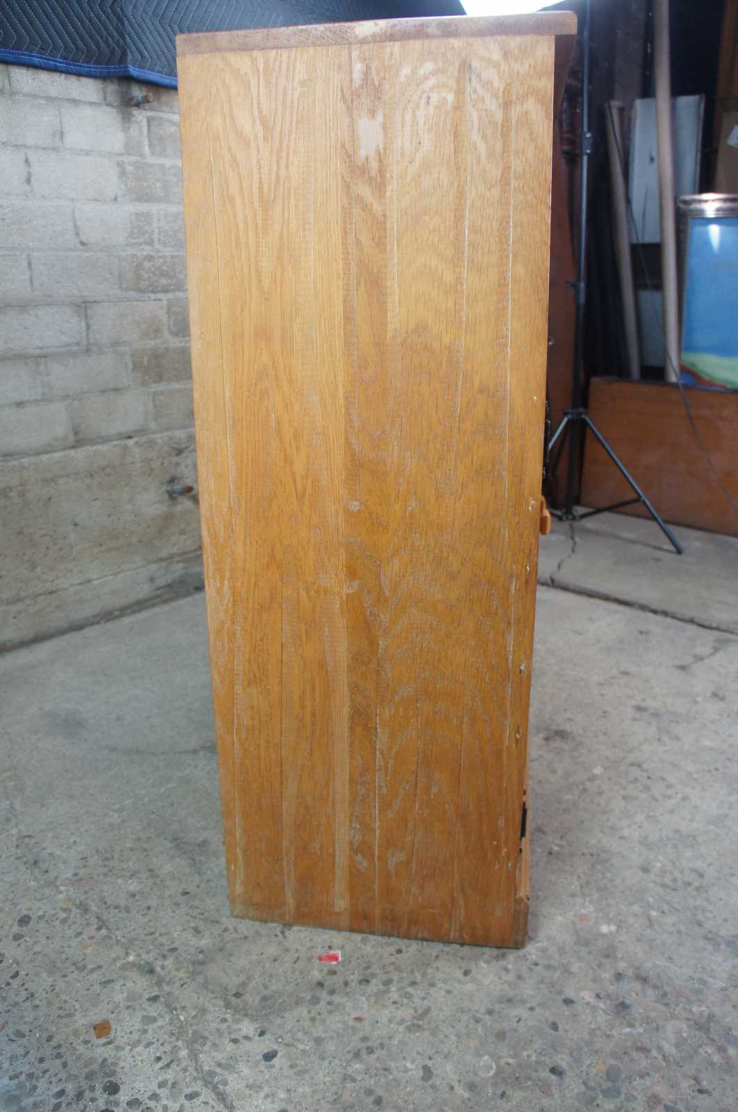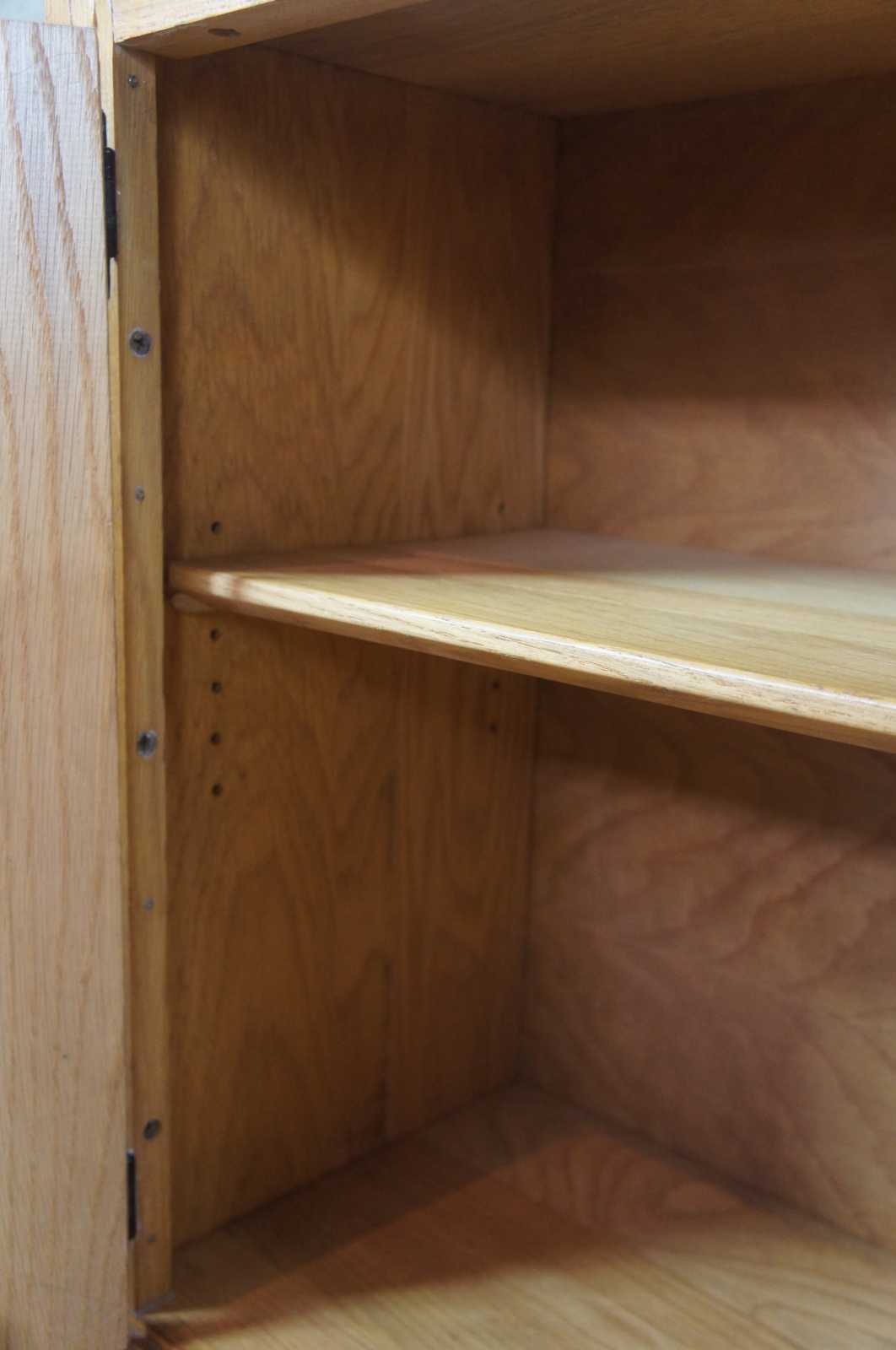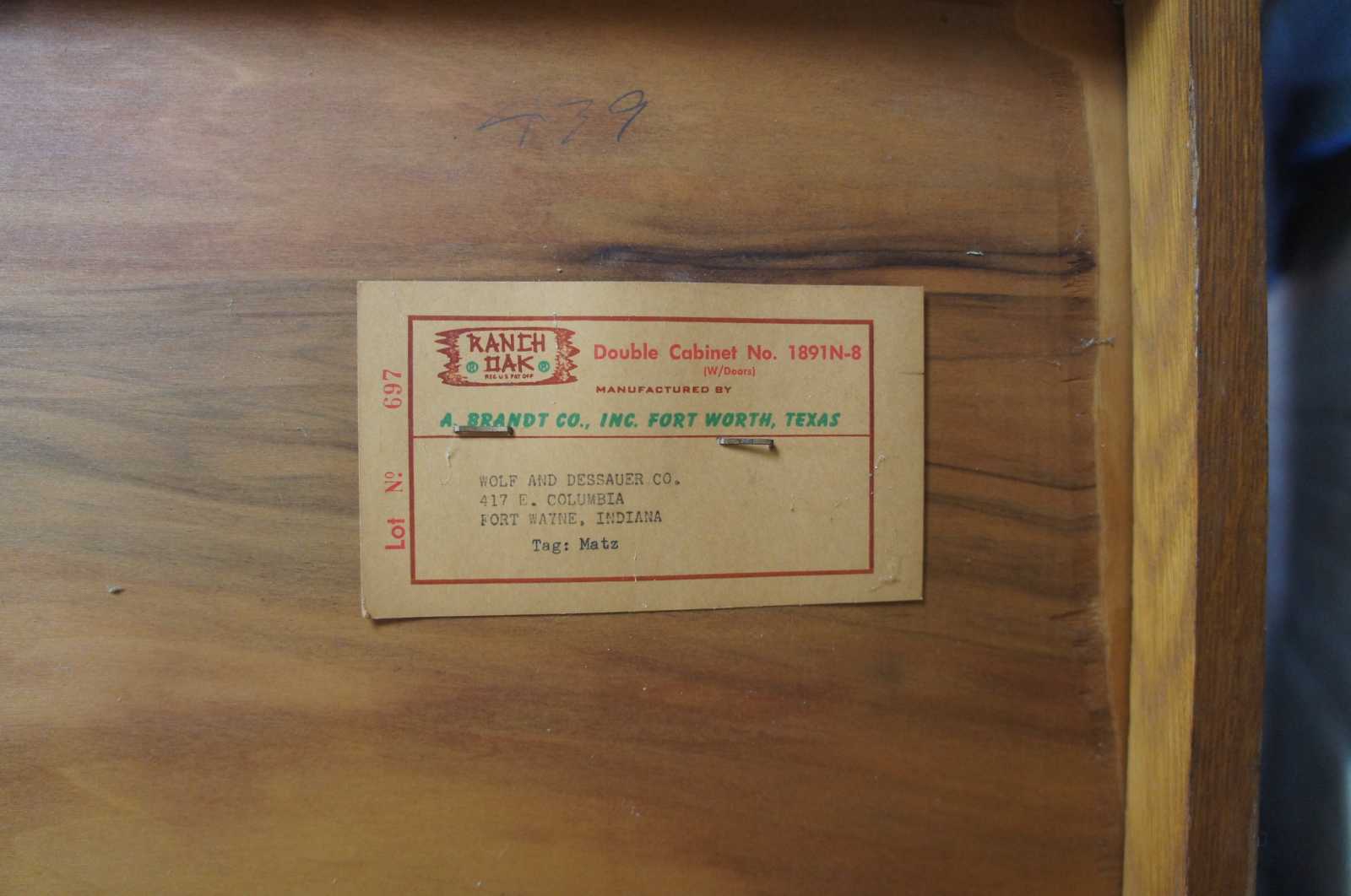 Circa 1960s A. Brandt Ranch Oak Double Cabinet #1891N-8 with doors. The double cabinet or bookcase features a rustic design with two doors and inset shelf. Great for use as a console or media stand.
