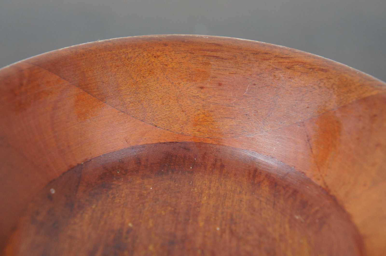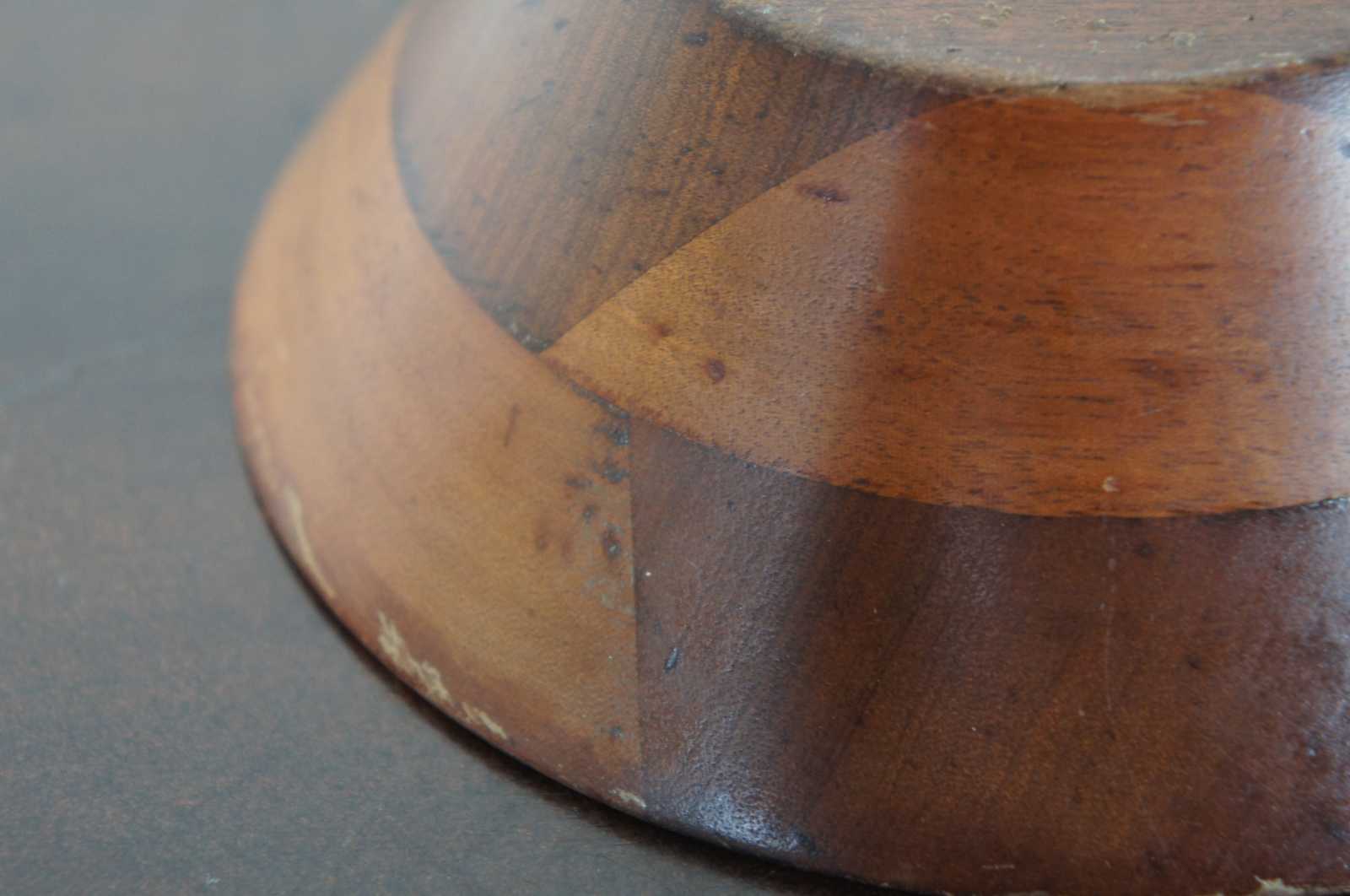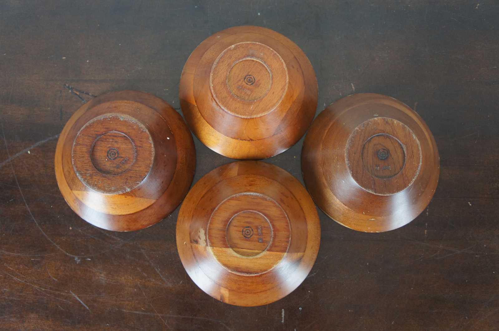 Wooden salad or soup bowls from Japan. Features geometric detail, marked on base.