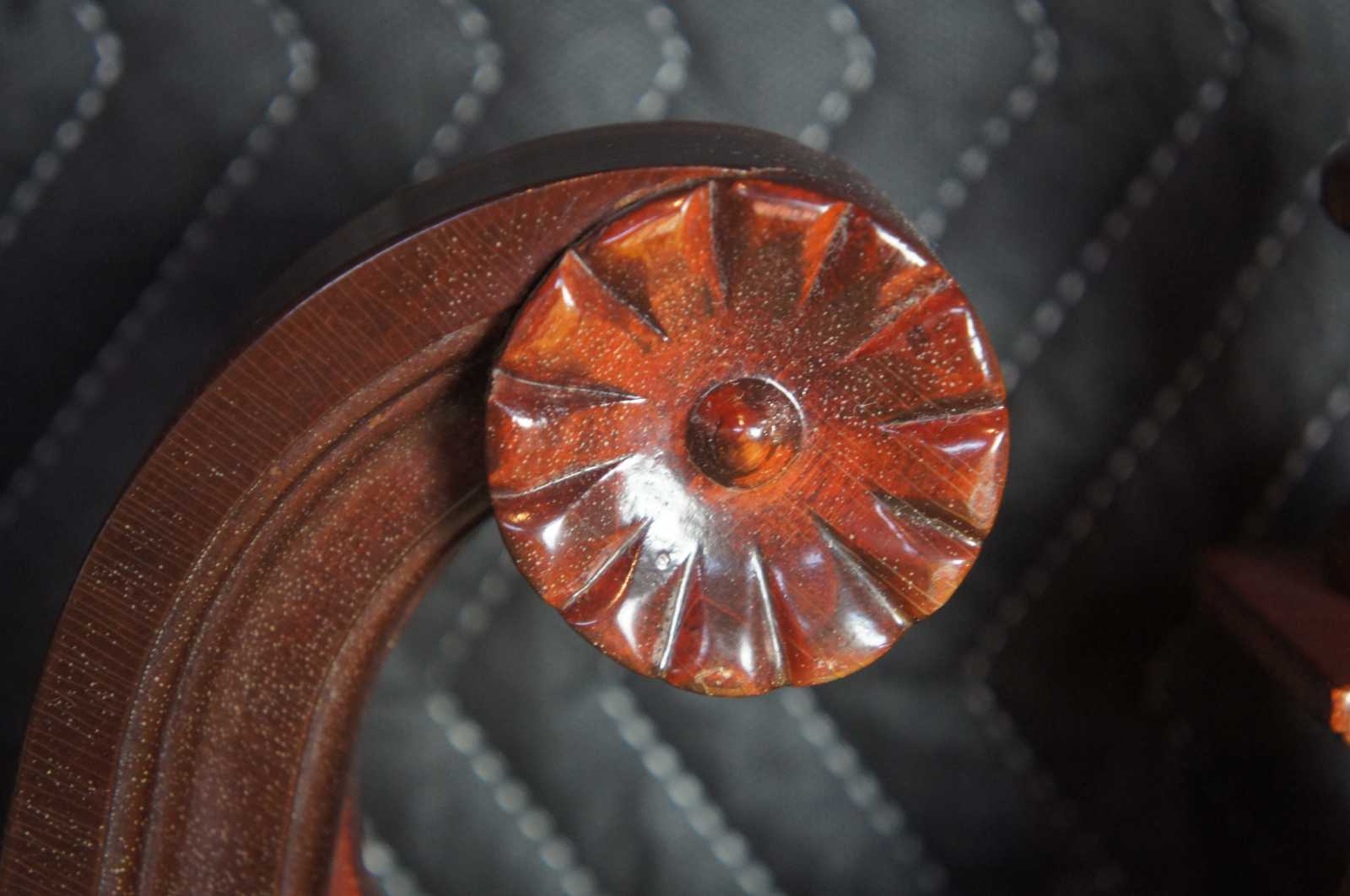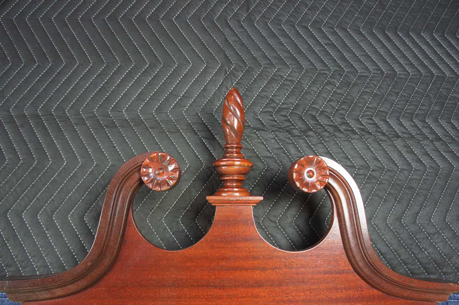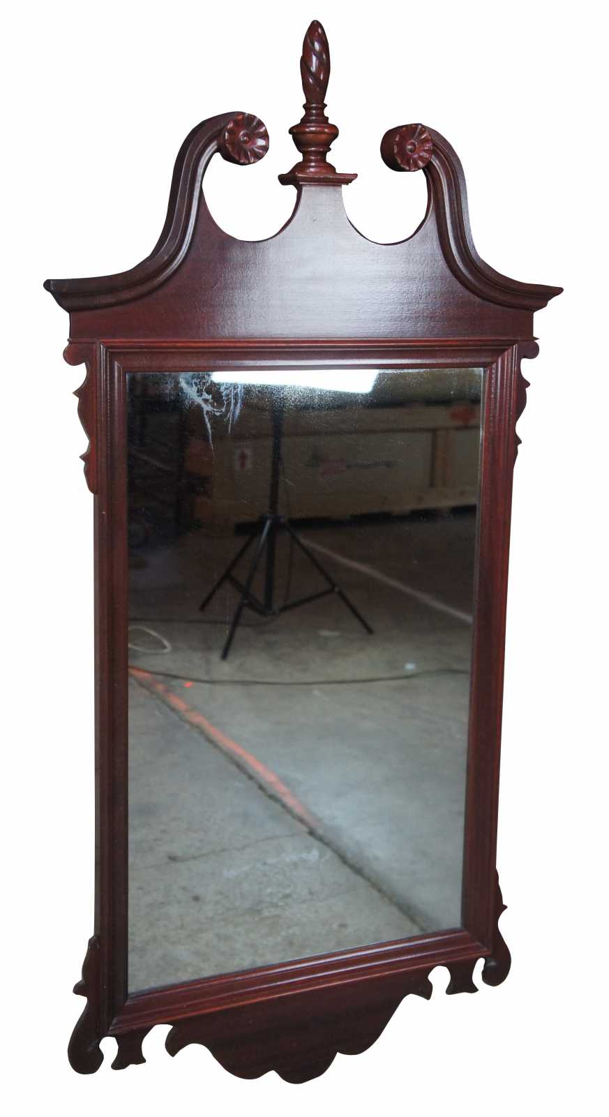 Circa 1950s Federal Style wall mirror. Made from mahogany with scrolled broken pediment and twisted urn finial.