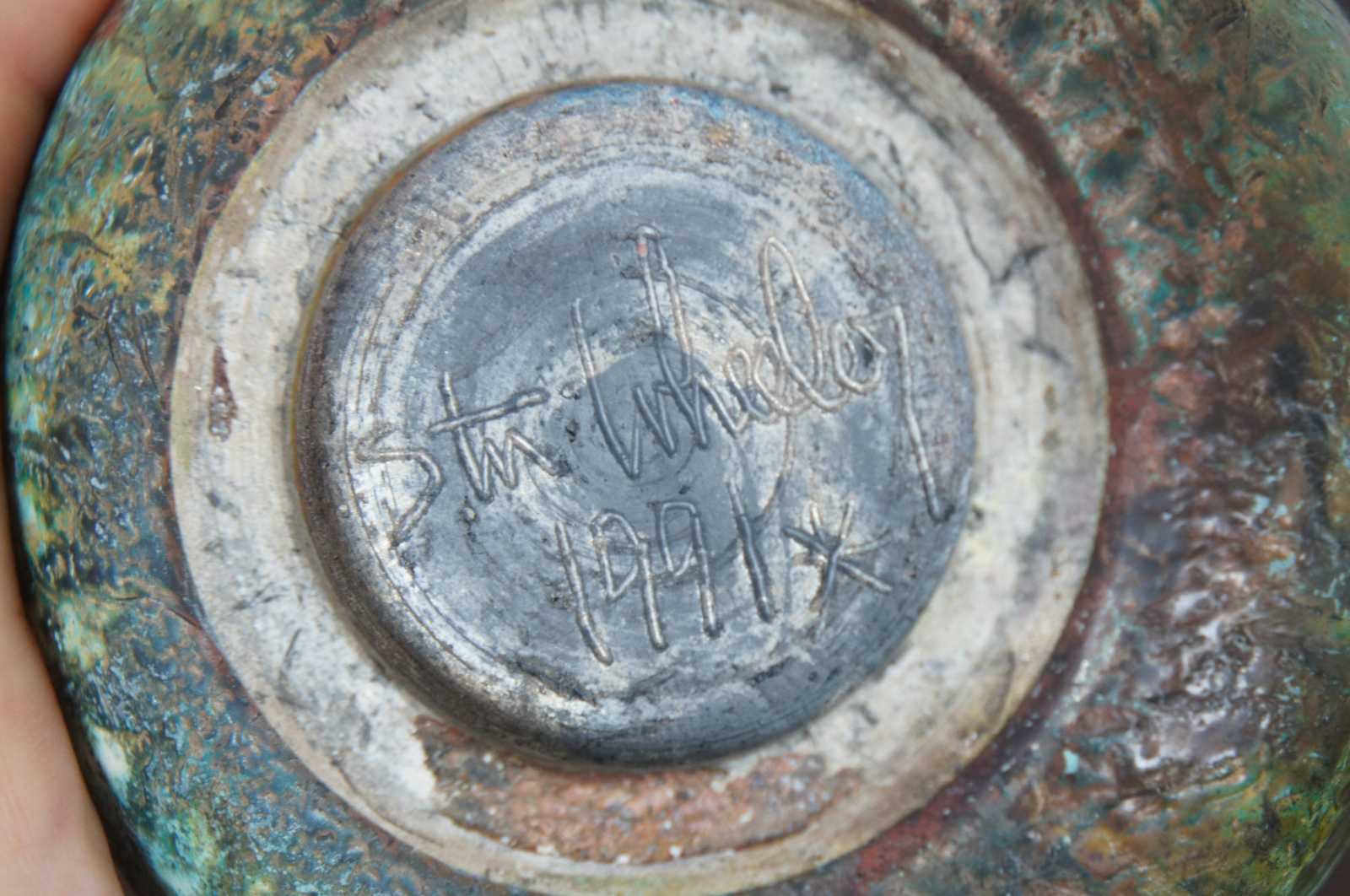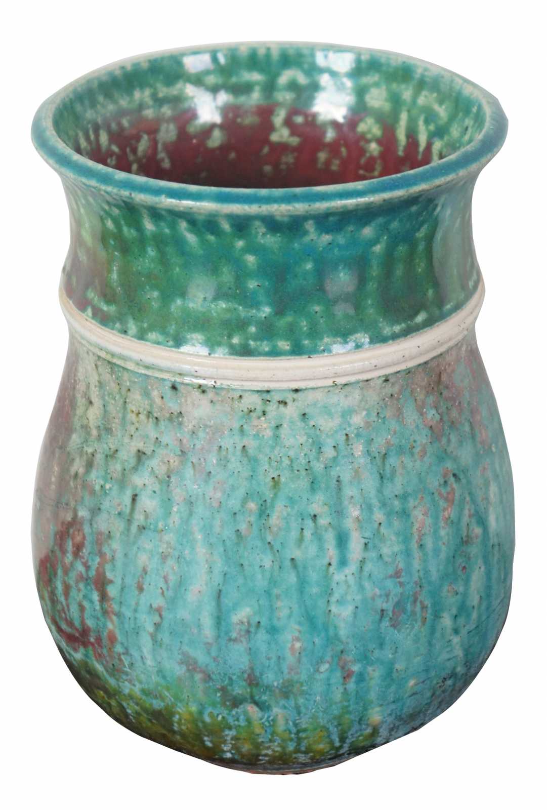 Circa 1991 Stu Wheeler glazed ceramic bud vase. Features a nice multicolor glaze with a band and slightly flaired lip.