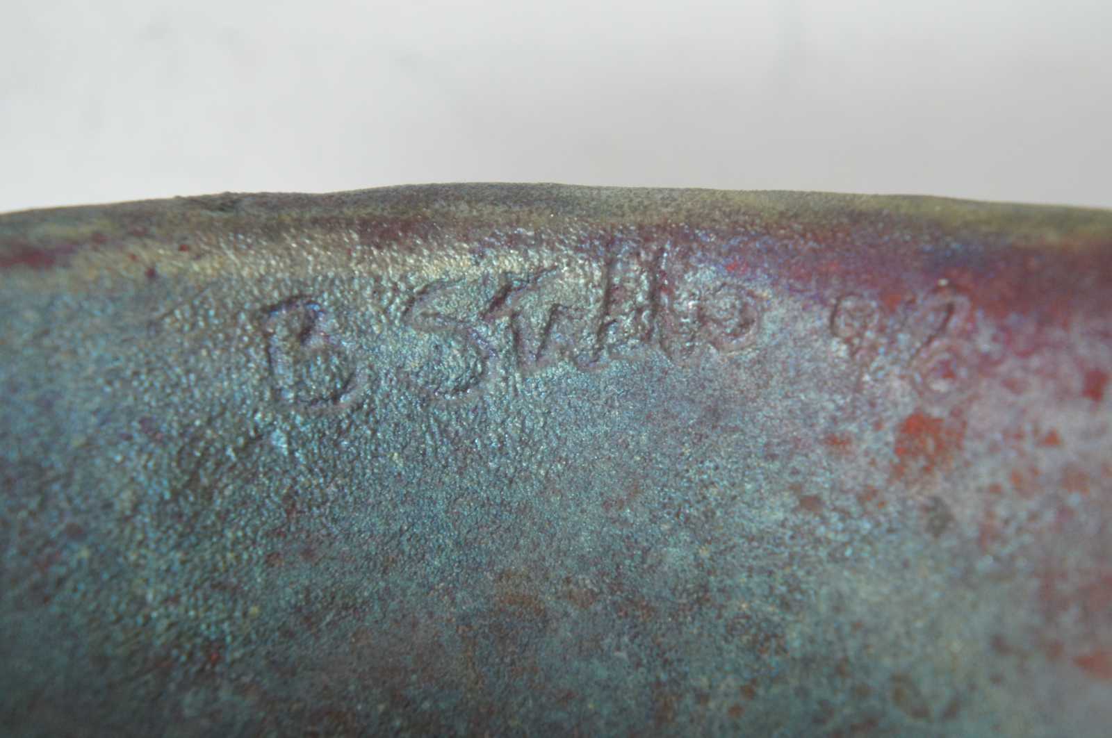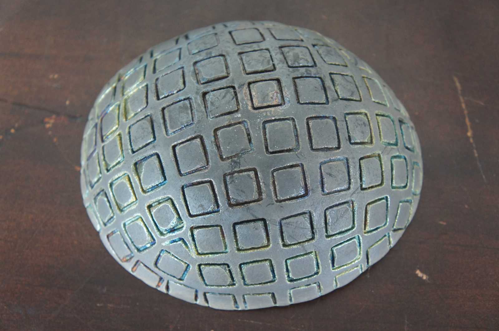 Vintage art pottery bowl and stand. Features an abstract shape and geometric squares on the outside. Comes with stand. Signed and dated.