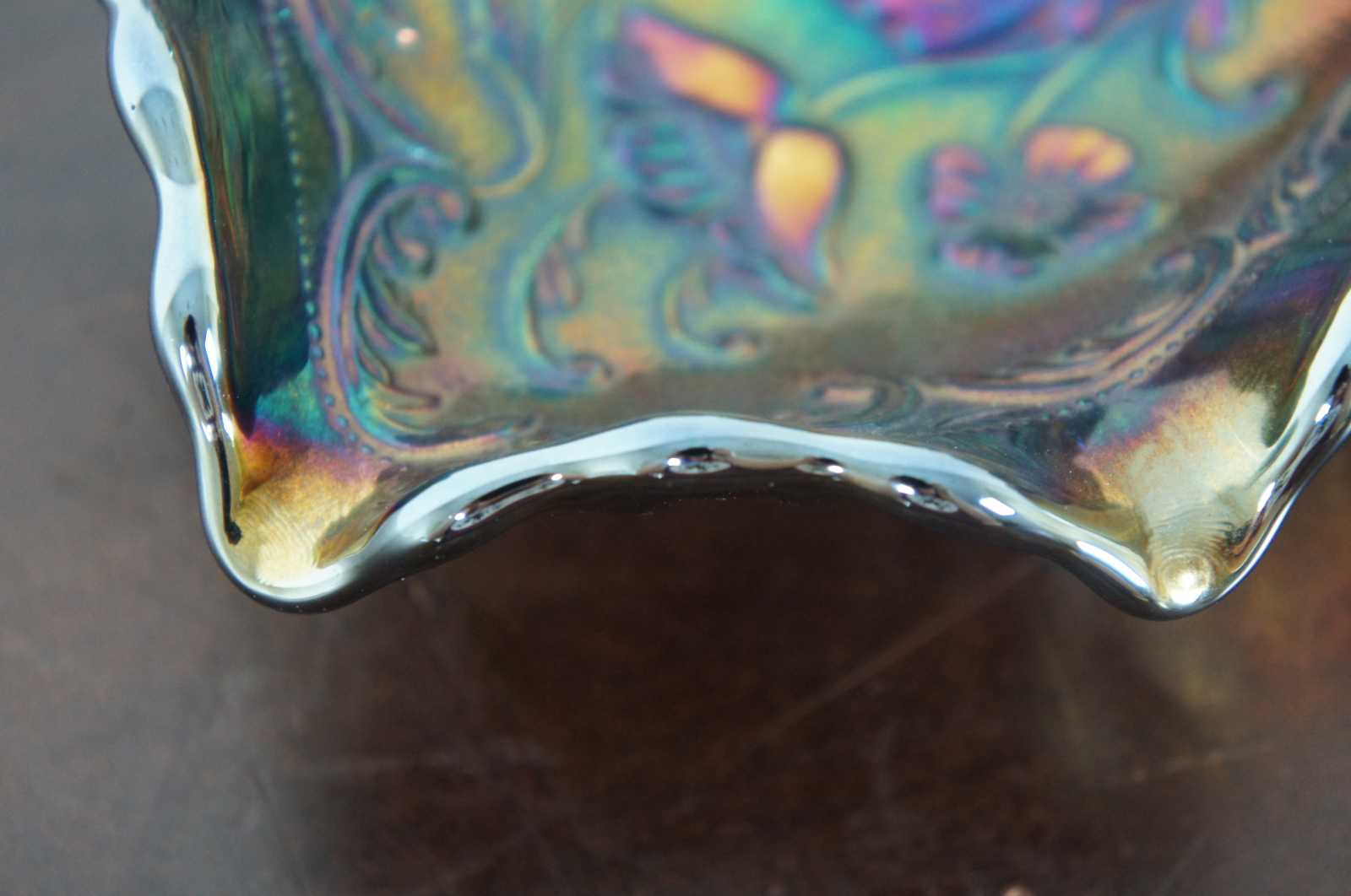 Vintage Fenton iridescent glass dish or bowl. Features multicolor iridescent glas with ruffled edge and footed base. Marked on base.